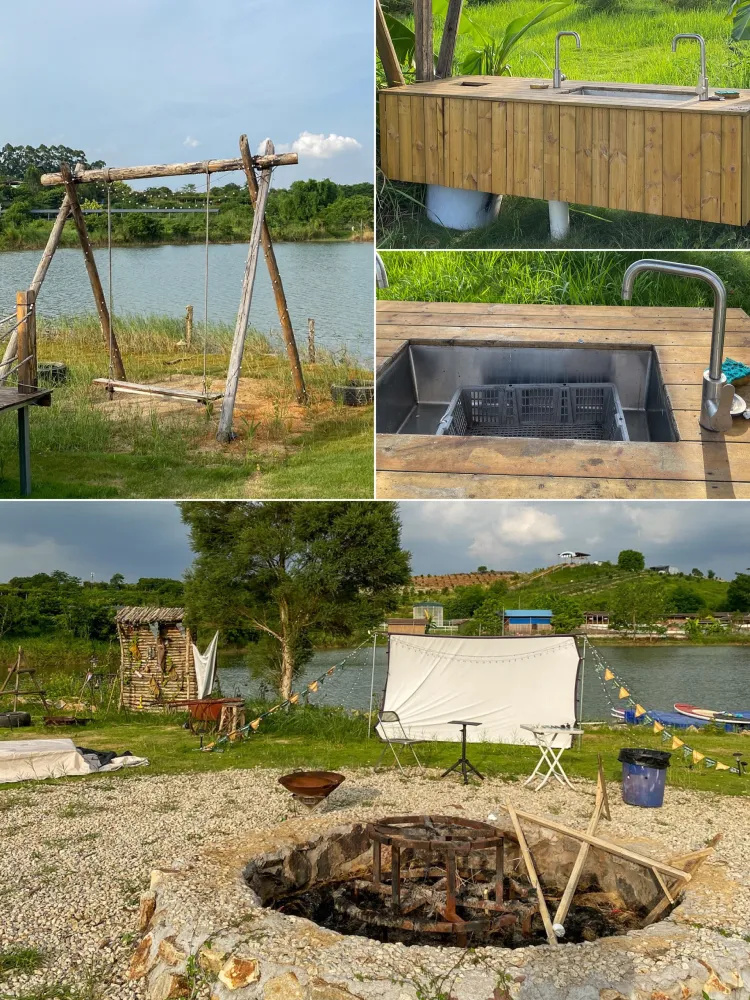 内部景观和谐统一、精致: 帐篷围绕着活动区铺开,活动区内设置了篝火台、秋千、木架
