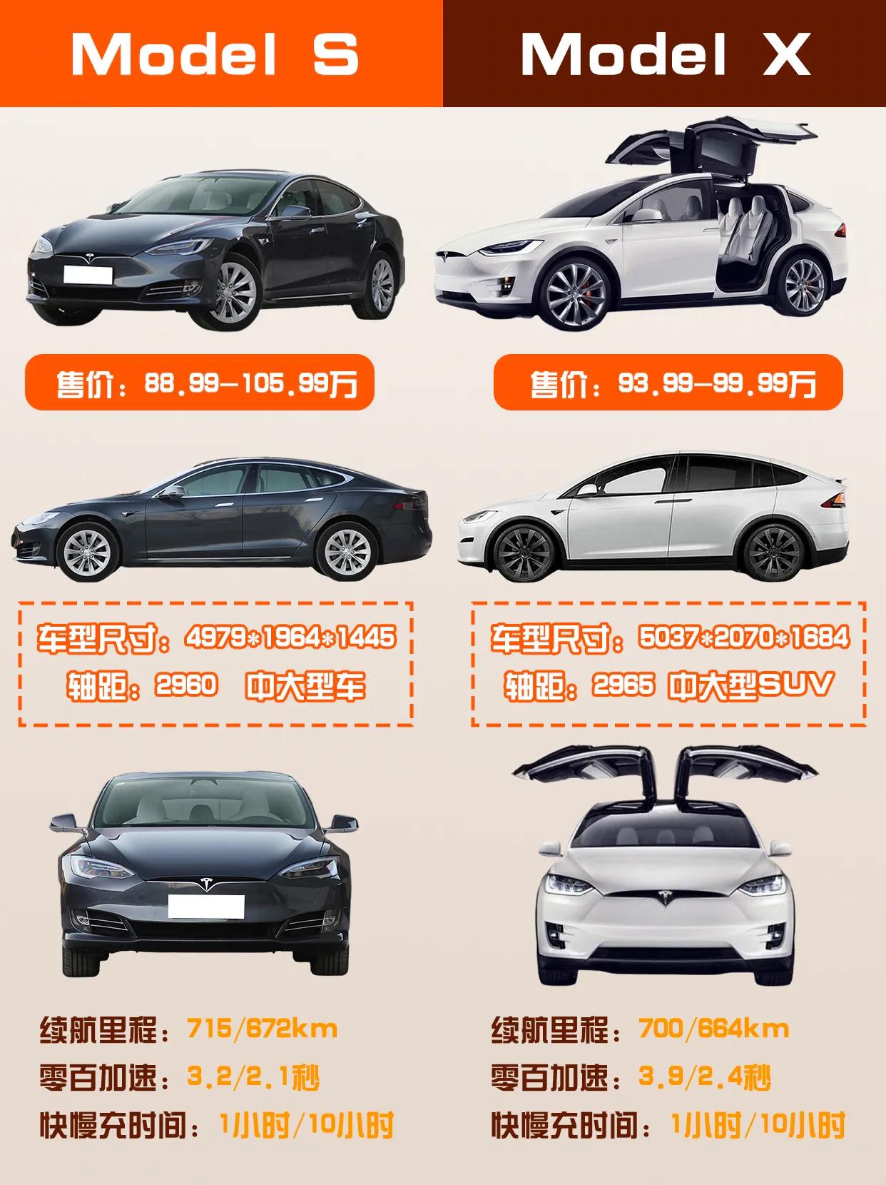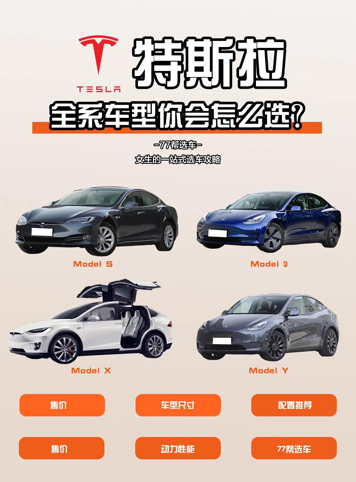 小仙女必看!Tesla车型全解析! 小仙女们,又到了选车的时候了!选车是一件十分重要的事情,毕竟是要买一辆足够实用且适合自己的车,Tesla就是一个很不错的选择。下面我们来一起了解一下Tesla的车型吧! 先来看一下Model 3,这款车被定位于中型车,价格在27.69-34.99万之间,续航里程分别为556-675km,可选的配置比较丰富。建议初次选车的小姐姐选择后轮驱动版,价格比较实惠,而且还自带基础班辅助驾驶功能。如果追求升级加速和性能的话,可以考虑Performance高性能全轮驱动版。 接着是Model S,这款车被定位于中大型车,价格在88.99-105.99万之间,续航里程分别为672-715km。可选的配置也比较丰富,最快的零百加速只需要2.1秒,实在是一款非常酷炫的车。但是价格也比较高,建议有一定经济基础的小姐姐再去考虑购买。 再来看一下Model Y,这款车被定位于中型SUV,价格在29.99-39.79万之间,续航里程为545-660km。可选的配置分为后轮驱动版、长续航全轮驱动版和Performance高性能全轮驱动版。建议以实用为主的小姐姐选择后轮驱动版,毕竟SUV的空间和底盘高度都比较适合女生平日的生活和出行。中高配的车型可以选择追求更高的加速和续航。 最后是Model X,这款车被定位于中大型SUV,价格在93.99-99.99万之间,续航里程分别为700km和664km。最快的零百加速只需要2.6秒,而且还有鸥翼门,非常酷炫!当然,价格也是非常的贵,建议有更丰厚的经济基础再去考虑购买。 综上,选车还是要以实用性为主,毕竟太快的加速并不是每个女孩子都需要的。根据各个车型的定位和配置,可以选择适合自己需求的车型。小姐姐们,现在就去选一款适合自己的Tesla车吧!