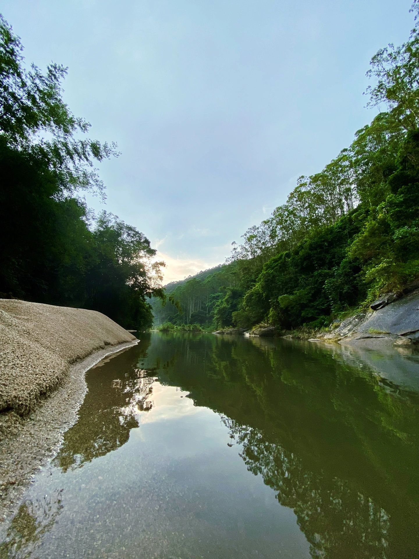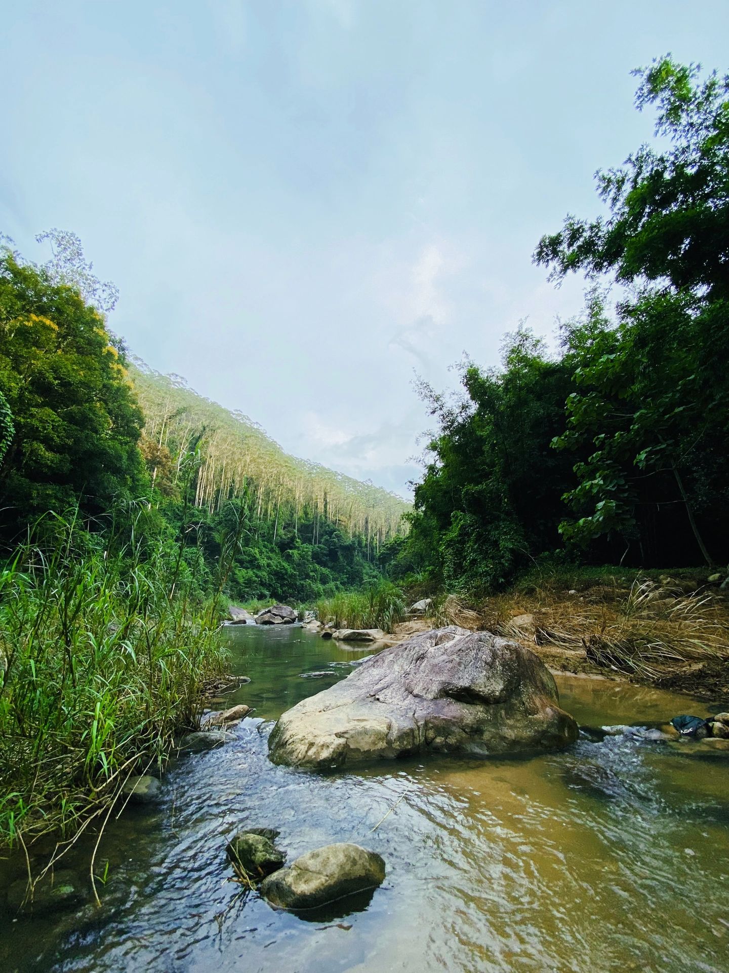 两岸都是🌳树林和竹林,我们都没有搭天幕,注意这里上游信号较弱📶,同行只有一个朋友的手机有信号