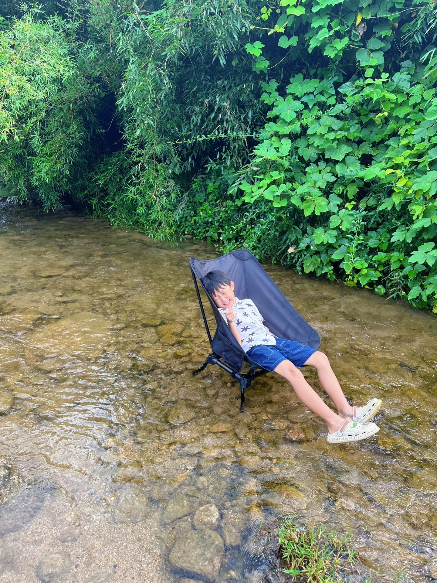 孩子在一旁玩水抓鱼累了就在椅子上休息一下。