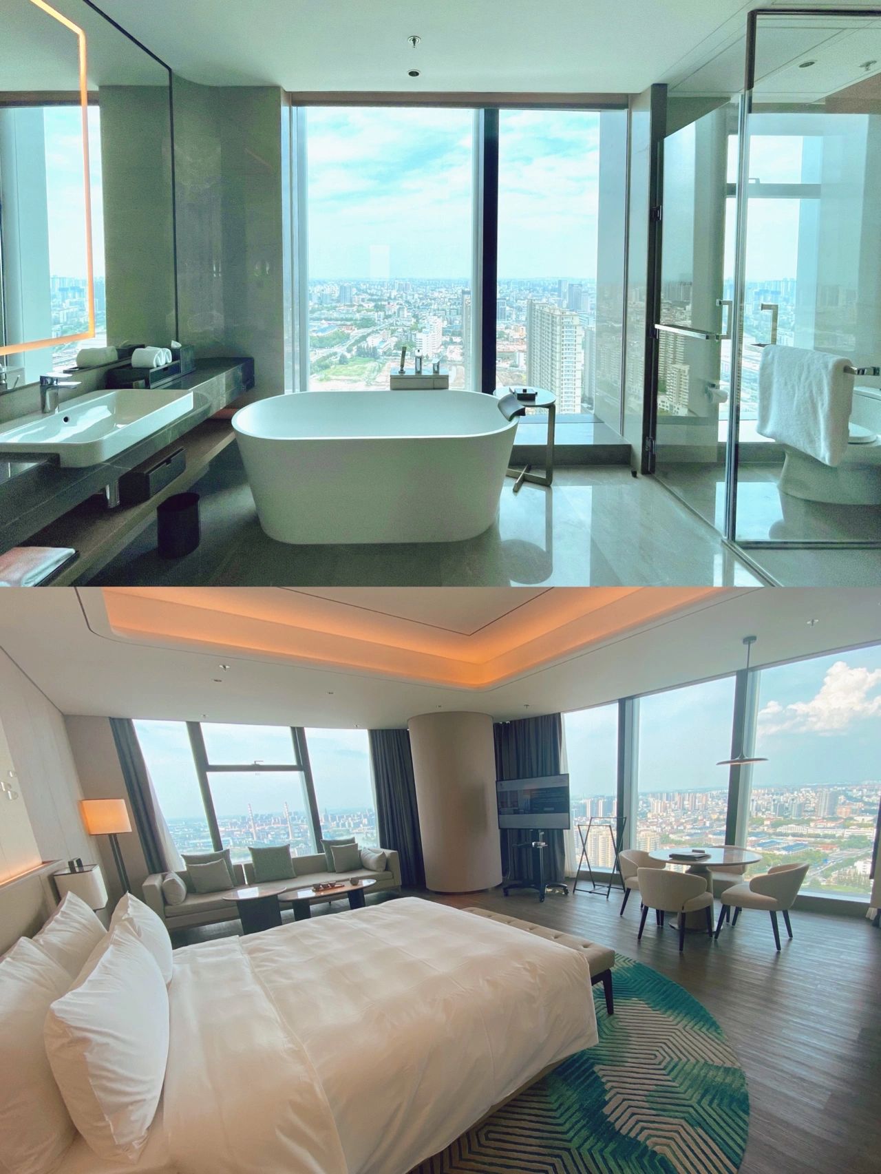 选的新开业不久的盐城万豪酒店,给的35层全景开放式套房,面积超级大,推荐。