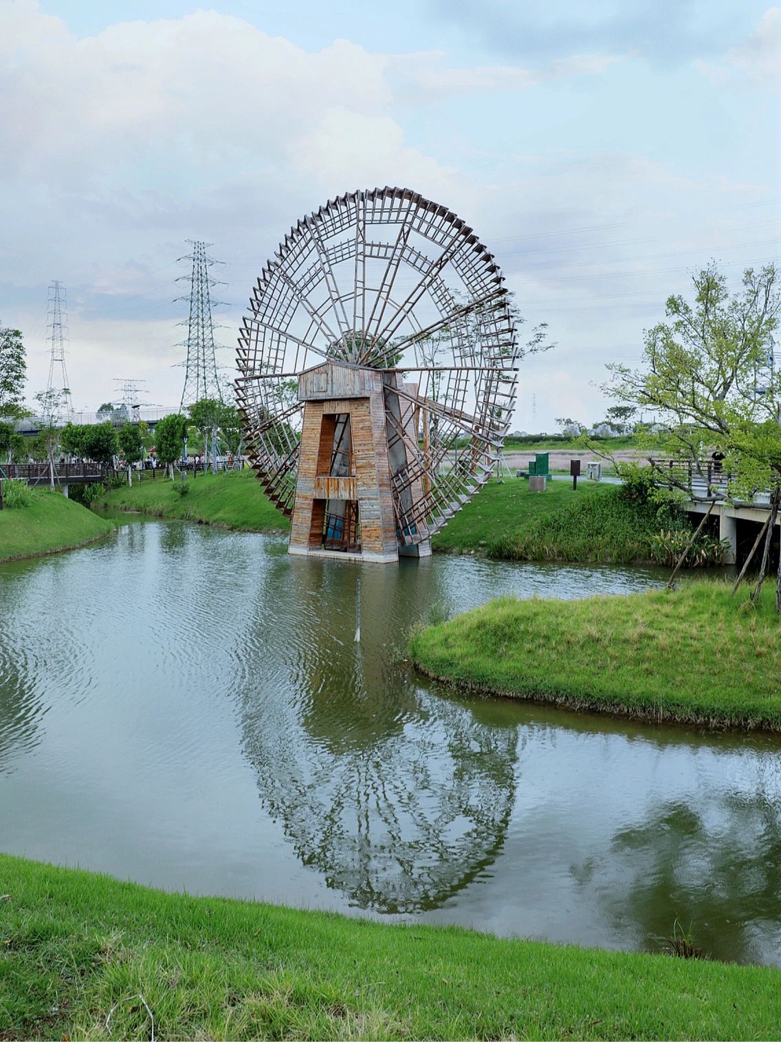 园内有3个湖,木栈道、拱桥、湖心小岛都是拍照好去处,还有个大水车,搭配粉色花海特别好看。