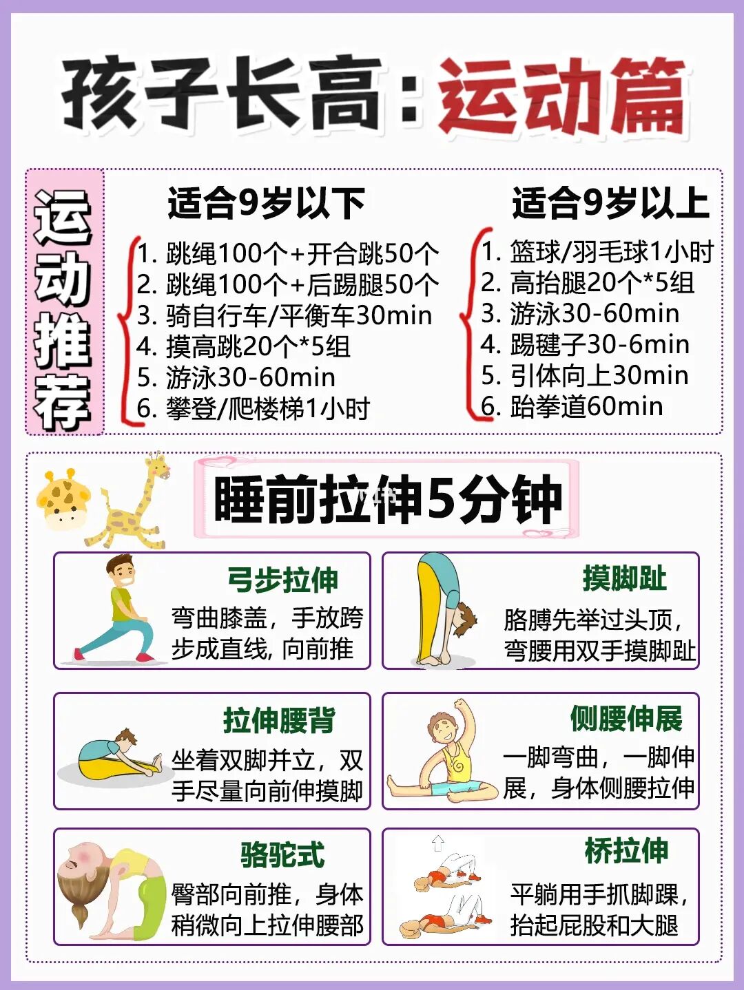 🔸9岁以下适合:跳绳、开合跳、后踢腿、骑车、摸高、游泳、爬楼