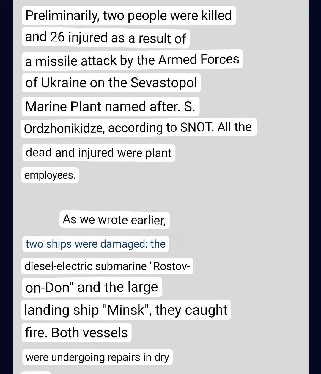 乌军一不小心又创造了一个记录!今天凌晨,被俄罗斯非法占领的克里米亚塞瓦斯托波尔遭到大规模袭击,港口发生剧烈爆炸后燃起大火。刚刚经过确认,除港口设施外,还有两艘正在维修的舰船严重受损,其中一艘是登陆舰“明斯克”号,而另一艘竟然是常规动力潜艇基洛级“罗斯托夫”号!据悉乌军在这次攻击中使用的是经过改装的对陆攻击型“海王星”反舰导弹,而这可能也开创了史上第一次使用反舰导弹攻击潜艇的纪录(话说印度曾经有一艘潜艇被自家导弹击沉过)!乌军自研的“海王星”导弹真是总能带给我们惊喜 ,首次出击就击沉了黑海舰队旗舰“莫斯科”号,第二次出击就摧毁了S400这一世界最“强”防空导弹系统,结果第三次连潜艇都不放过了[捂脸]照这个趋势发展下去,下一次的目标不会就是克里姆林宫了吧