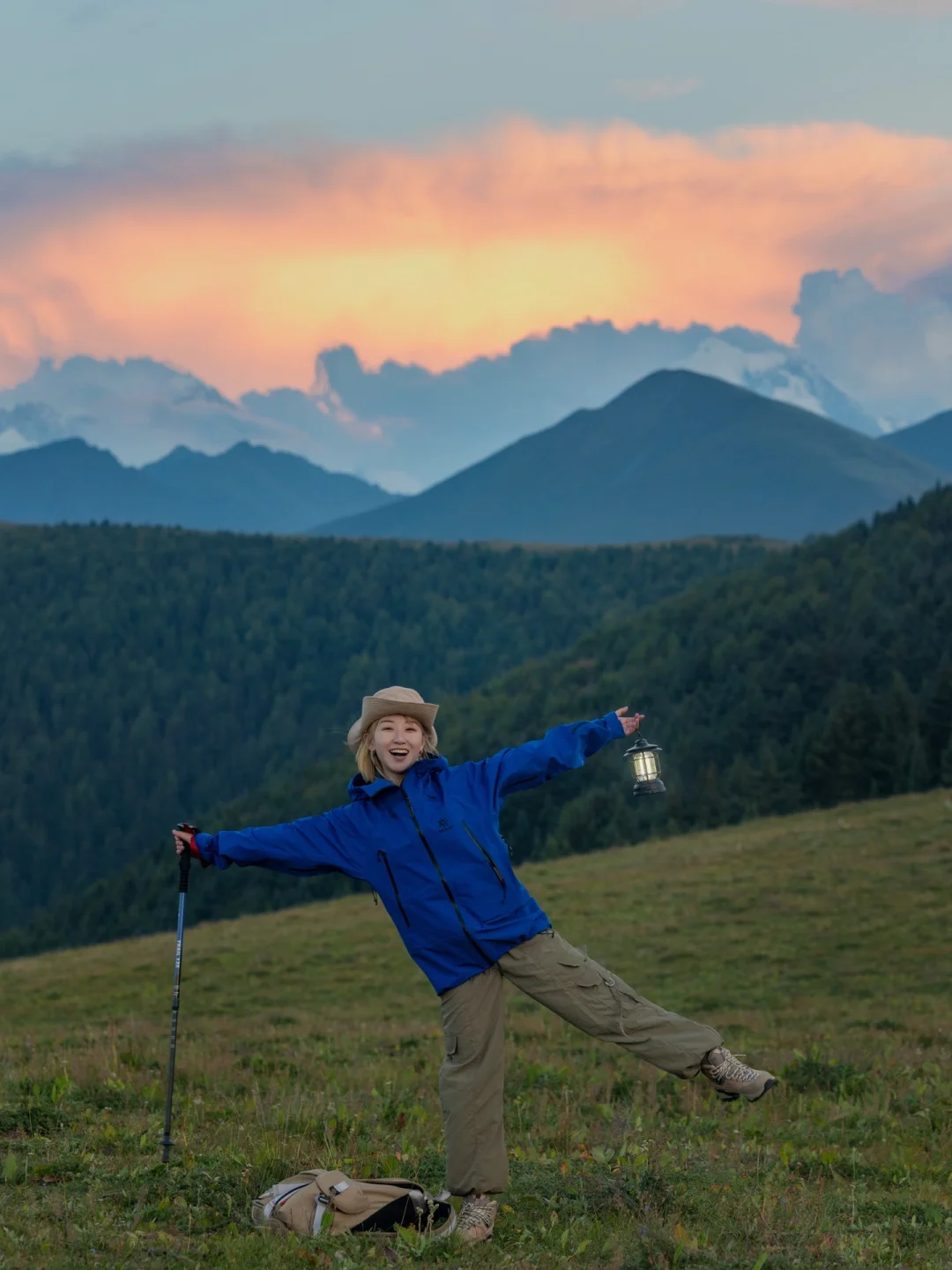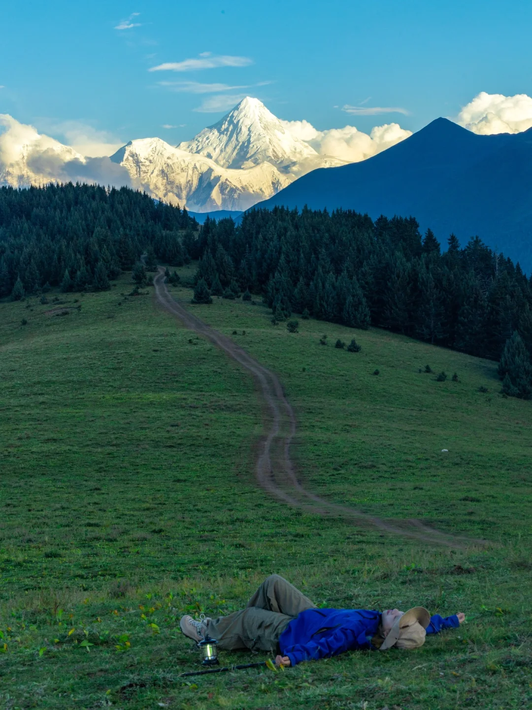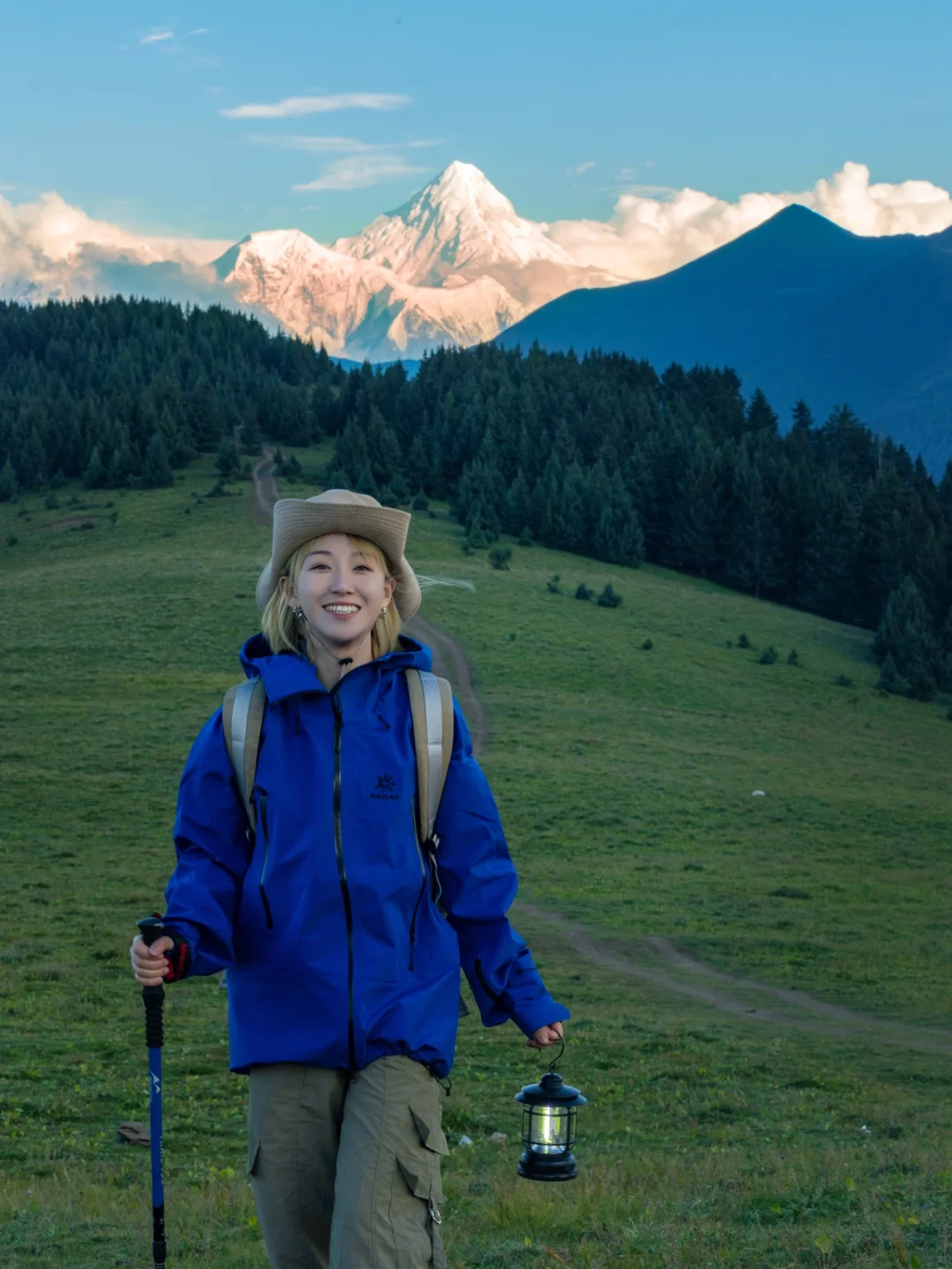 高原天气变化快,一定要准备好一件冲锋衣。这次出行,我穿的凯乐石MONT-X,一天之内经历了大太阳和阴雨天,它都能帮我遮风挡雨。衣服的勒多曼因蓝源于勒多曼因冰川与蓝天交织出的独特色彩,和贡嘎雪山真的好搭,出片氛围感绝绝子!