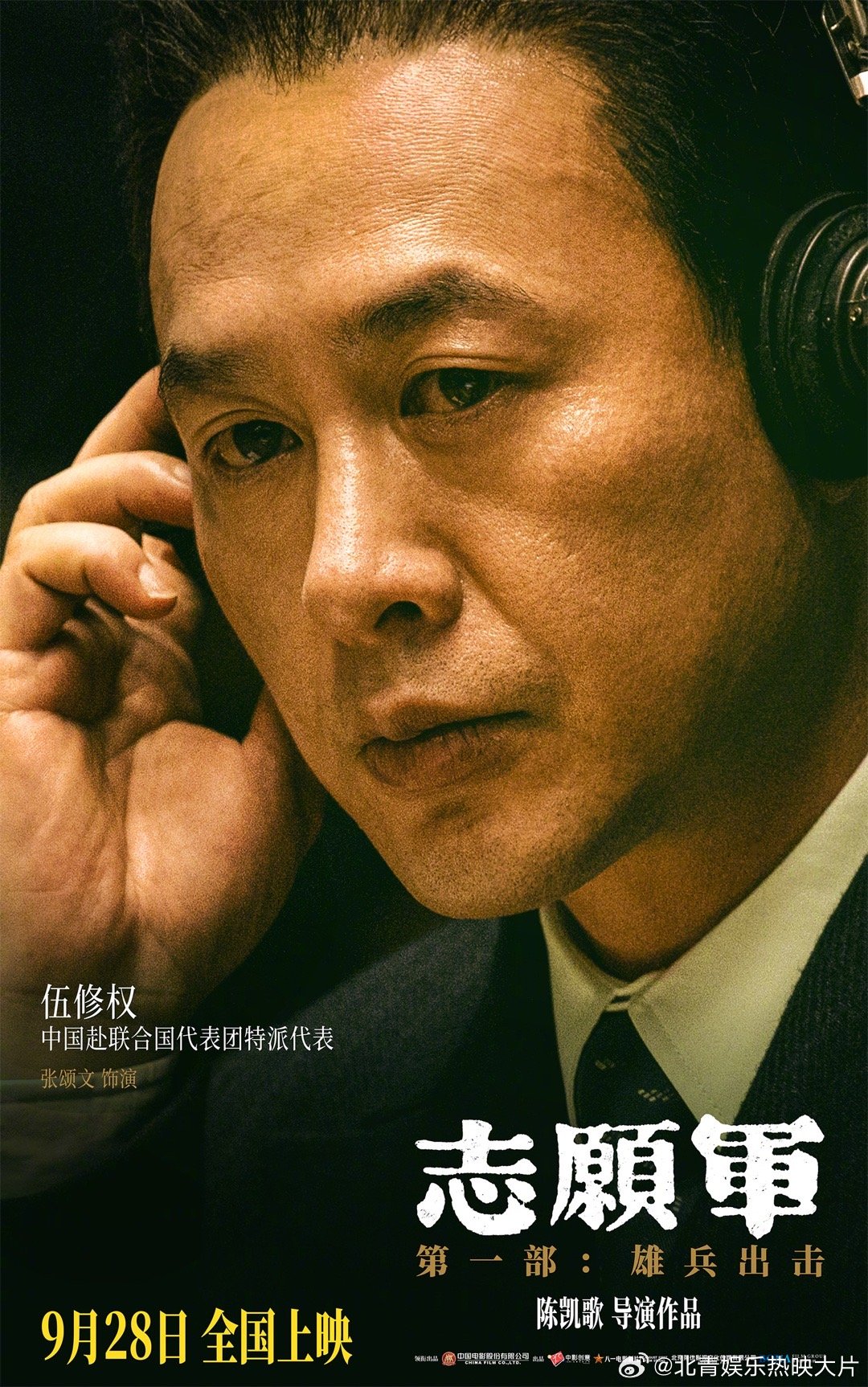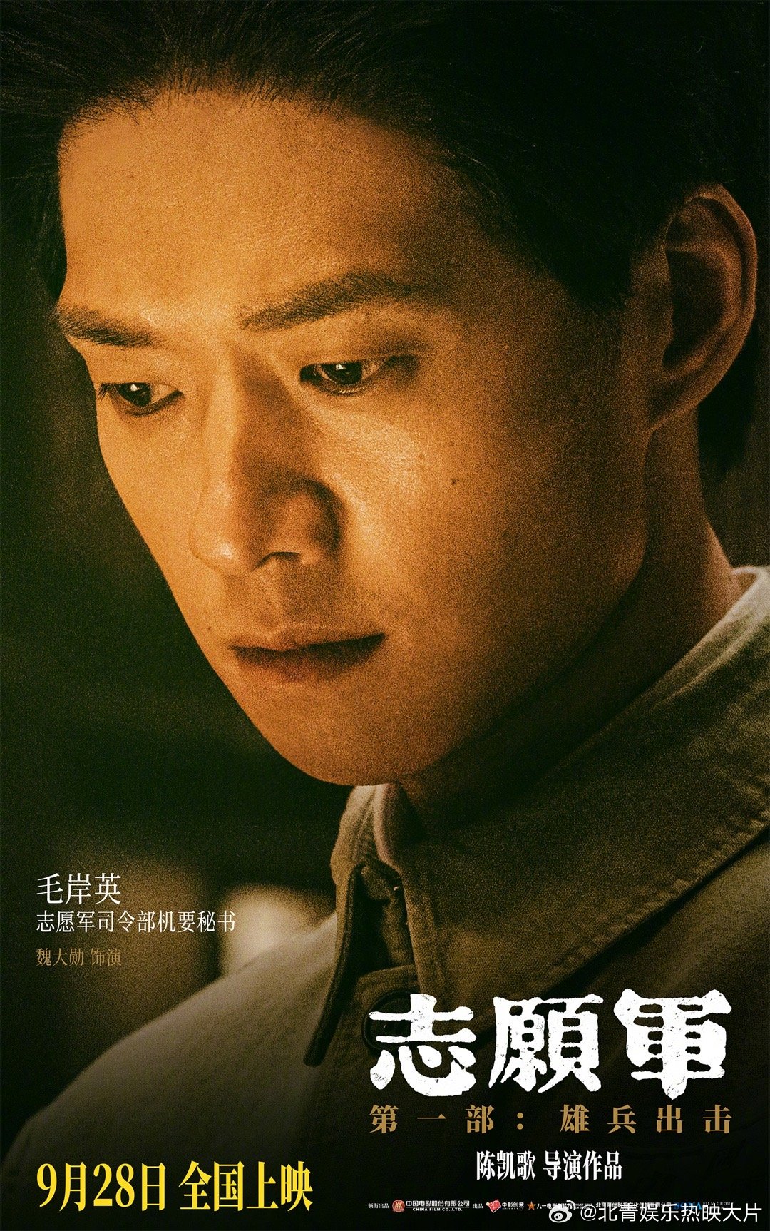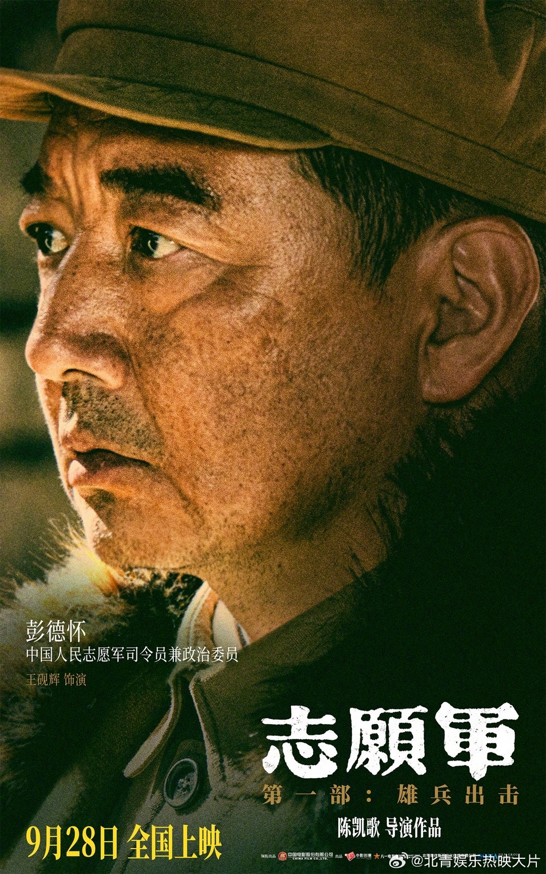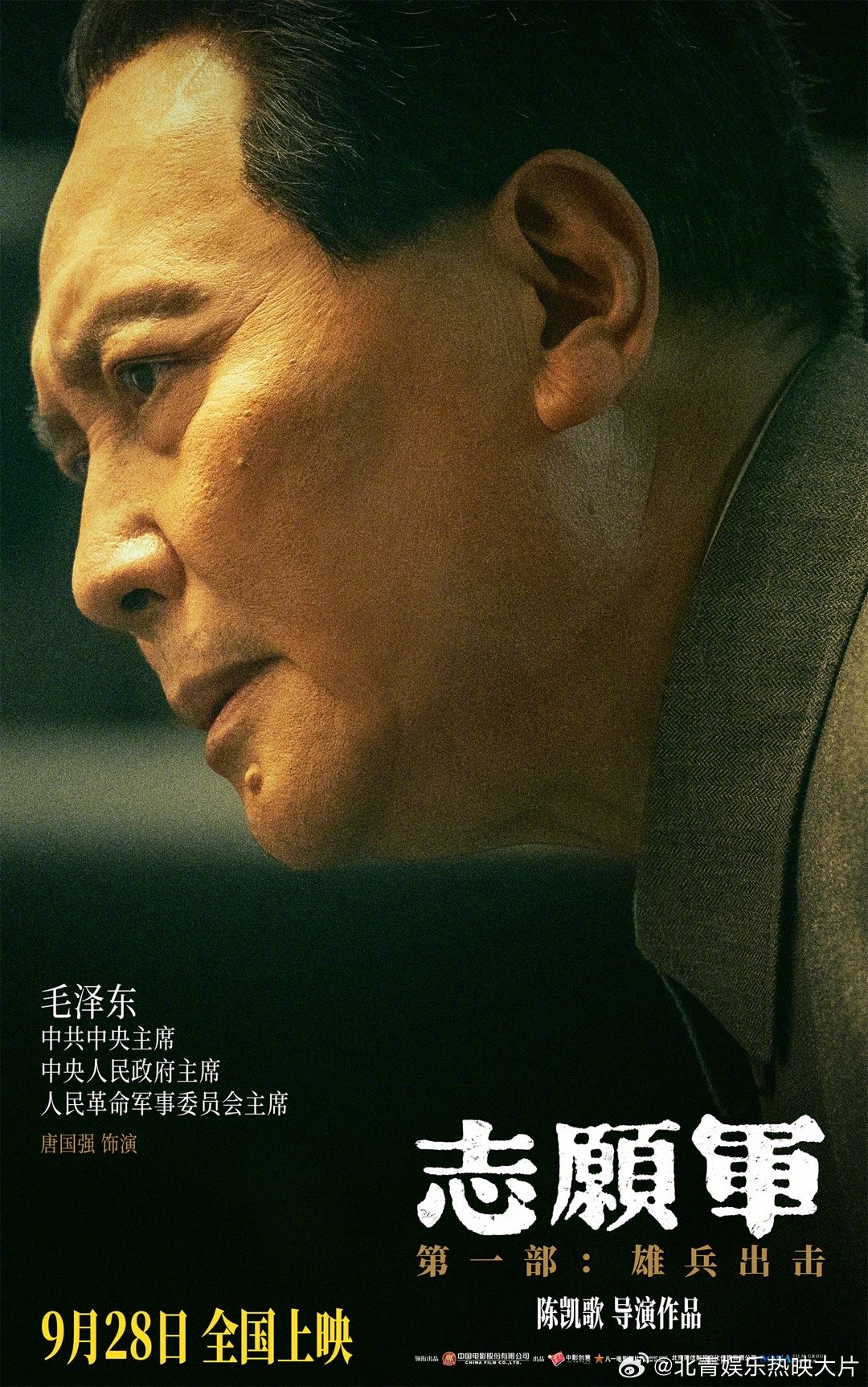 #电影志愿军第一部主要角色官宣#《志愿军》三部曲第一部《志愿军:雄兵出击》发布人物海报。毛泽东(唐国强 饰)、彭德怀(王砚辉 饰)、周恩来(刘劲 饰)等17位第一部主要演员曝光。影片由陈凯歌执导,将于9月28日全国上映,在抗美援朝战争胜利70周年之际,向志愿军英雄致敬。#电影志愿军人物海报故事感#