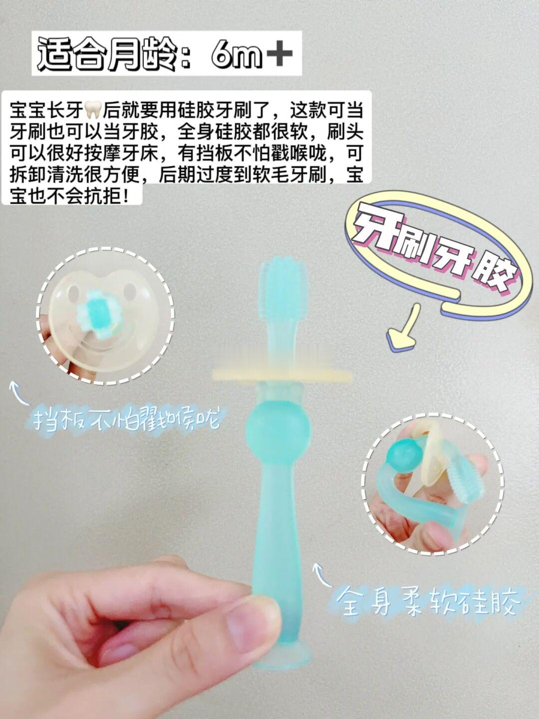 宝宝出牙后就要用硅胶牙刷啦,这种牙刷的比纱布、指套刷的更全面,边边角角都能刷到[赞R],牙刷的整体很软,有挡板避免戳到喉咙很贴心,底部是吸盘,放哪里都行。