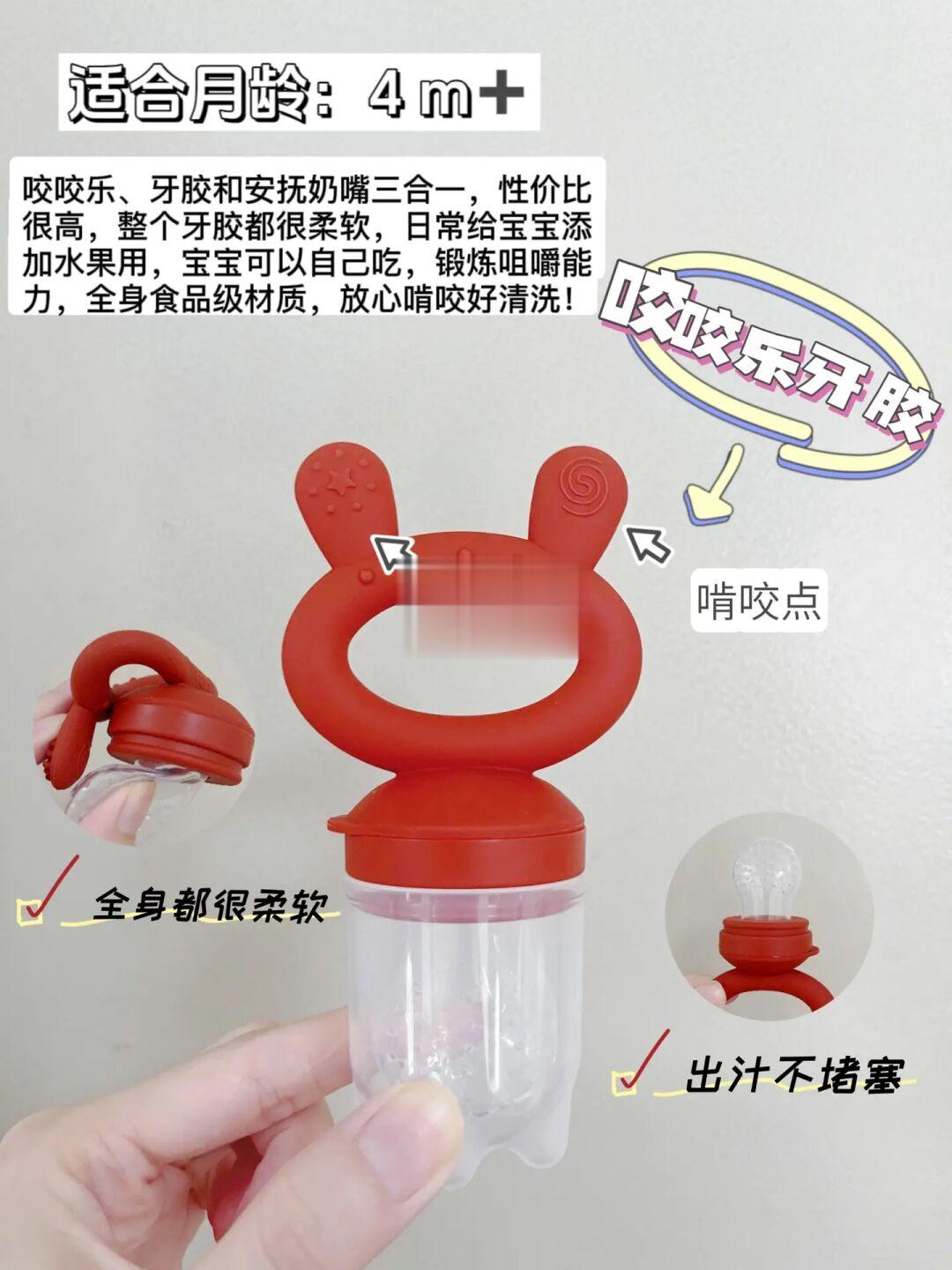 开始给宝宝吃的辅食添加水果后就可以开始用了,这个是牙胶和咬咬乐一体的[赞R],咬咬乐这头很好出汁,锻炼宝宝的抓握能力和咀嚼能力[斜眼R],牙胶这头有2处啃咬点,前后2面还不同。