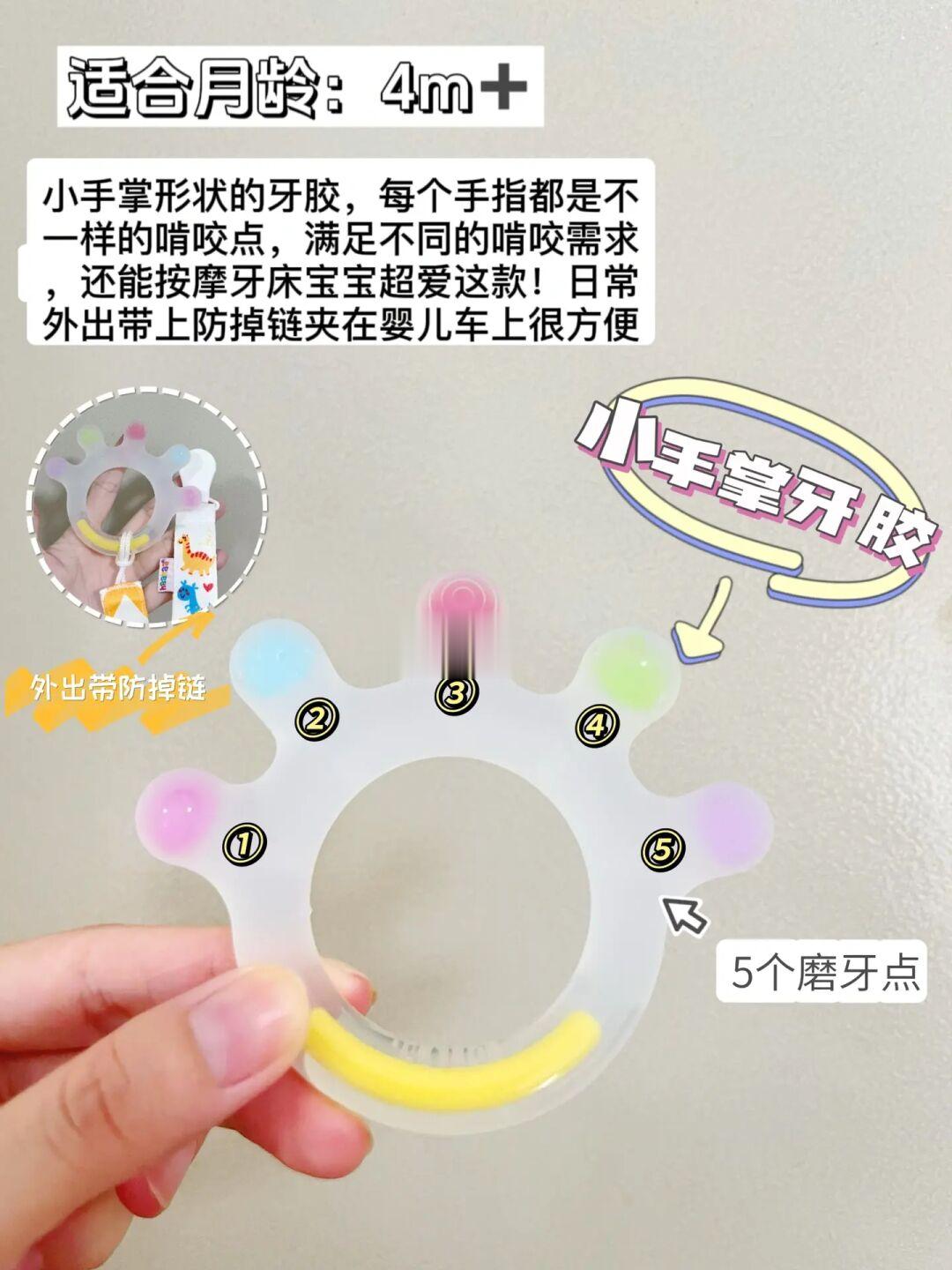 这是个小手掌形状的牙胶,手指上是不同颜色的啃咬点,能满足不同的啃咬需求,按摩牙床很不戳。很好抓握,第一次丢给宝宝就爱上了[哇R],用上他们家的防掉链,不用捡来捡去[暗中观察R]