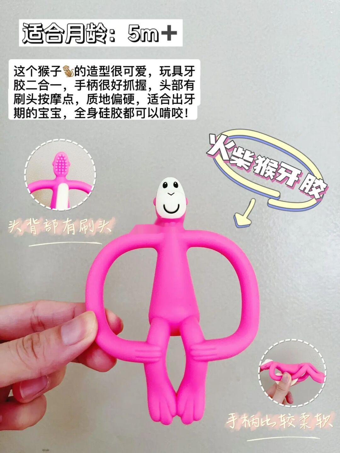 这个猴子的造型,颜色也很鲜艳,我家宝宝还是挺喜欢的,手柄很细很软,好抓握,头部背后有刷头,唯一的是我家不会用这来清洁口腔,这个会有点容易藏脏东西,这个不是很实用[暗中观察R]