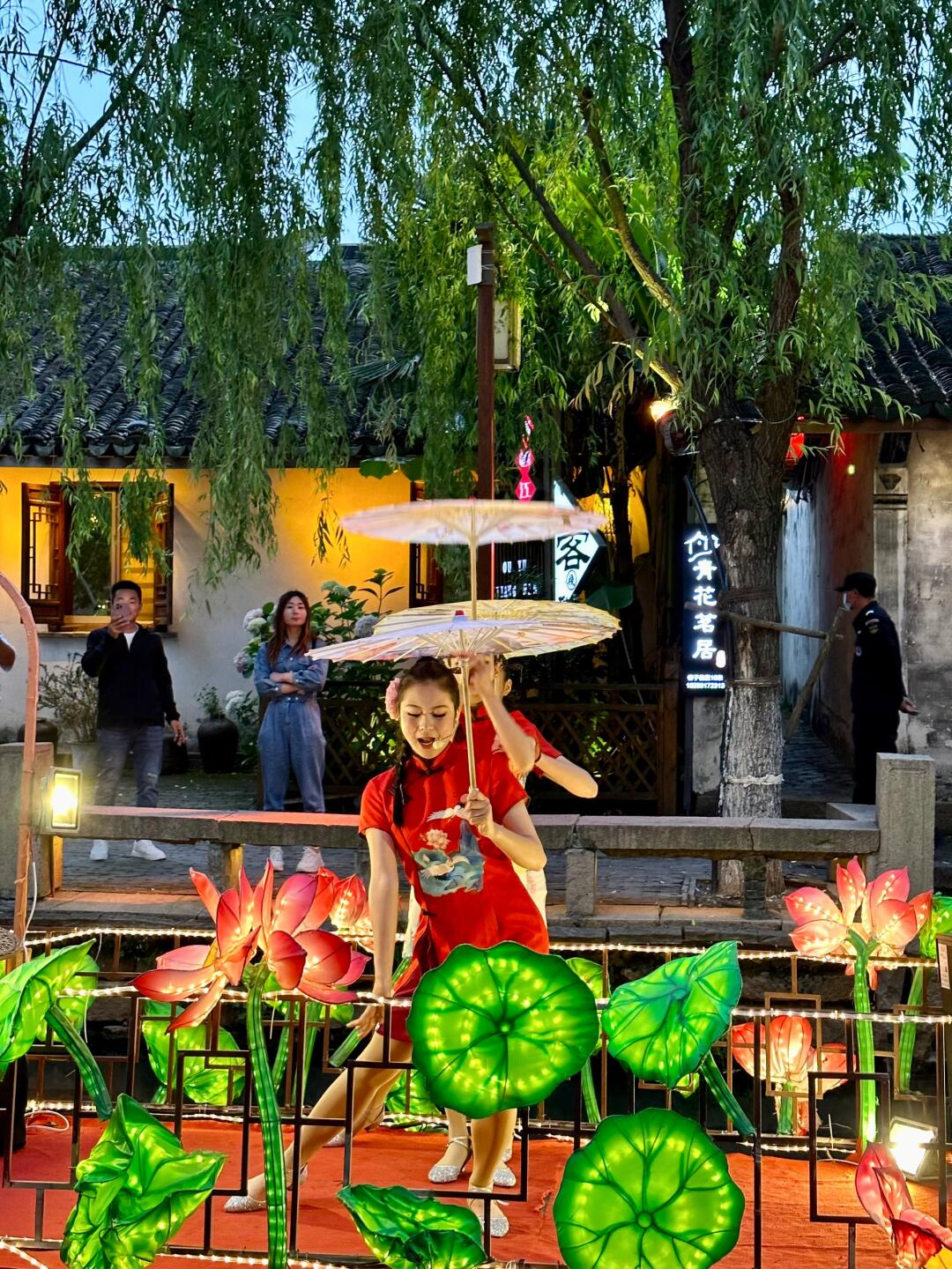 周庄的夜景非常美,华灯初上,有烂漫的花巷、沉浸式的光影秀,在博物馆外面还有水上表演,时间充足的可以再去看《四季周庄》的实景演出。