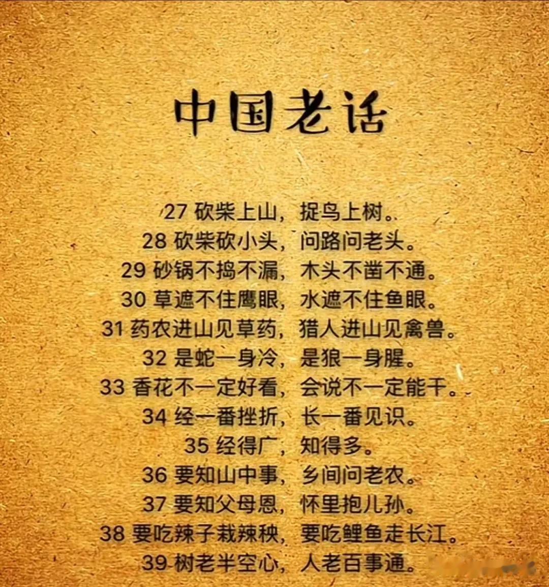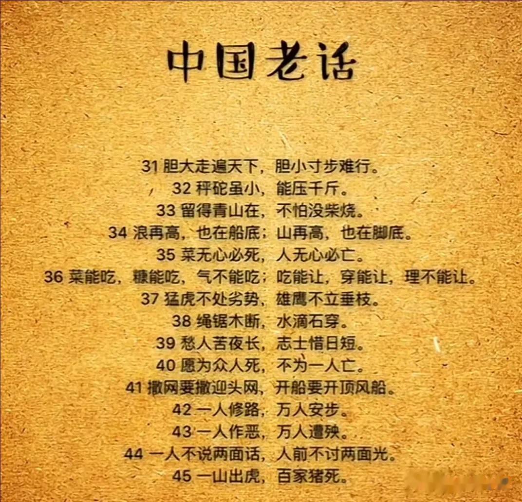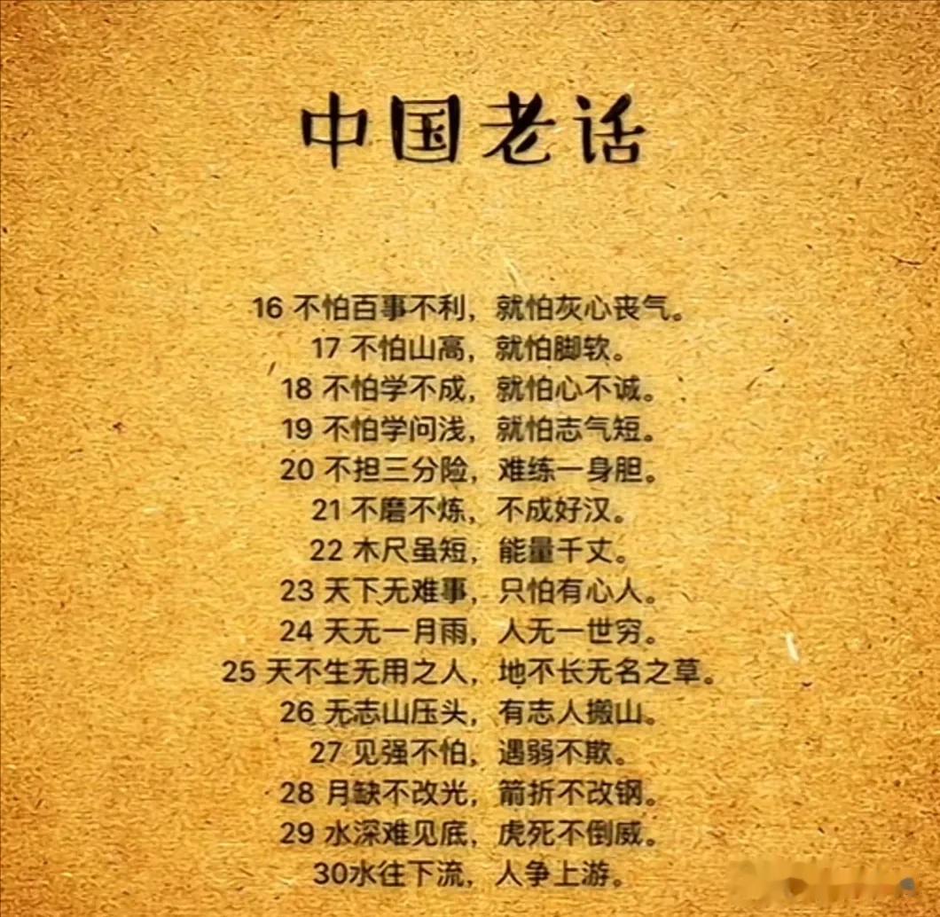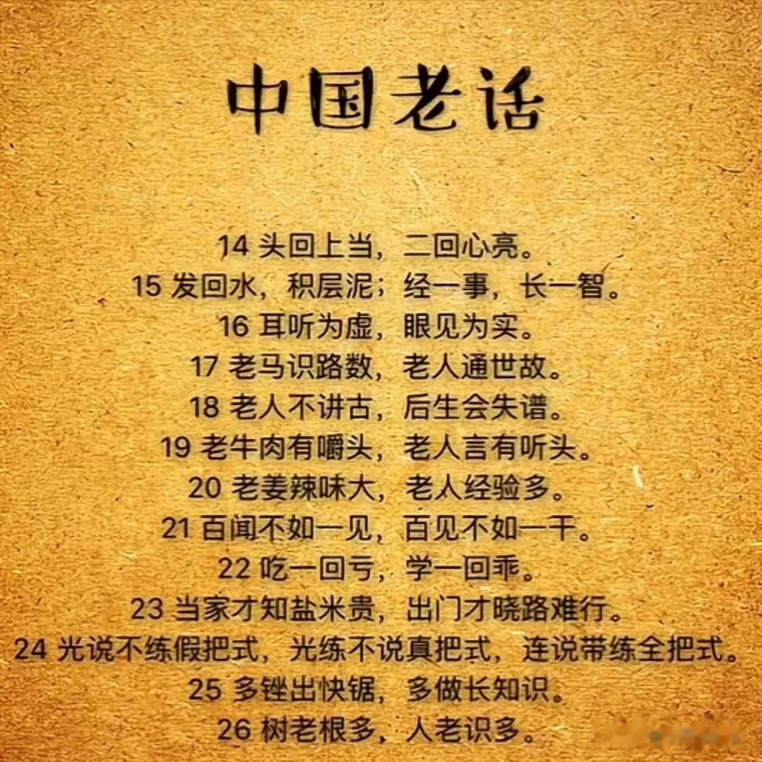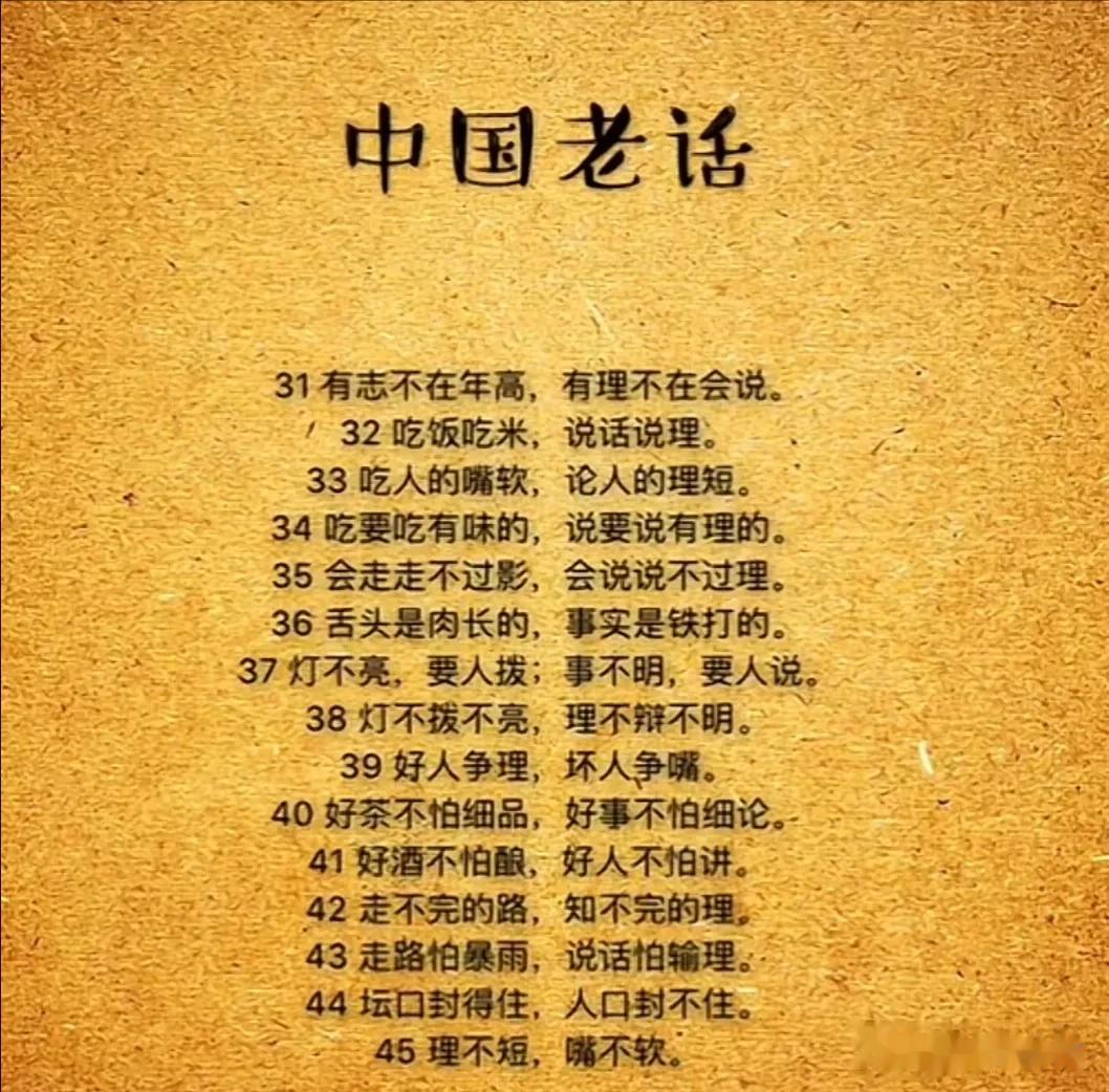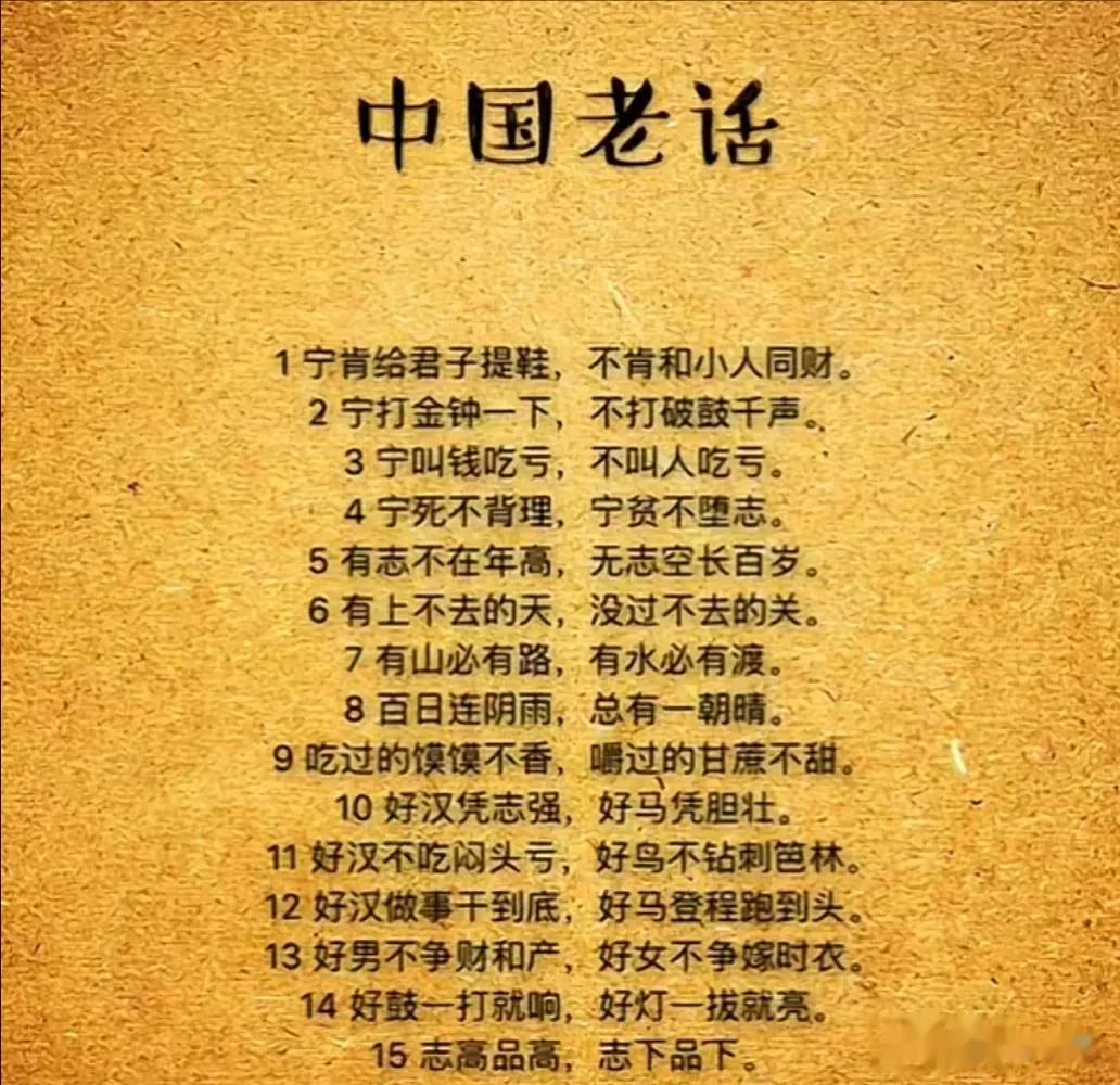 中国老话俗语集锦 千学不如一看,千看不如一练。 老马识路数,老人通世故。 老人不讲古,后生会失谱。 不经冬寒,不知春暖。 不挑担子不知重,不走长路不知远。 让人一寸,得理一尺。 有理说实话,没理说蛮话。 吃饭吃米,说话说理。 吃人的嘴软,论人的理短。 天下无难事,只怕有心人。 天无一月雨,人无一世穷。 三百六十行,行行出状元。 山高有攀头,路远有奔头。 …… 不愧是老祖宗留下来的经典老话,看完真的是涨知识了,难怪会广为流传,真是话糙理不糙,句句经典又在理,道出人生哲理,没有比这更专业更贴心的总结了!让孩子也读一读这些老人言,不仅能积累写作素材,还能懂得为人处世的智慧,受益一生! 让你受益一生的老话
