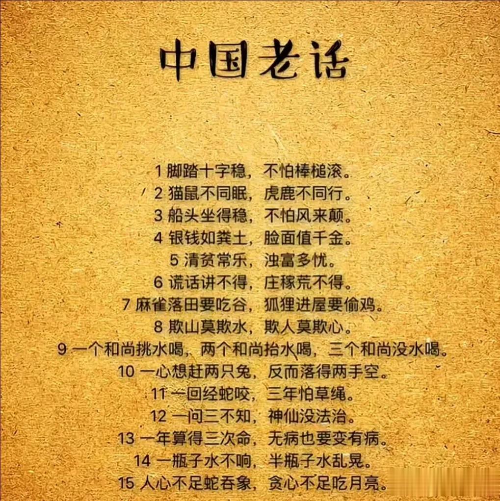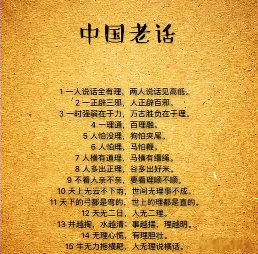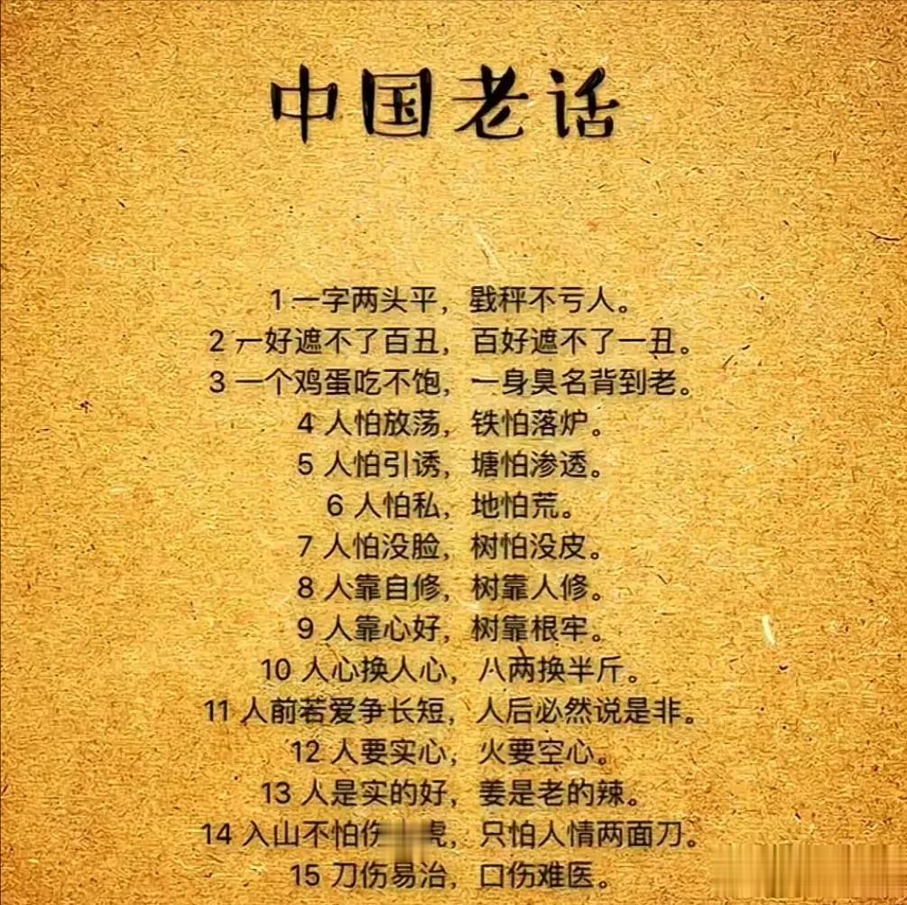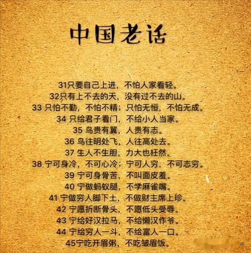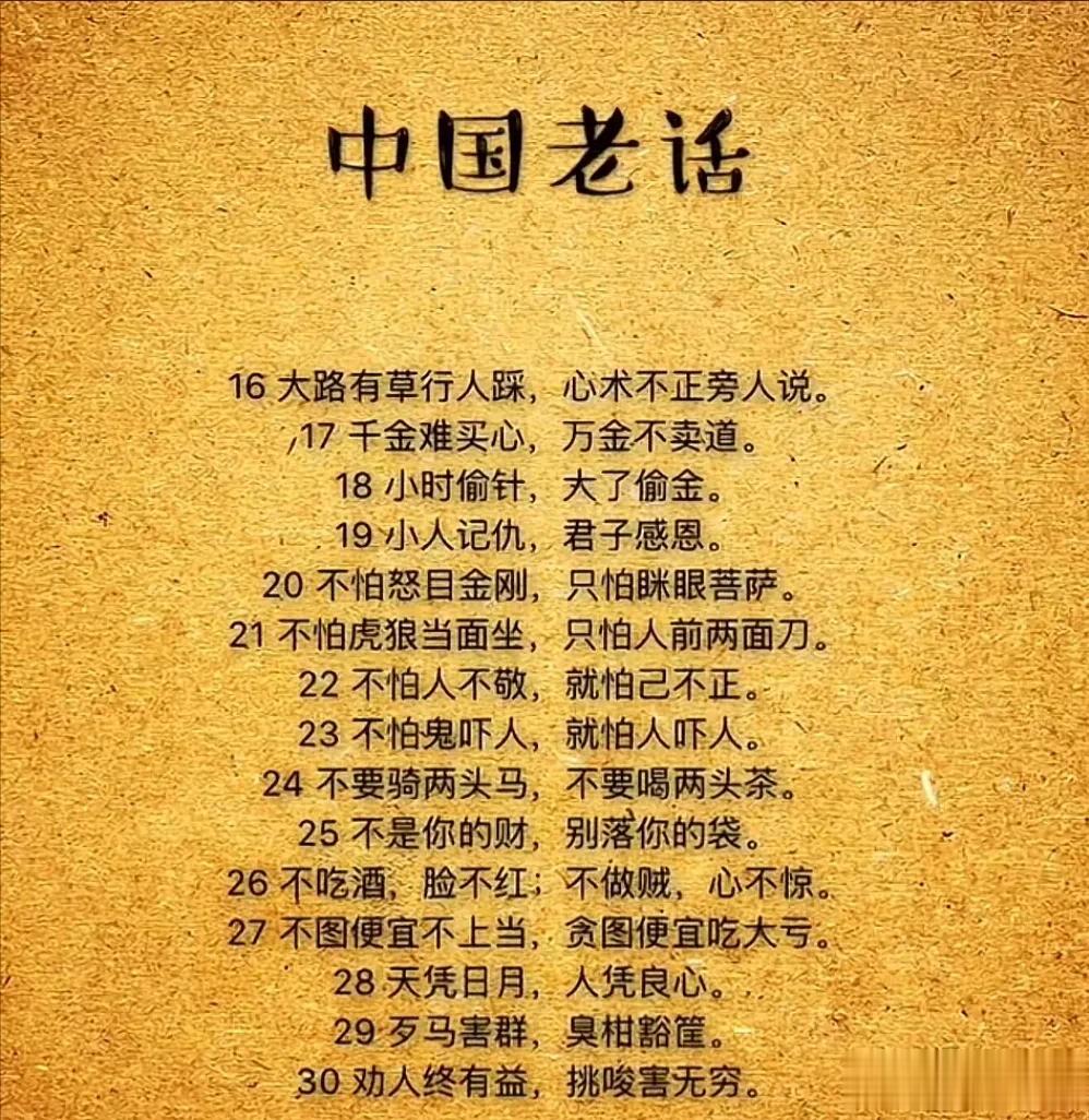中国老话俗语集锦 千学不如一看,千看不如一练。 老马识路数,老人通世故。 老人不讲古,后生会失谱。 不经冬寒,不知春暖。 不挑担子不知重,不走长路不知远。 让人一寸,得理一尺。 有理说实话,没理说蛮话。 吃饭吃米,说话说理。 吃人的嘴软,论人的理短。 天下无难事,只怕有心人。 天无一月雨,人无一世穷。 三百六十行,行行出状元。 山高有攀头,路远有奔头。 …… 不愧是老祖宗留下来的经典老话,看完真的是涨知识了,难怪会广为流传,真是话糙理不糙,句句经典又在理,道出人生哲理,没有比这更专业更贴心的总结了!让孩子也读一读这些老人言,不仅能积累写作素材,还能懂得为人处世的智慧,受益一生! 让你受益一生的老话