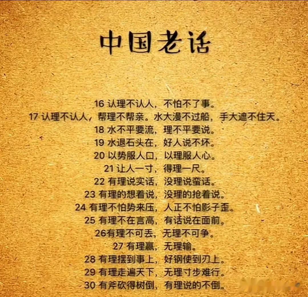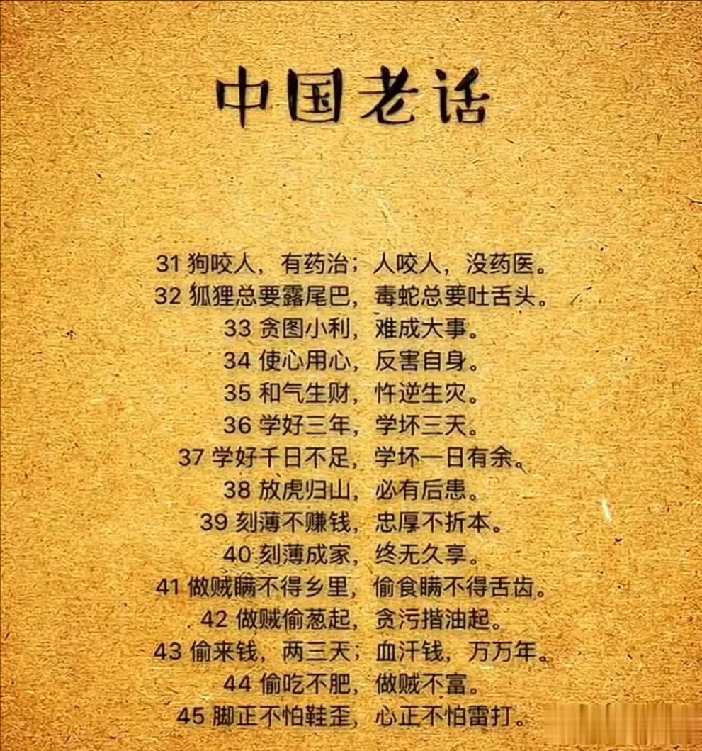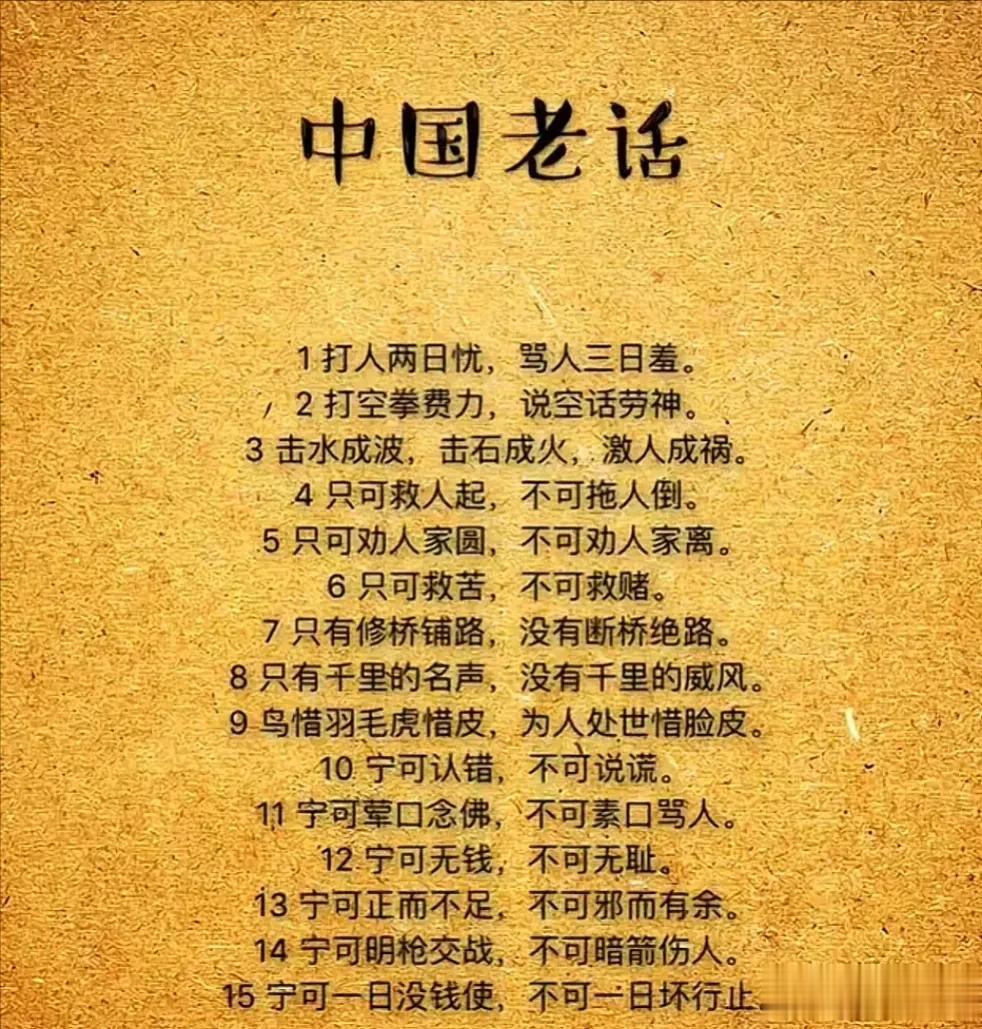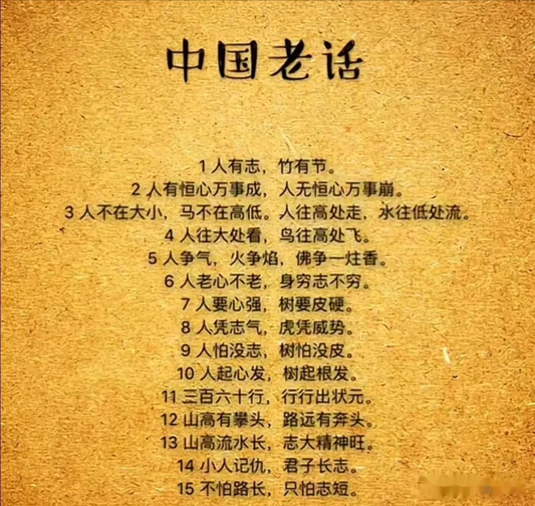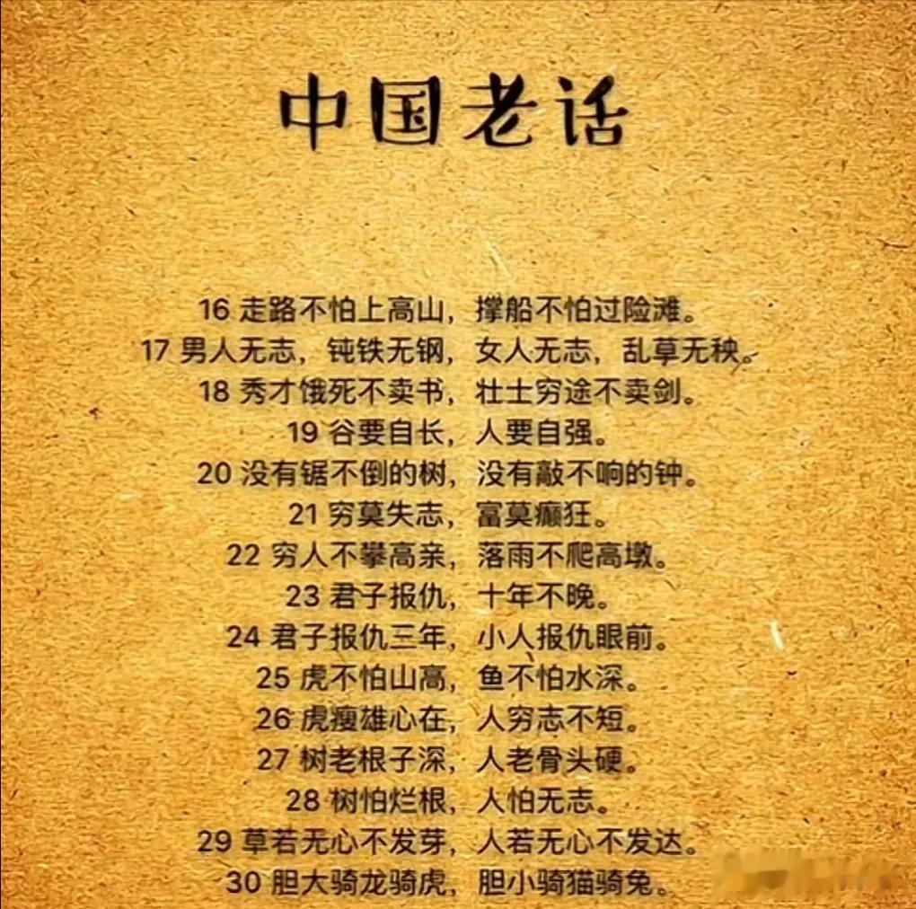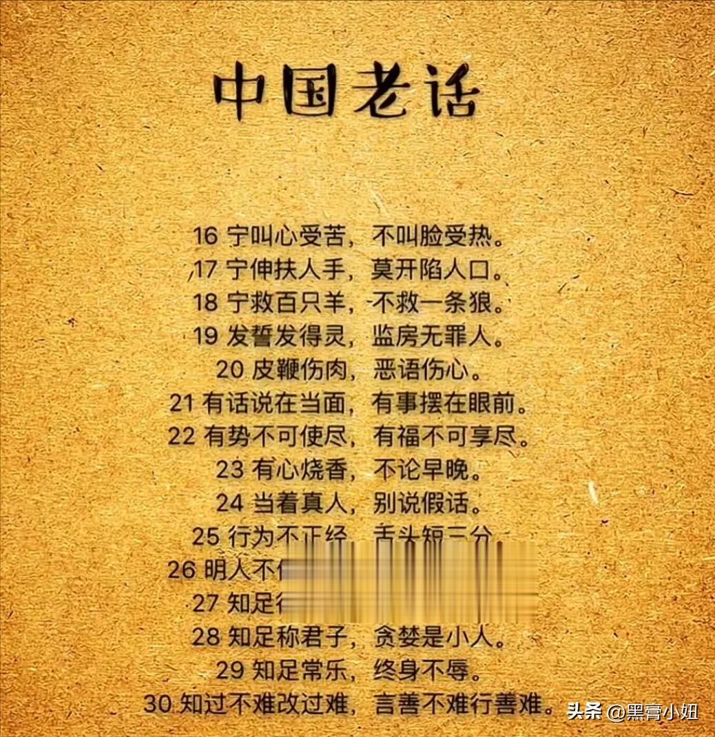 中国老话俗语集锦 千学不如一看,千看不如一练。 老马识路数,老人通世故。 老人不讲古,后生会失谱。 不经冬寒,不知春暖。 不挑担子不知重,不走长路不知远。 让人一寸,得理一尺。 有理说实话,没理说蛮话。 吃饭吃米,说话说理。 吃人的嘴软,论人的理短。 天下无难事,只怕有心人。 天无一月雨,人无一世穷。 三百六十行,行行出状元。 山高有攀头,路远有奔头。 …… 不愧是老祖宗留下来的经典老话,看完真的是涨知识了,难怪会广为流传,真是话糙理不糙,句句经典又在理,道出人生哲理,没有比这更专业更贴心的总结了!让孩子也读一读这些老人言,不仅能积累写作素材,还能懂得为人处世的智慧,受益一生! 让你受益一生的老话