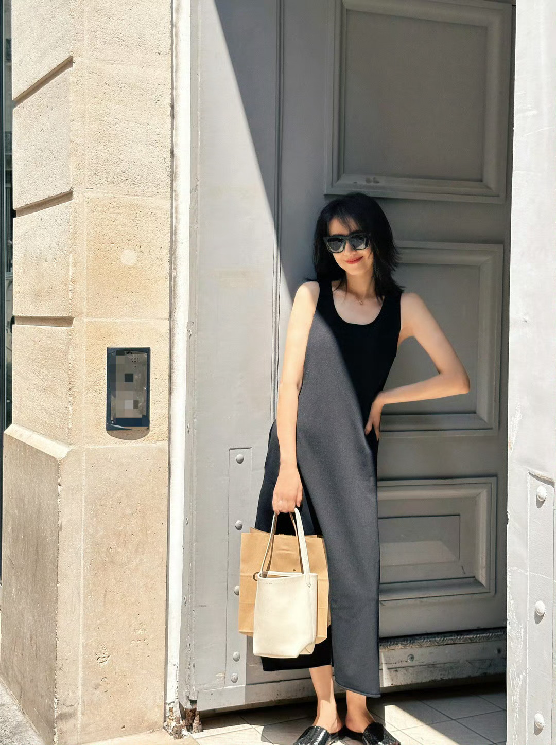 整体搭配采用材质与风格混搭,黑色亮面夹克酷飒,水墨印花裙雅致,再以同色系包包呼应