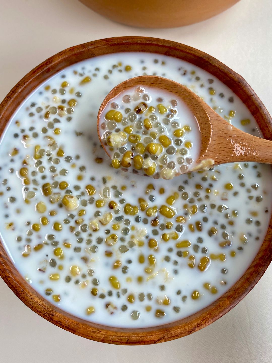 4⃣️绿豆煮出沙后放入冰糖和煮好的西米,兑入牛奶搅拌均匀就可以啦~