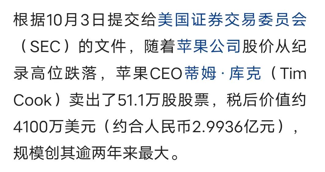 苹果CEO库克现在为什么要拋股票套现3个亿? ①库克不看好苹果未来的前景 ②苹果这几年没啥创新,口碑越来越差,库克都明白 ③新款苹果15出现很多质量问题,口碑持续下跌,库克也明白 ④华为已度过芯片难关,苹果接下来只会越来越难 ⑤华尔街都撤资不看好苹果了 ⑥现在不拋股票,等到明年华为“纯生态”鸿蒙系统和鸿蒙PC端系统出来,就没机会了