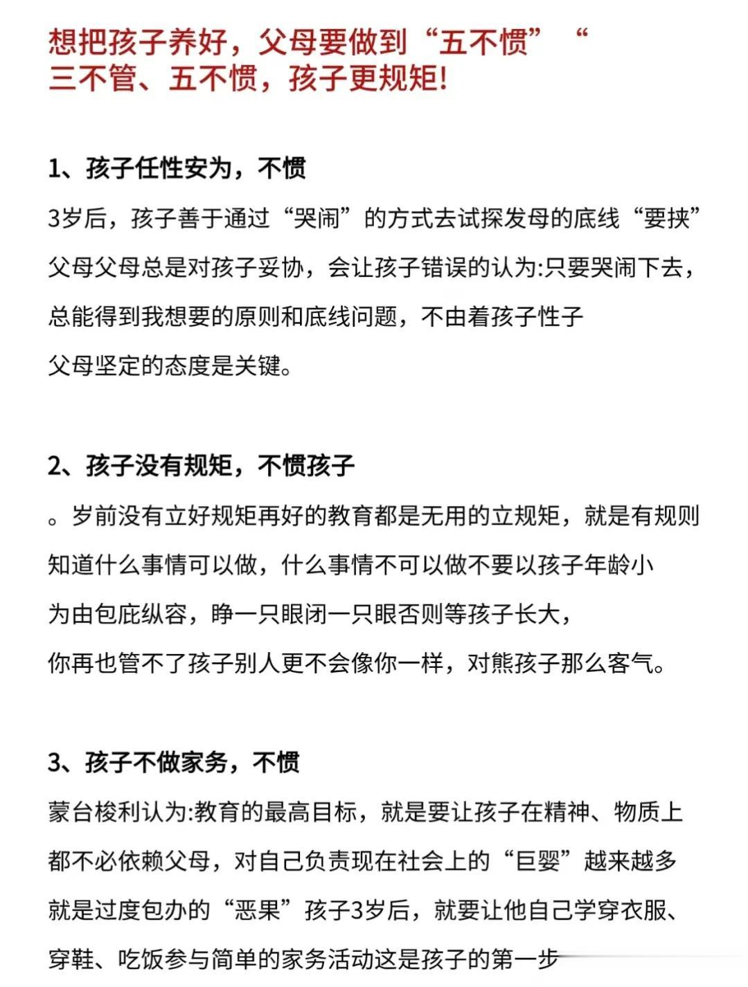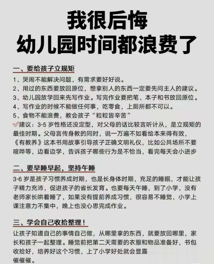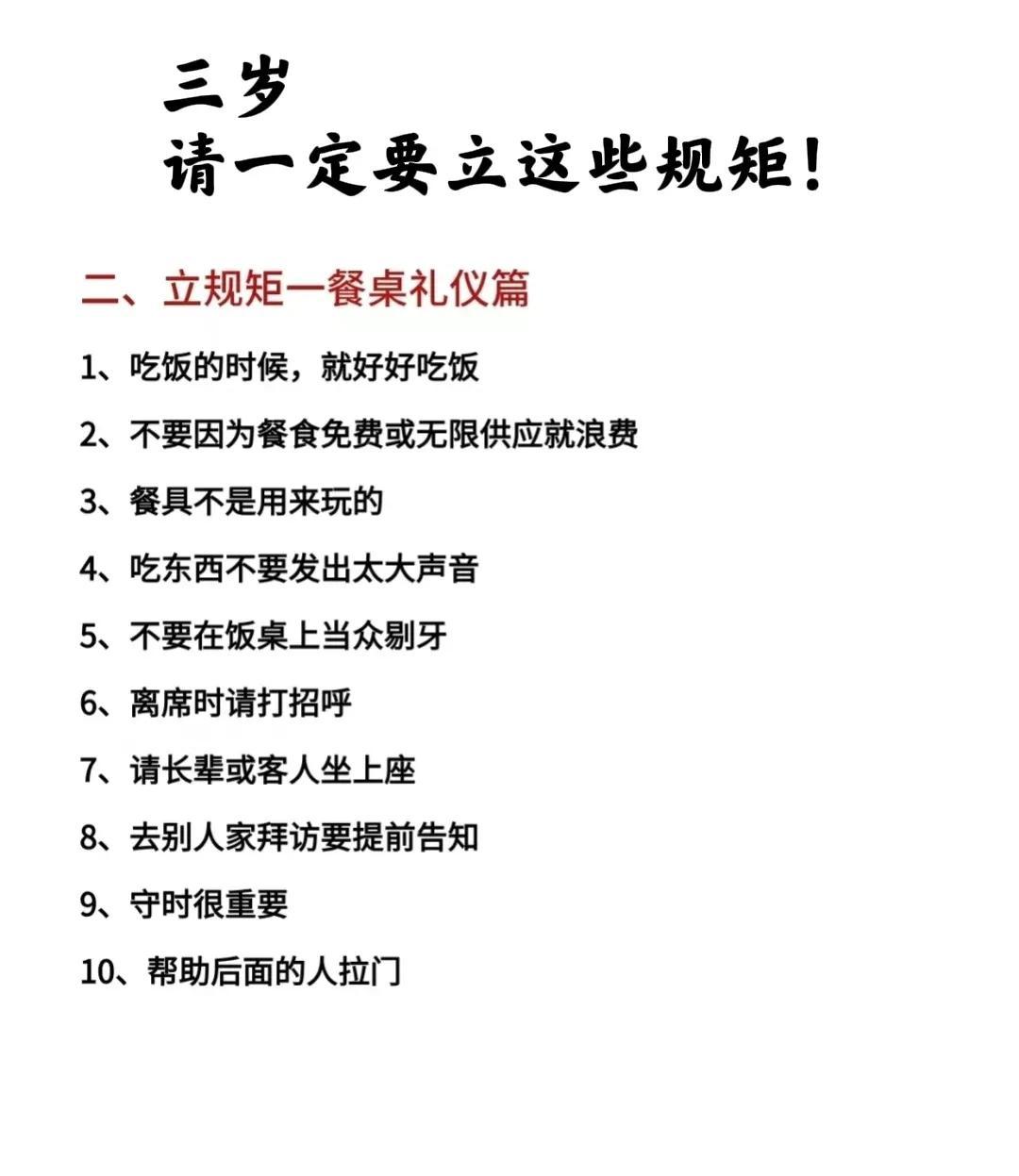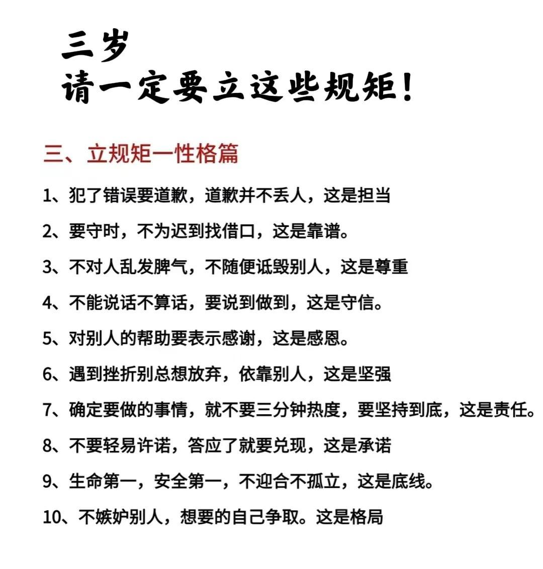 一位家长的心声:我很后悔,幼儿园时间都浪费了,三岁请一定要立这些规矩!看完后说的太对了,规矩一定要早立。孩子越长大越优秀,更容易成功。什么生活规矩、餐桌礼仪、性格、言行、仪表、待人接物等等,家有孩子的,抓紧保存下来,穷养、富养,不如有教养! 有教养家庭教育书