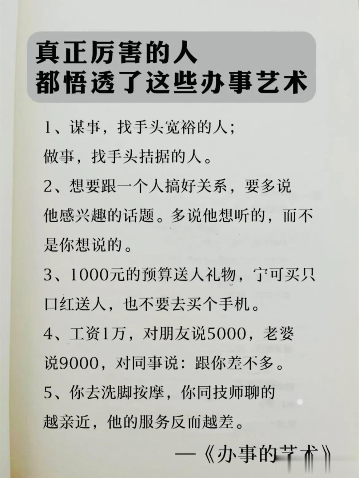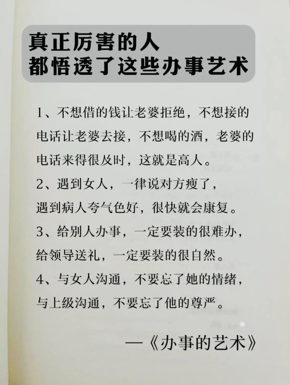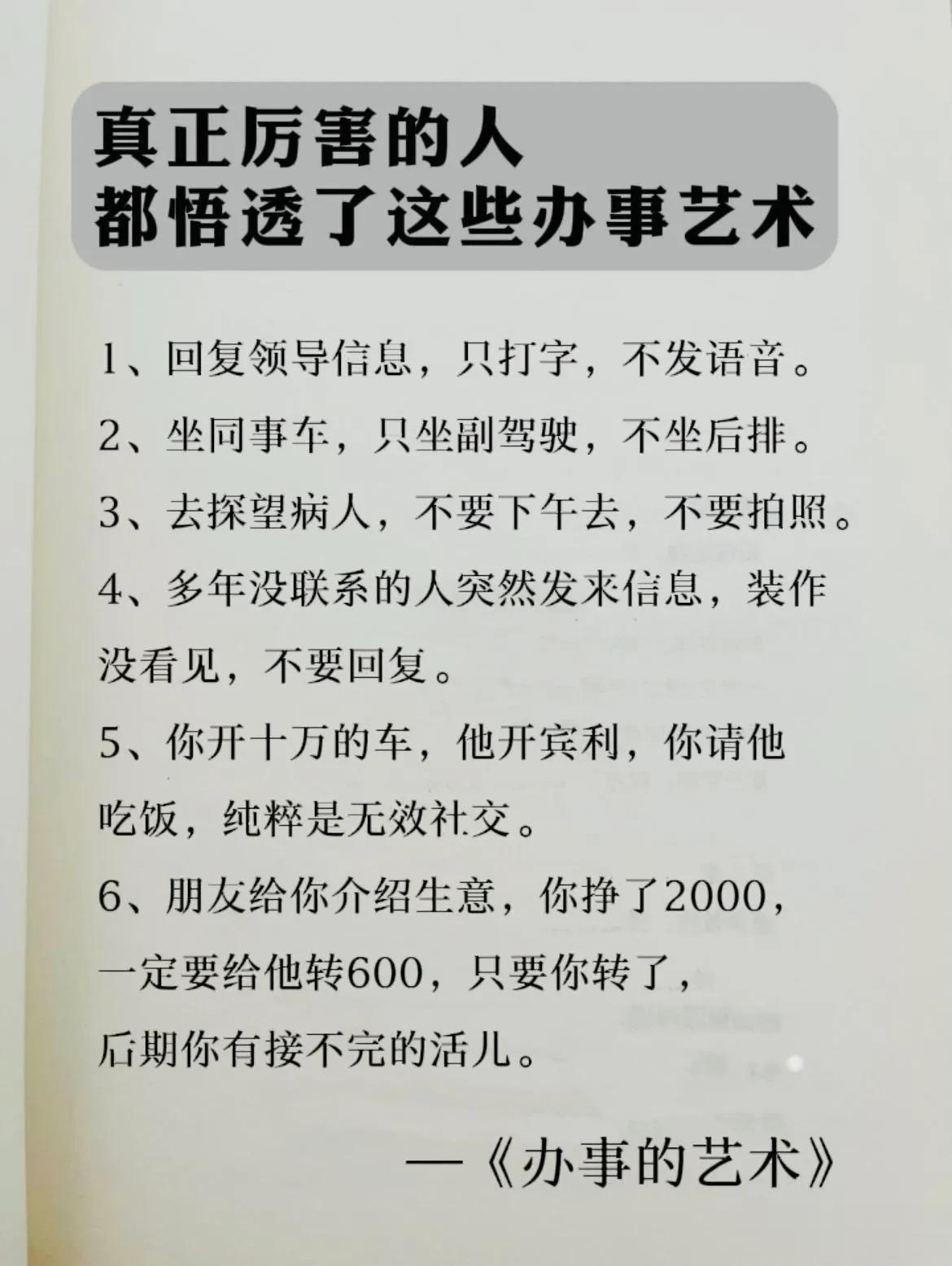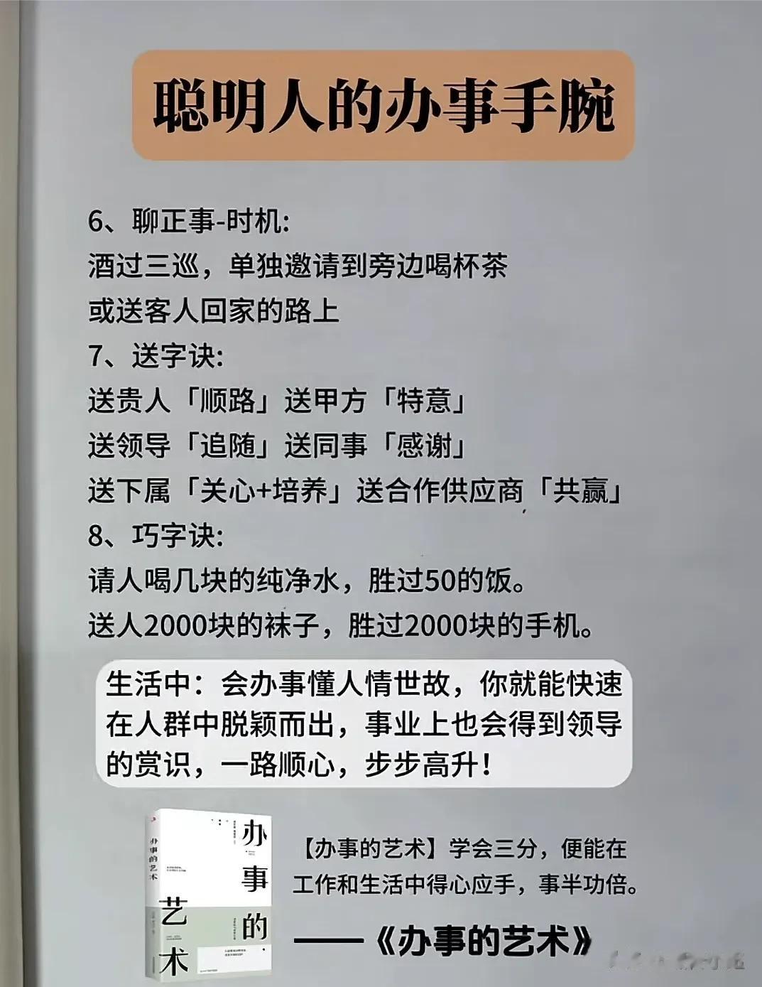 能够越混越好的,都是懂办事艺术的人!真正厉害的人,也都悟透了办事的技巧和方法,在哪里都能左右逢缘,事半功倍。 比如聪明人的办事手腕: 烟搭桥,酒铺路,关系带你上高速。提前送,向上送,尽量晚上送。 送字诀:送贵人「顺路」送甲方「特意」 送领导「追随」送同事「感谢」 送下属「关心+培养」 送合作供应商「共赢」 …… 工作中:会办事懂人情世故,你就能快速在人群中脱颖而出,事业上也会得到领导的赏识,一路顺心,步步高升! 学会《办事的艺术》 做事得心应手,事半功倍 办事的艺术