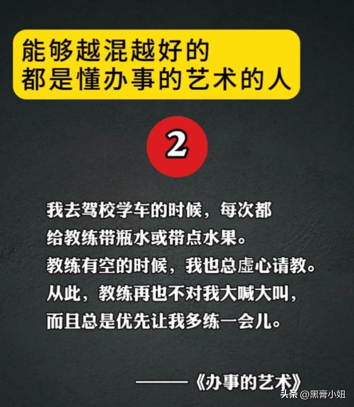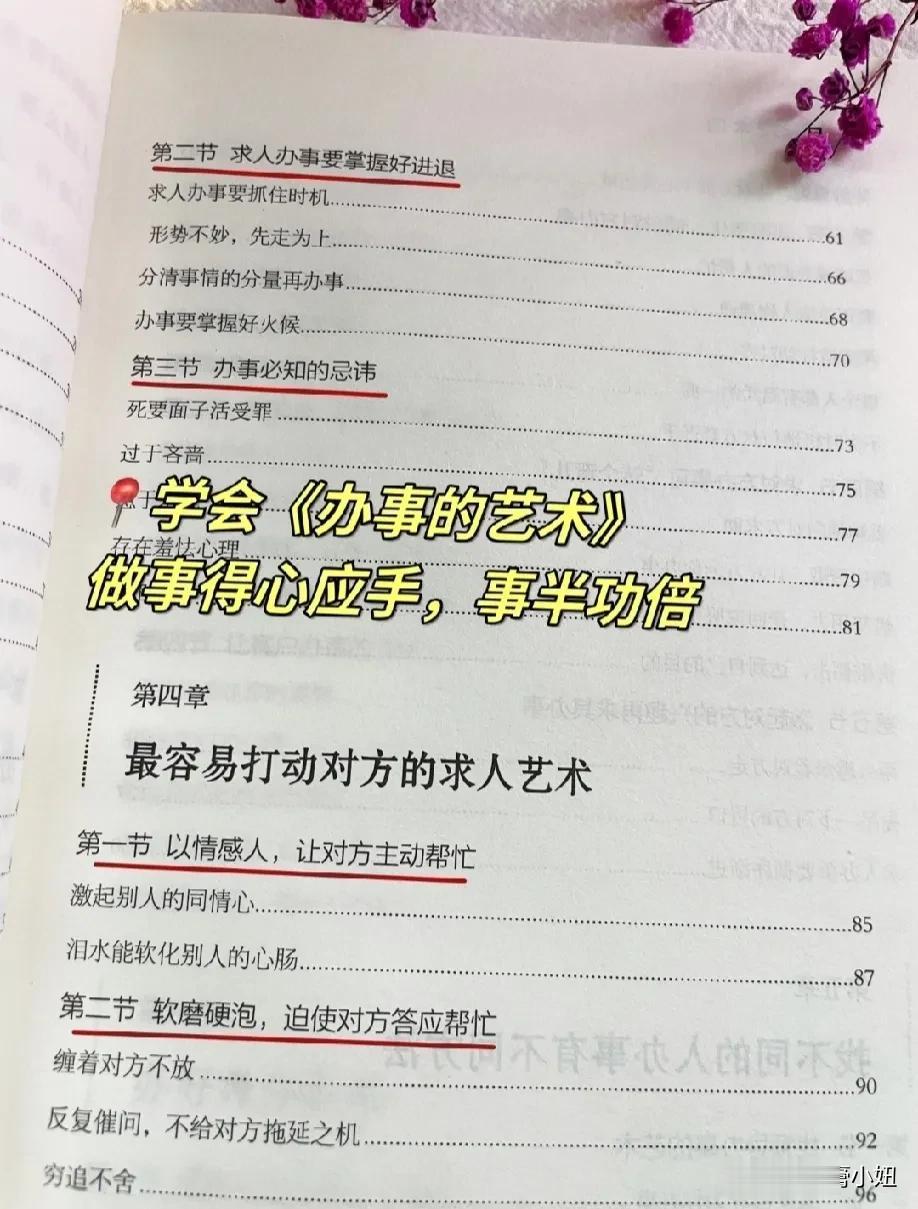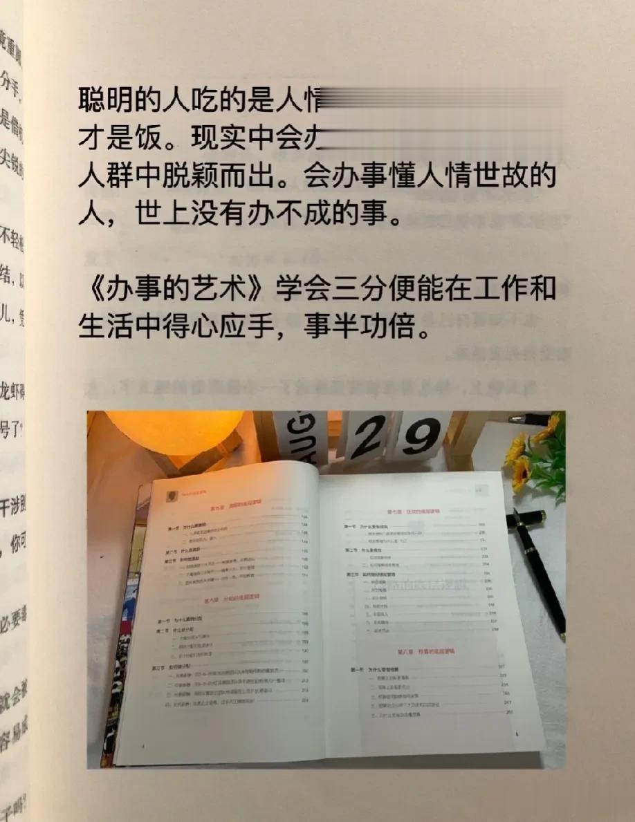 能够越混越好的,都是懂办事艺术的人!真正厉害的人,也都悟透了办事的技巧和方法,在哪里都能左右逢缘,事半功倍。 比如聪明人的办事手腕: 烟搭桥,酒铺路,关系带你上高速。提前送,向上送,尽量晚上送。 送字诀:送贵人「顺路」送甲方「特意」 送领导「追随」送同事「感谢」 送下属「关心+培养」 送合作供应商「共赢」 …… 工作中:会办事懂人情世故,你就能快速在人群中脱颖而出,事业上也会得到领导的赏识,一路顺心,步步高升! 学会《办事的艺术》 做事得心应手,事半功倍 办事的艺术