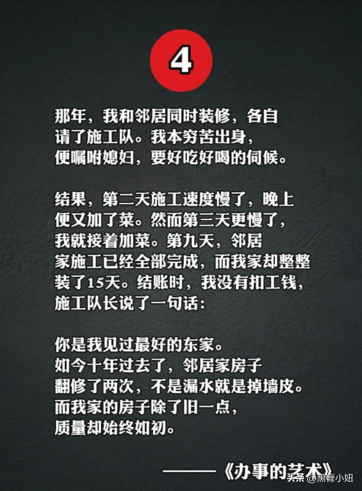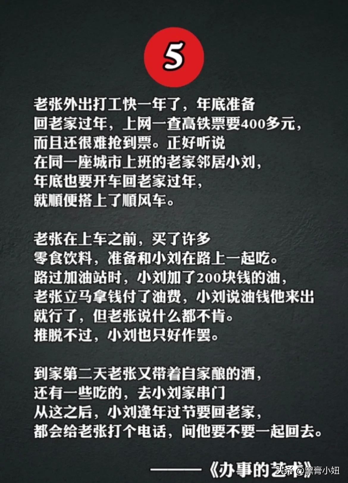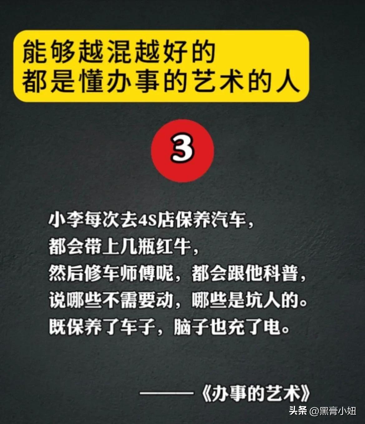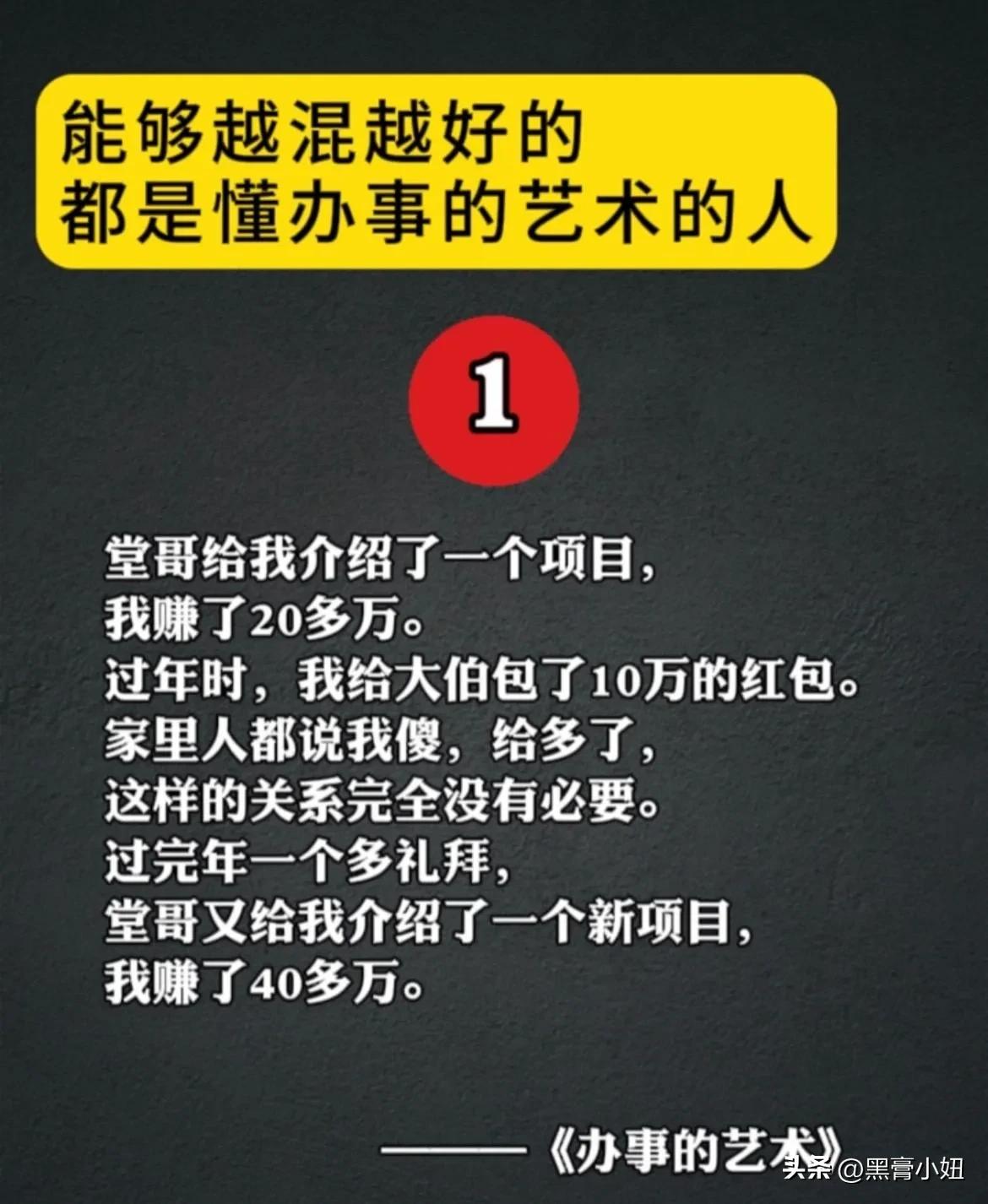能够越混越好的,都是懂办事艺术的人!真正厉害的人,也都悟透了办事的技巧和方法,在哪里都能左右逢缘,事半功倍。 比如聪明人的办事手腕: 烟搭桥,酒铺路,关系带你上高速。提前送,向上送,尽量晚上送。 送字诀:送贵人「顺路」送甲方「特意」 送领导「追随」送同事「感谢」 送下属「关心+培养」 送合作供应商「共赢」 …… 工作中:会办事懂人情世故,你就能快速在人群中脱颖而出,事业上也会得到领导的赏识,一路顺心,步步高升! 学会《办事的艺术》 做事得心应手,事半功倍 办事的艺术