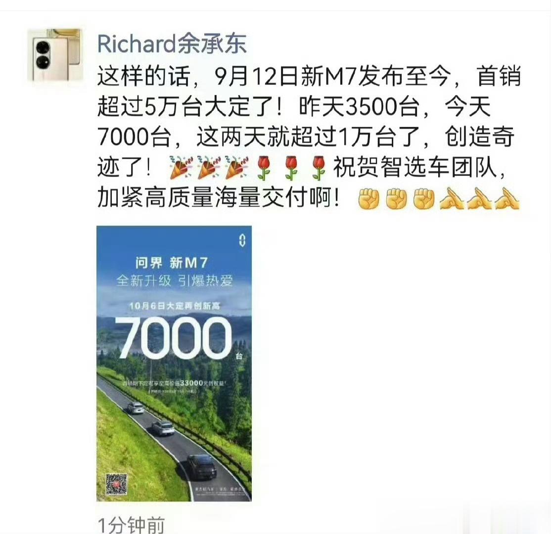 #问界#M7今天超7000台大定,首销超5万台了,确实有点猛,余总也忍不住发朋友
