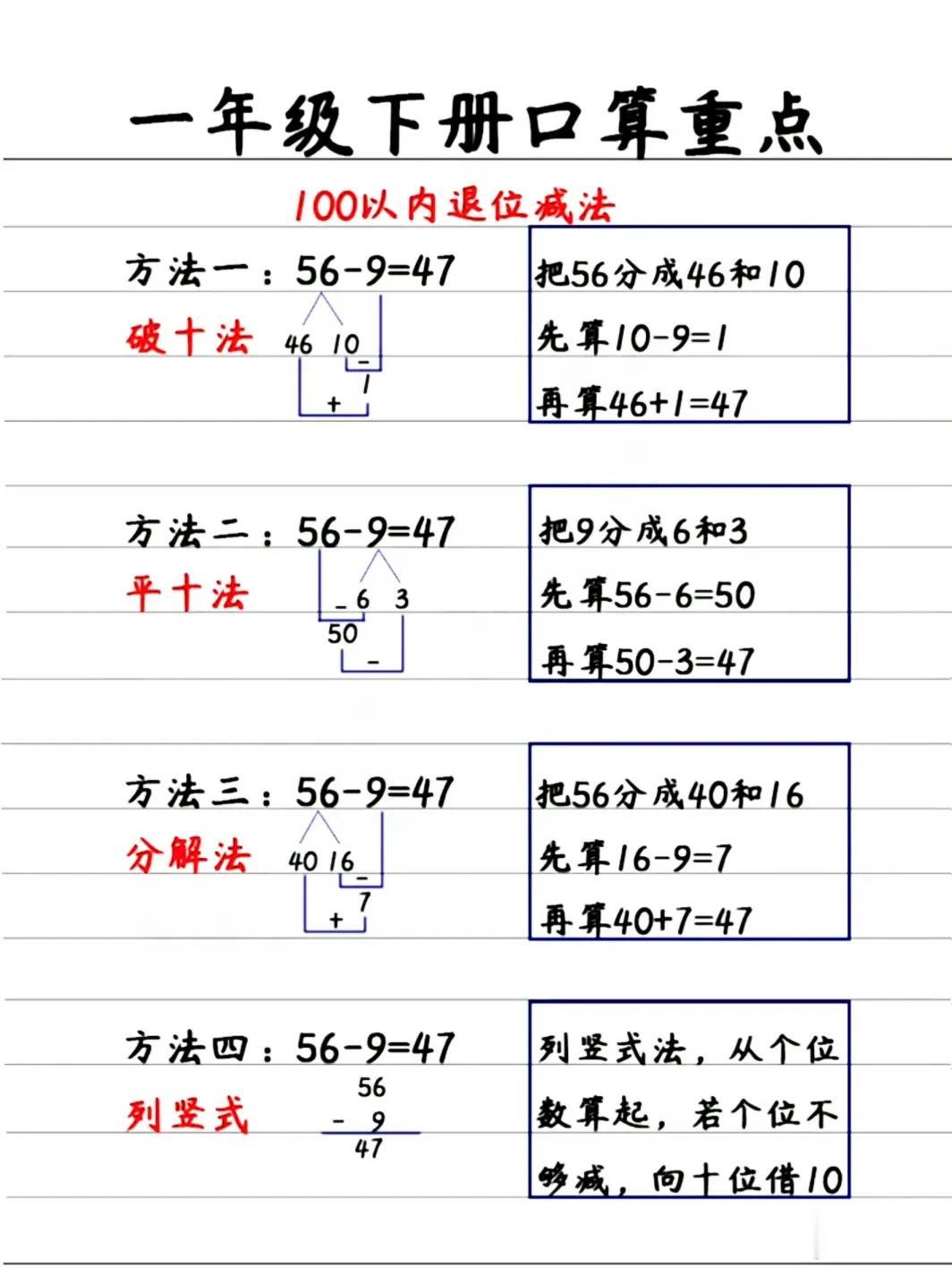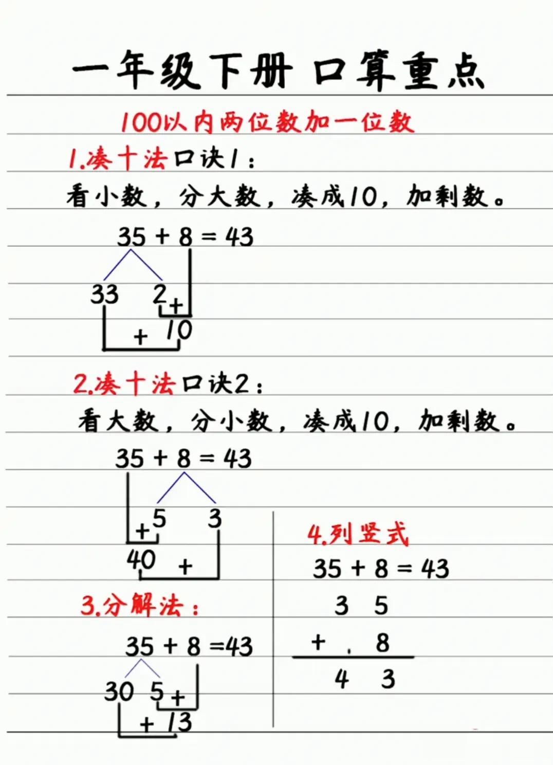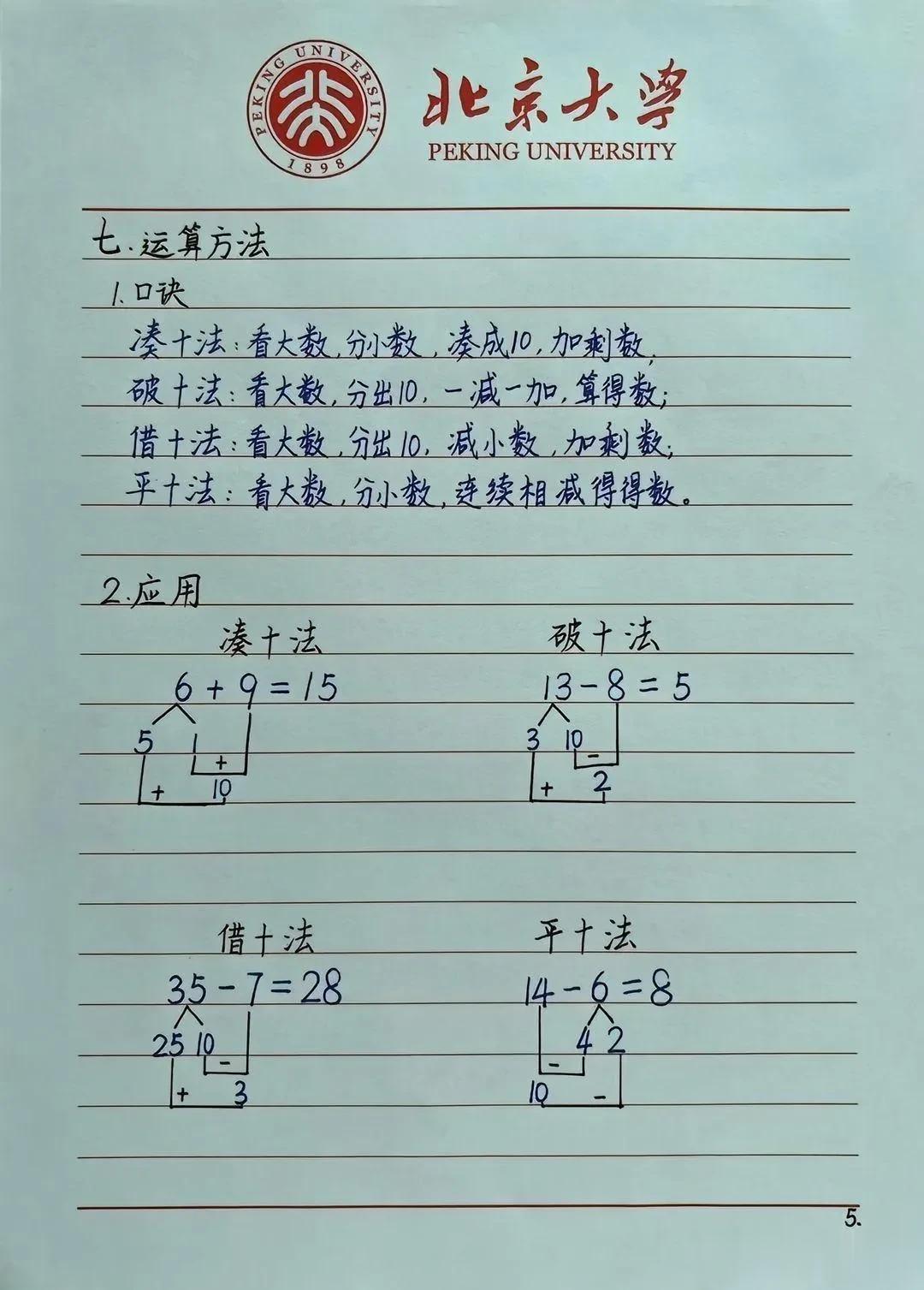 不愧是北大学霸妈妈,让孩子做好幼小衔接,竟然手写了一份数学知识点,按序号分类整理的清清楚楚,还有例题和速记口诀,简直太适合零基础的孩子,比如10以内单双数、比大小、运算方法、认识钟表、加减法速算等等,对孩子学好数学与打好数学基础非常有帮助,减轻幼小升的压力,赢在起跑线上。有空让孩子看一看,尽早把这些基础知识掌握好。 数学口算能力提升