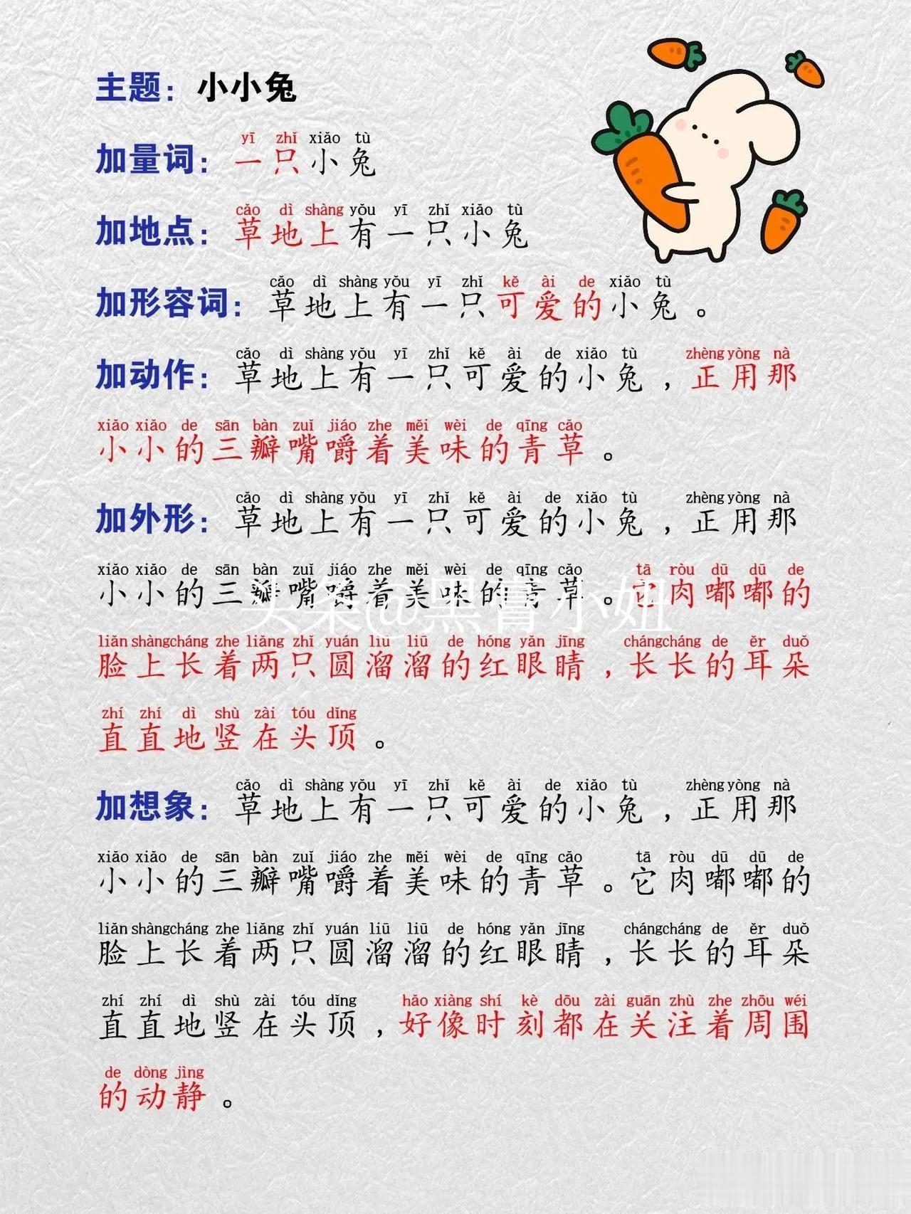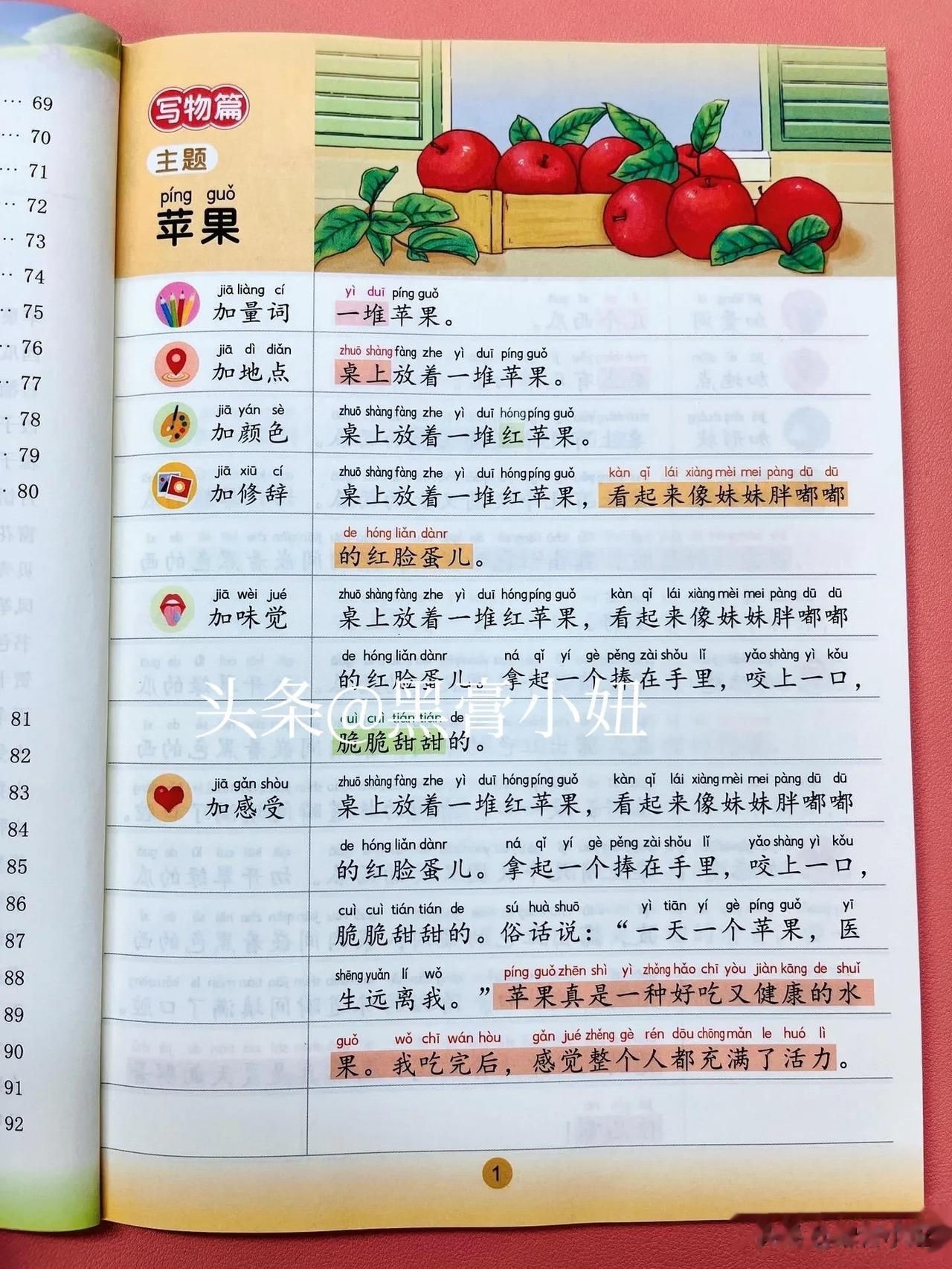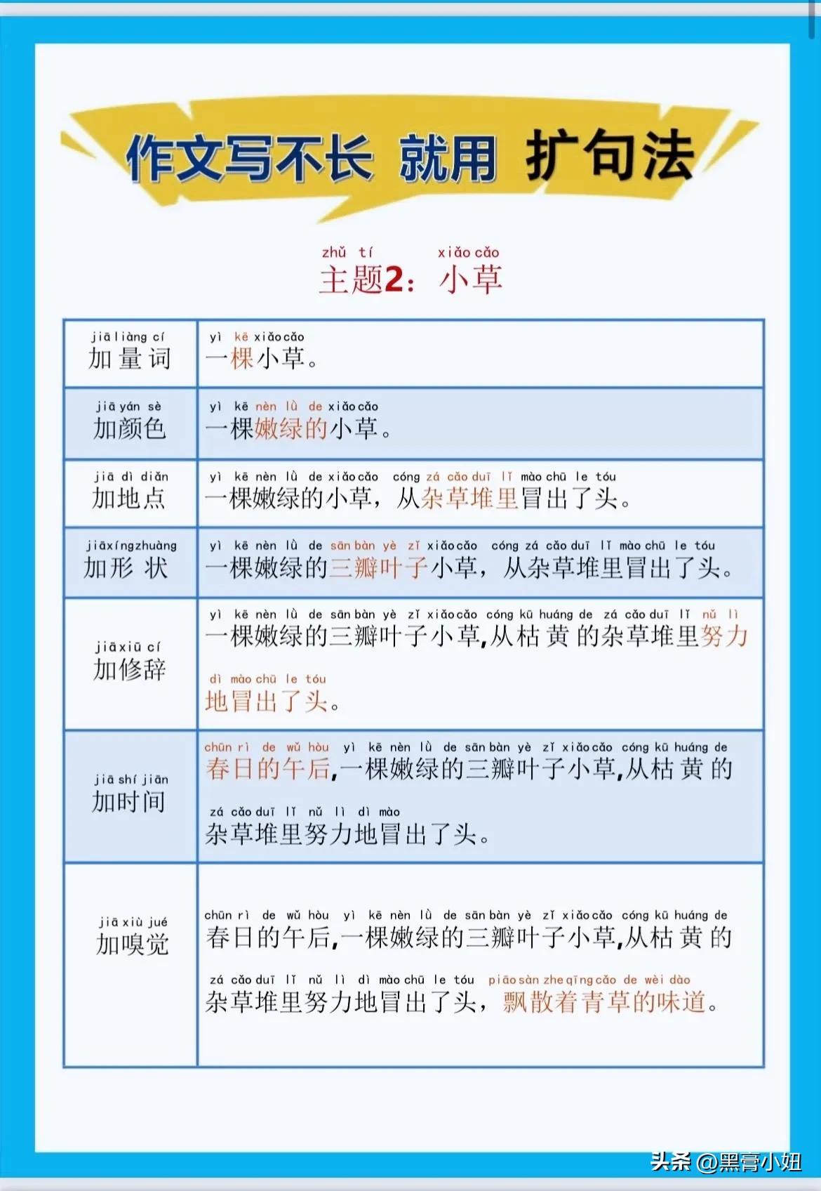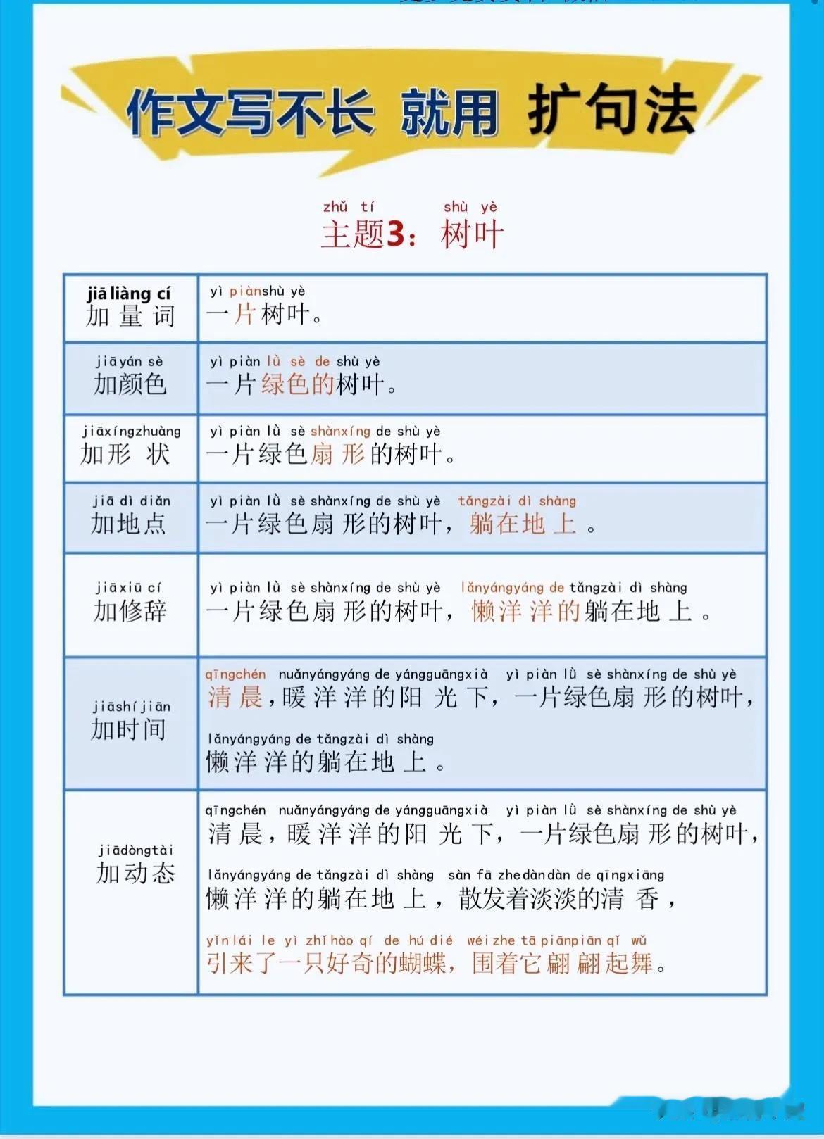 天呐!快40岁了才知道,原来写作也是有万能公式的,很多孩子作文无话可写,还不够生动,不妨试试这个扩句法,从一个简单的词很快就扩句成段成篇,让细节描述更加清晰,句子更生动优美。赶紧保存下来!让孩子掌握写作方法,轻松写作文。 不瞒你说,语文成绩棒的孩子早就偷偷用上了扩句法写作方案。让孩子读练结合,增强孩子写作能力和记忆,很快提升语文成绩。 扩句法写话素材技巧