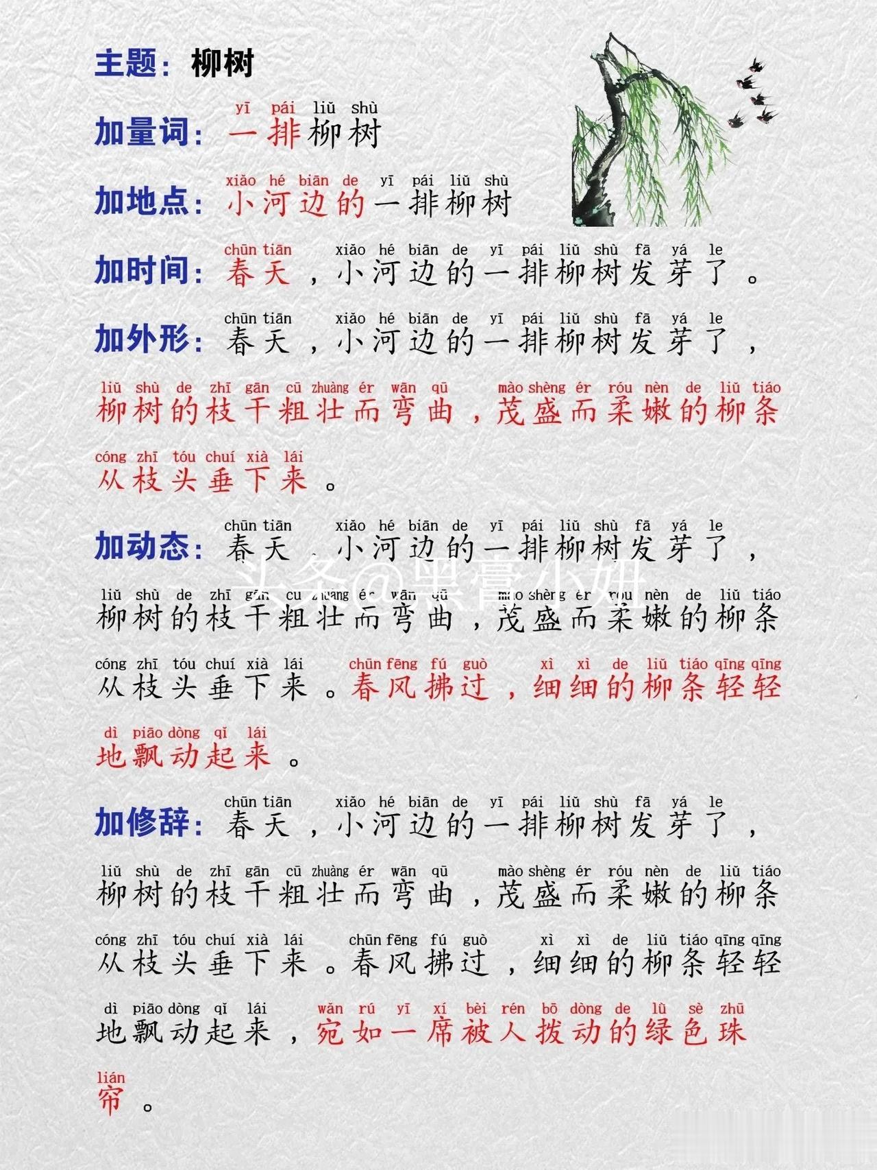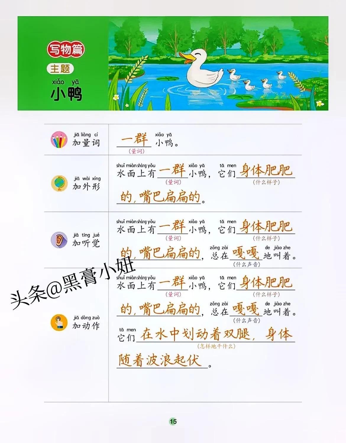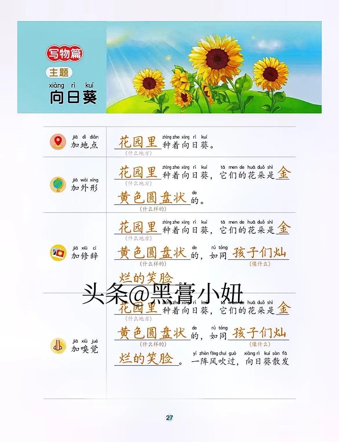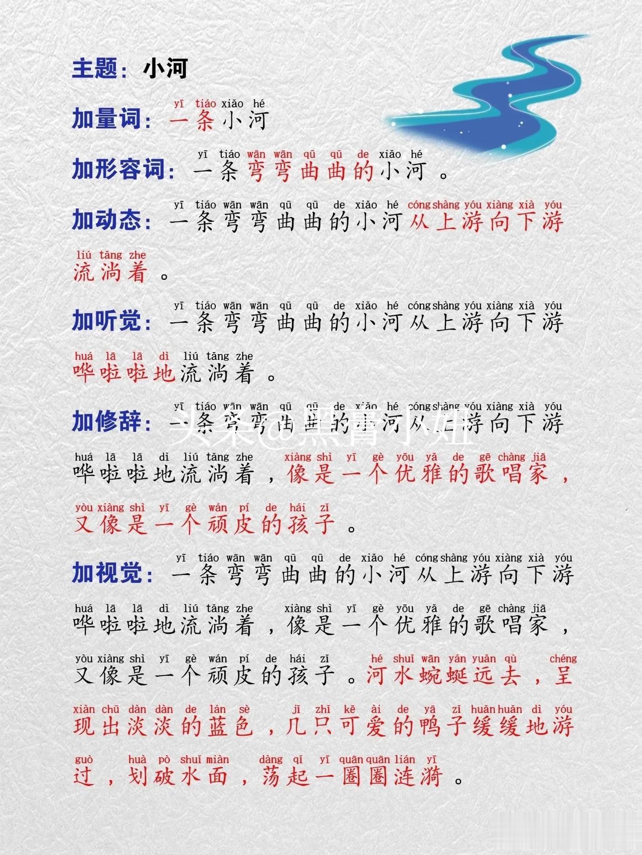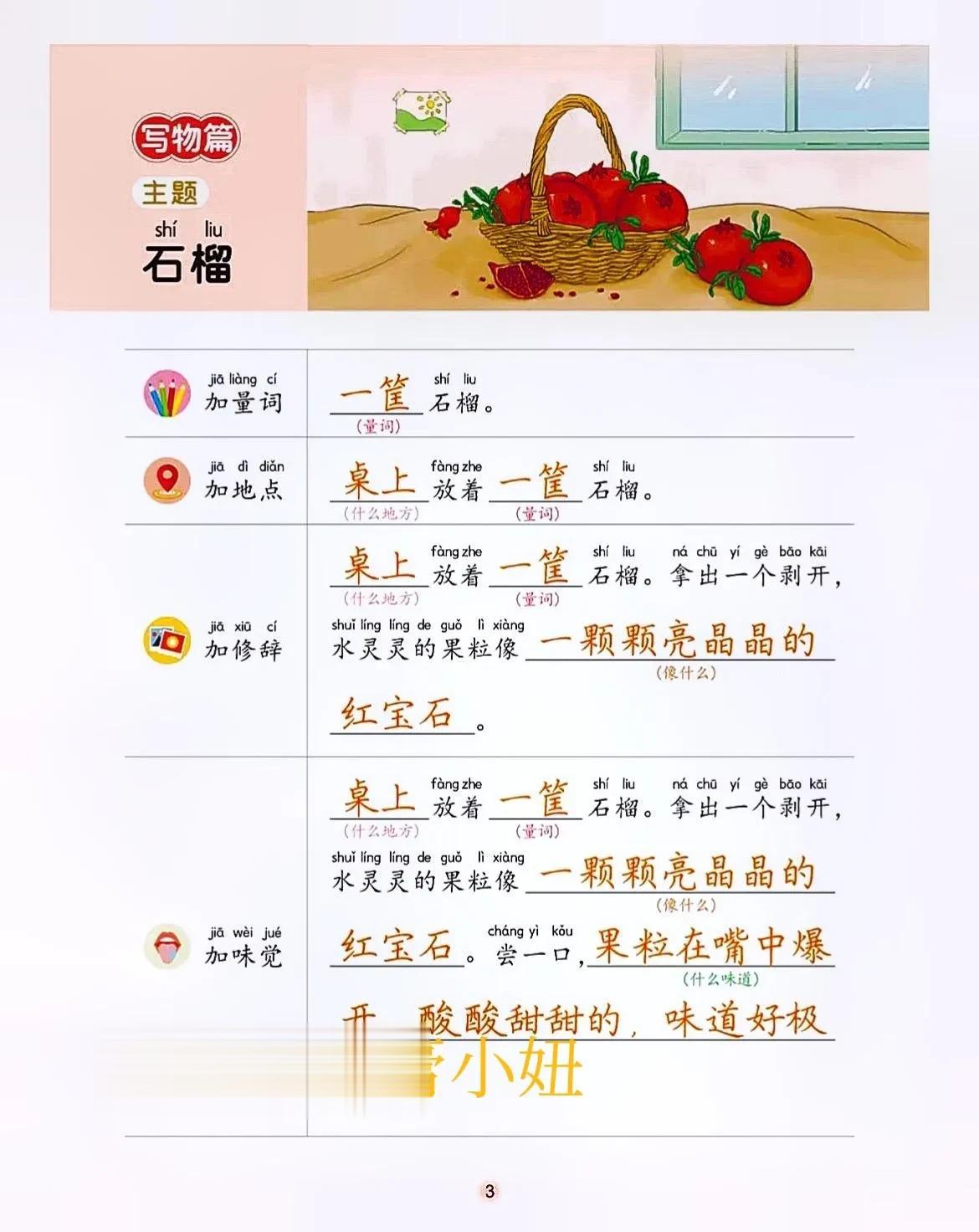 天呐!快40岁了才知道,原来写作也是有万能公式的,很多孩子作文无话可写,还不够生动,不妨试试这个扩句法,从一个简单的词很快就扩句成段成篇,让细节描述更加清晰,句子更生动优美。赶紧保存下来!让孩子掌握写作方法,轻松写作文。 不瞒你说,语文成绩棒的孩子早就偷偷用上了扩句法写作方案。让孩子读练结合,增强孩子写作能力和记忆,很快提升语文成绩。 扩句法写话素材技巧