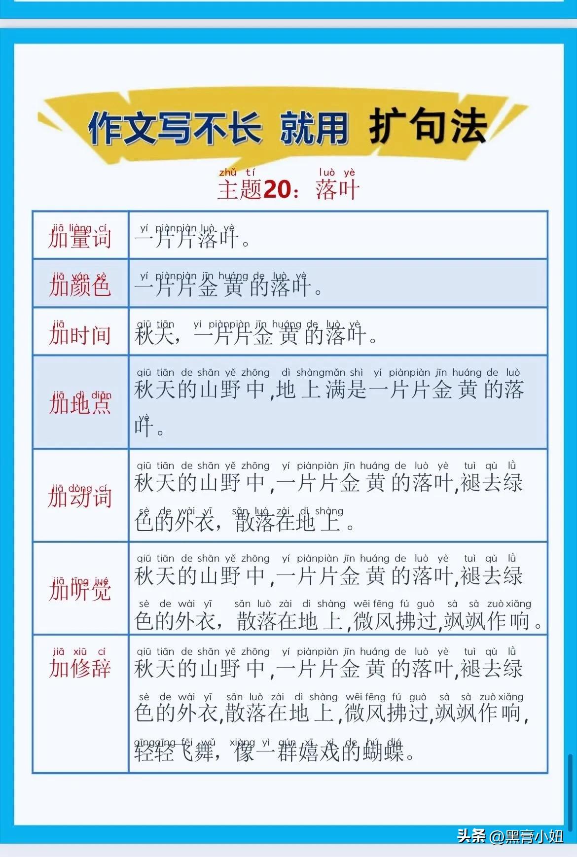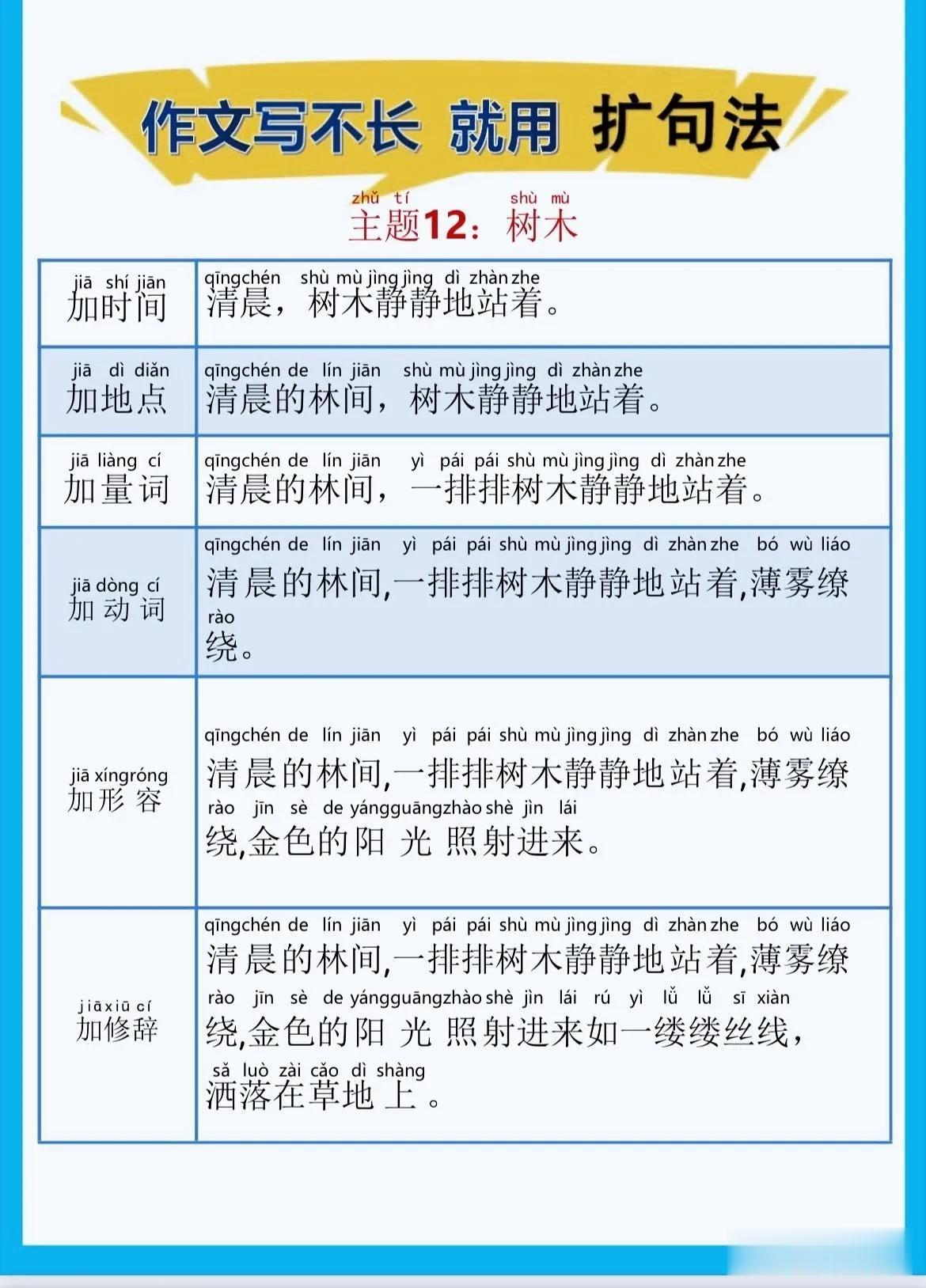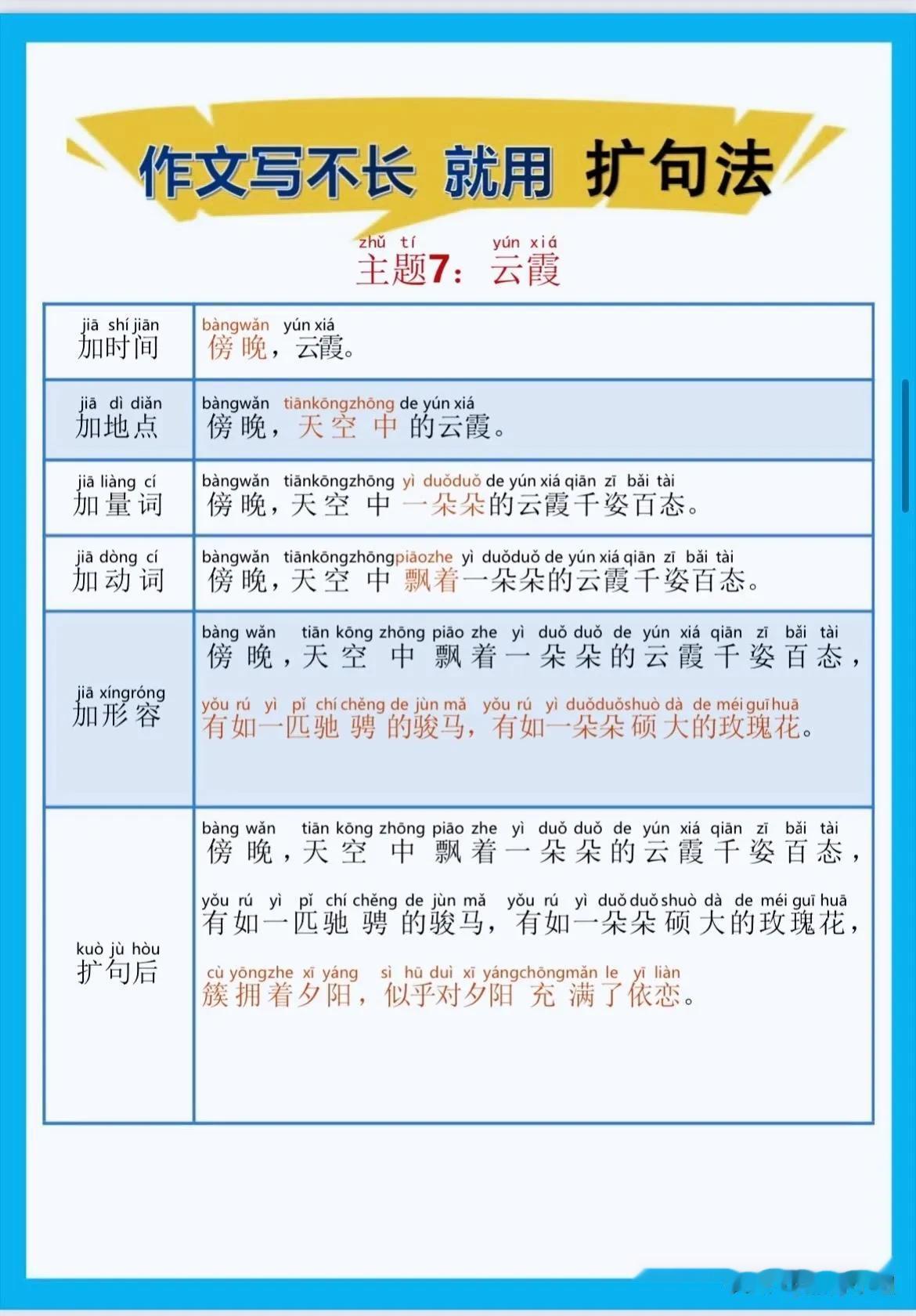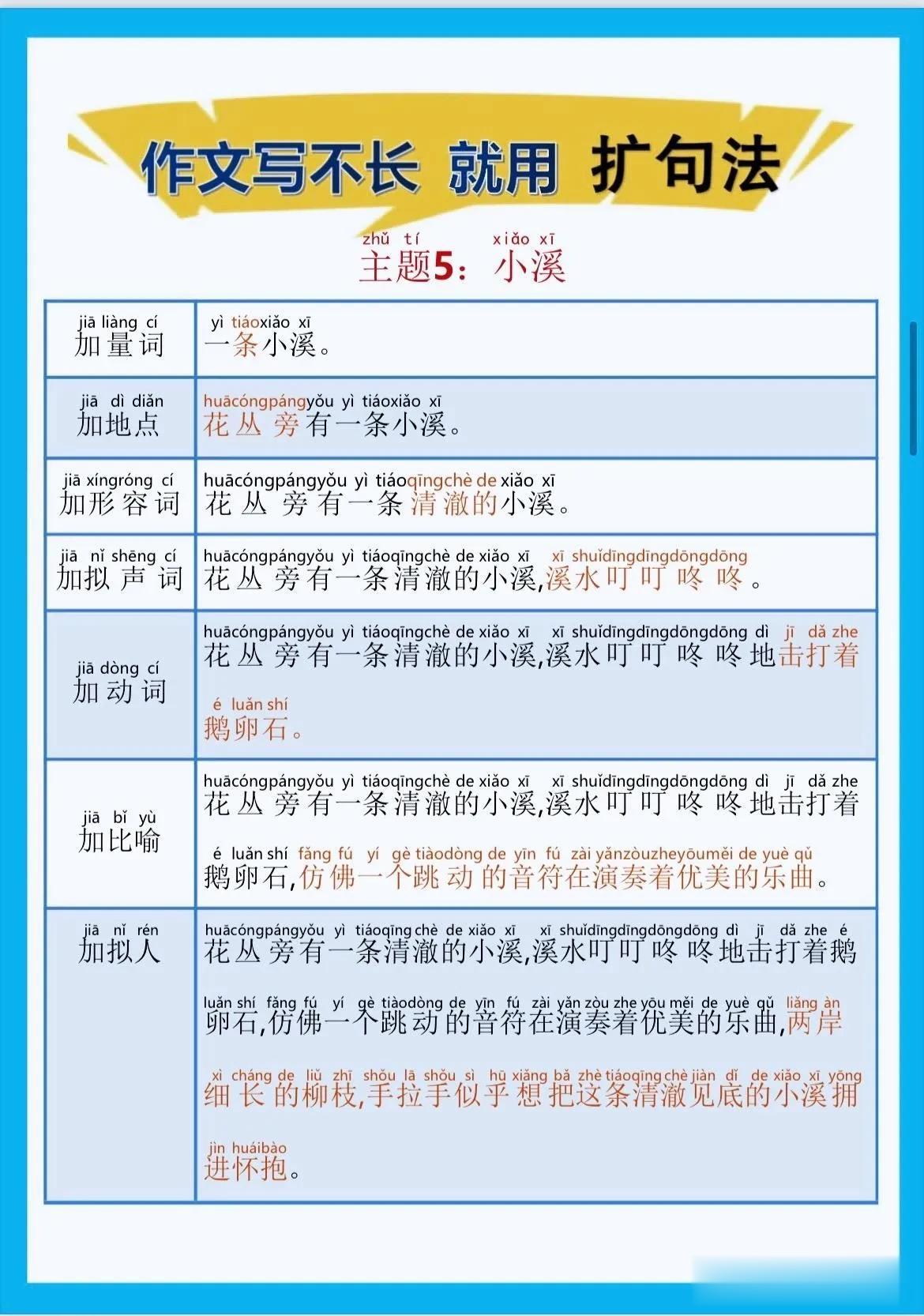一位特级语文老师总结的作文方法,作文写不长,就用扩句法!看完之后,发现写好作文很简单!!家有孩子的赶紧收藏!没事让孩子看一看,练一练,打好基础,提升写作水平! 扩句法写作方案,会对写作困难的同学有极大的帮助,可以将简单的句子写的更加生动,提升作文档次!赶紧拿给孩子试一试! 语文扩句法技巧方法
