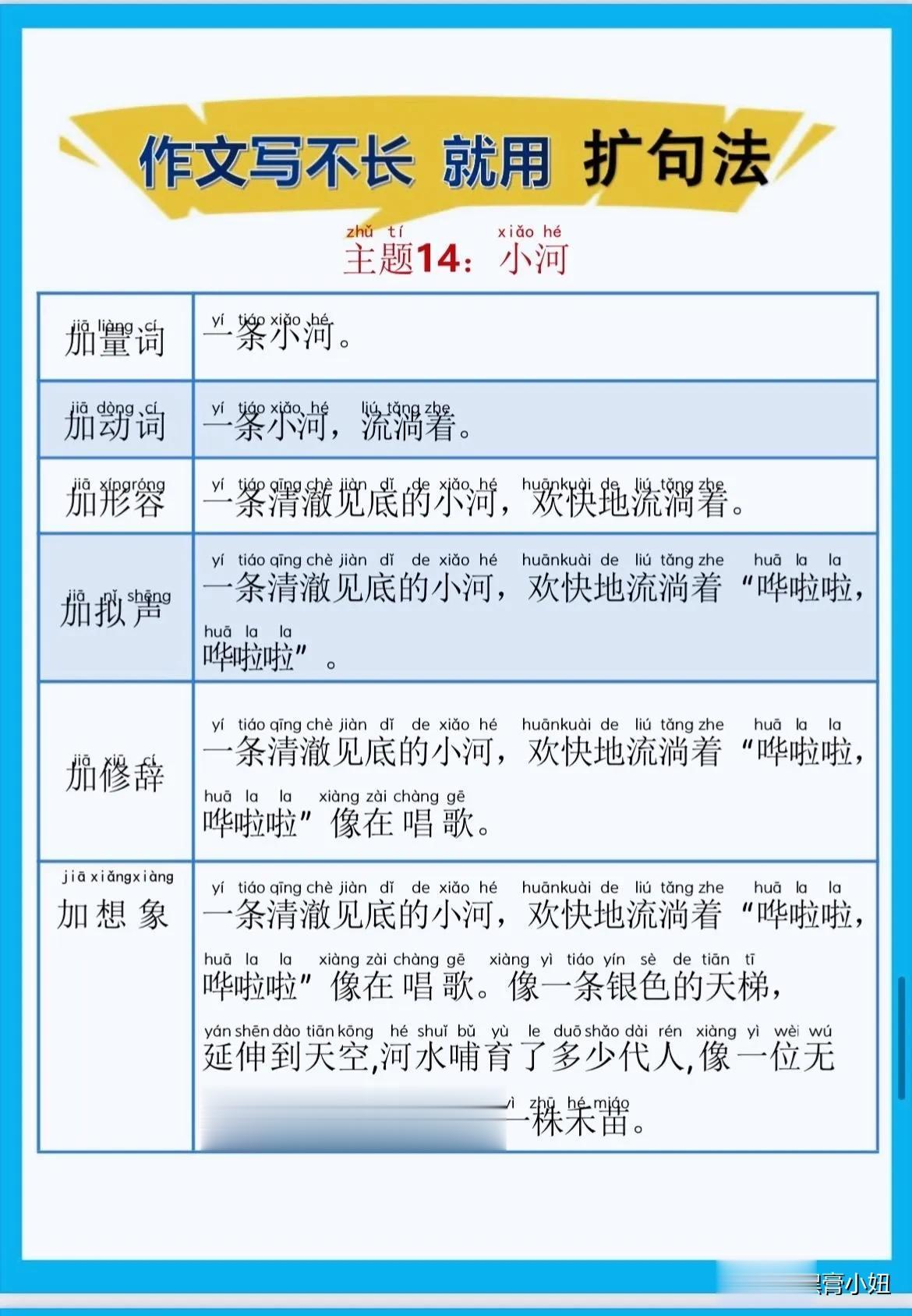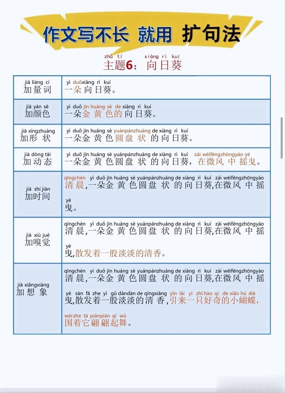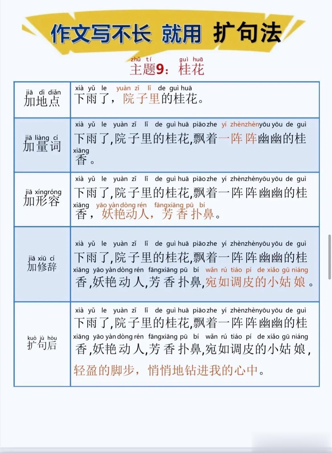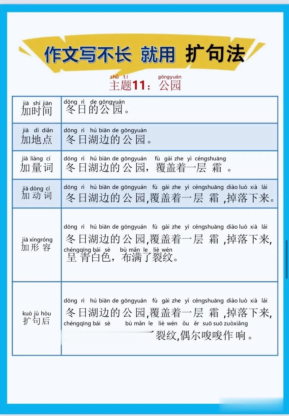 一位特级语文老师总结的作文方法,作文写不长,就用扩句法!看完之后,发现写好作文很简单!!家有孩子的赶紧收藏!没事让孩子看一看,练一练,打好基础,提升写作水平! 扩句法写作方案,会对写作困难的同学有极大的帮助,可以将简单的句子写的更加生动,提升作文档次!赶紧拿给孩子试一试! 语文扩句法技巧方法
