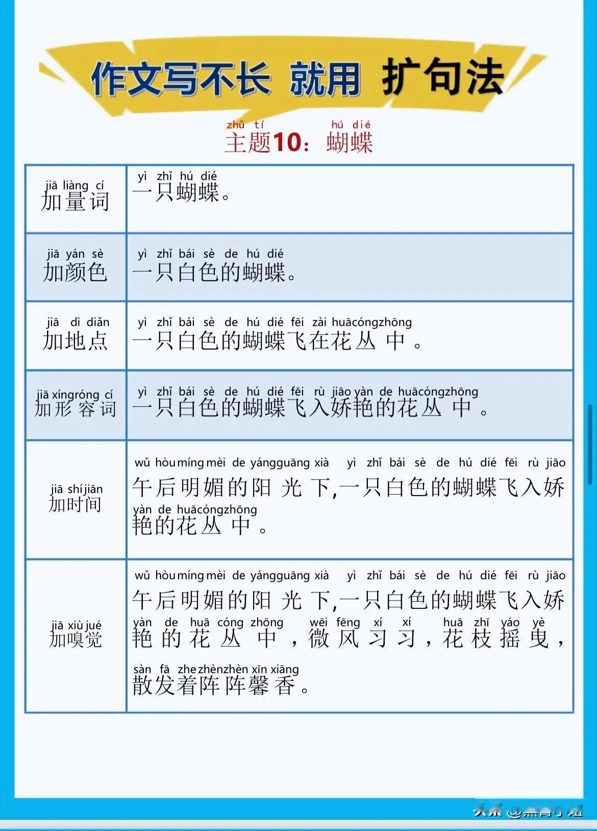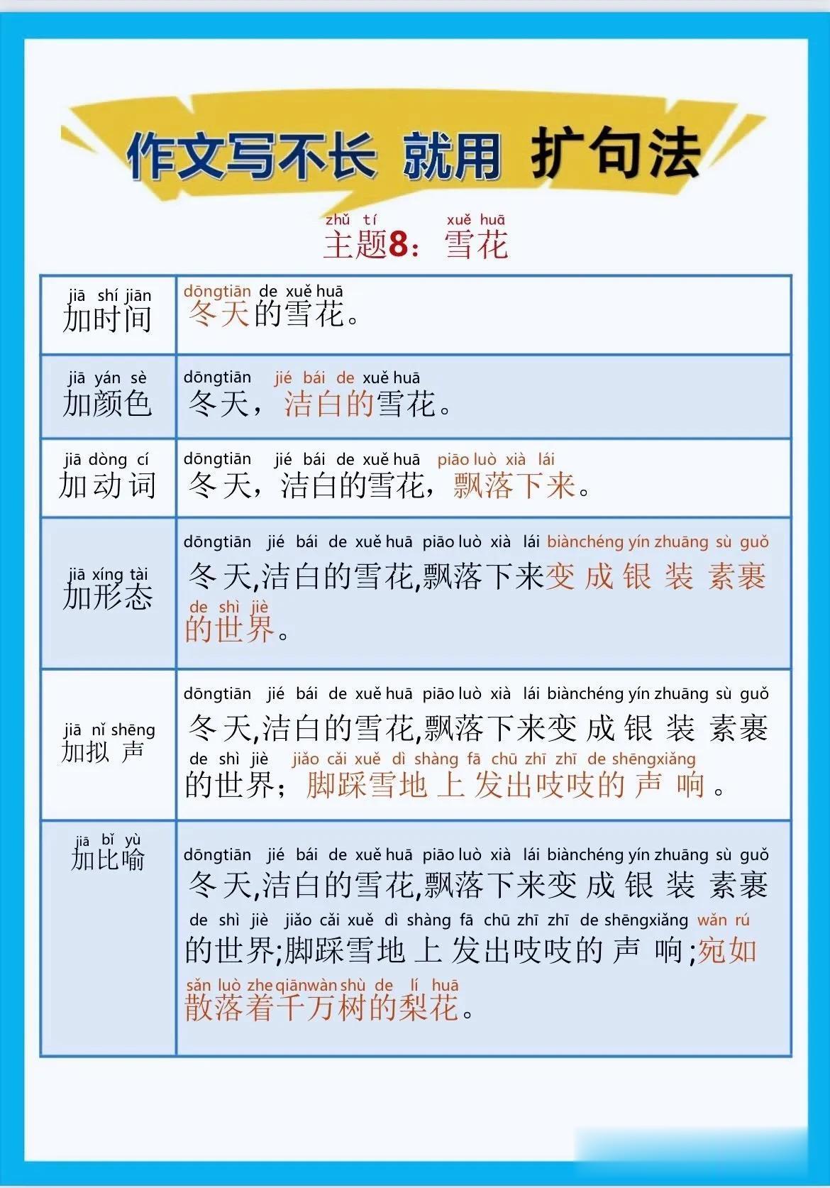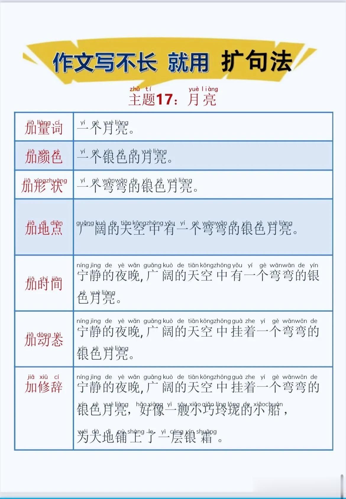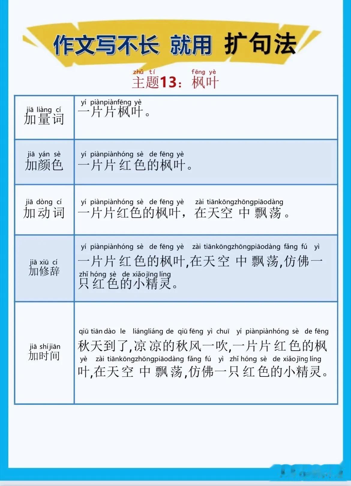 一位特级语文老师总结的作文方法,作文写不长,就用扩句法!看完之后,发现写好作文很简单!!家有孩子的赶紧收藏!没事让孩子看一看,练一练,打好基础,提升写作水平! 扩句法写作方案,会对写作困难的同学有极大的帮助,可以将简单的句子写的更加生动,提升作文档次!赶紧拿给孩子试一试! 语文扩句法技巧方法