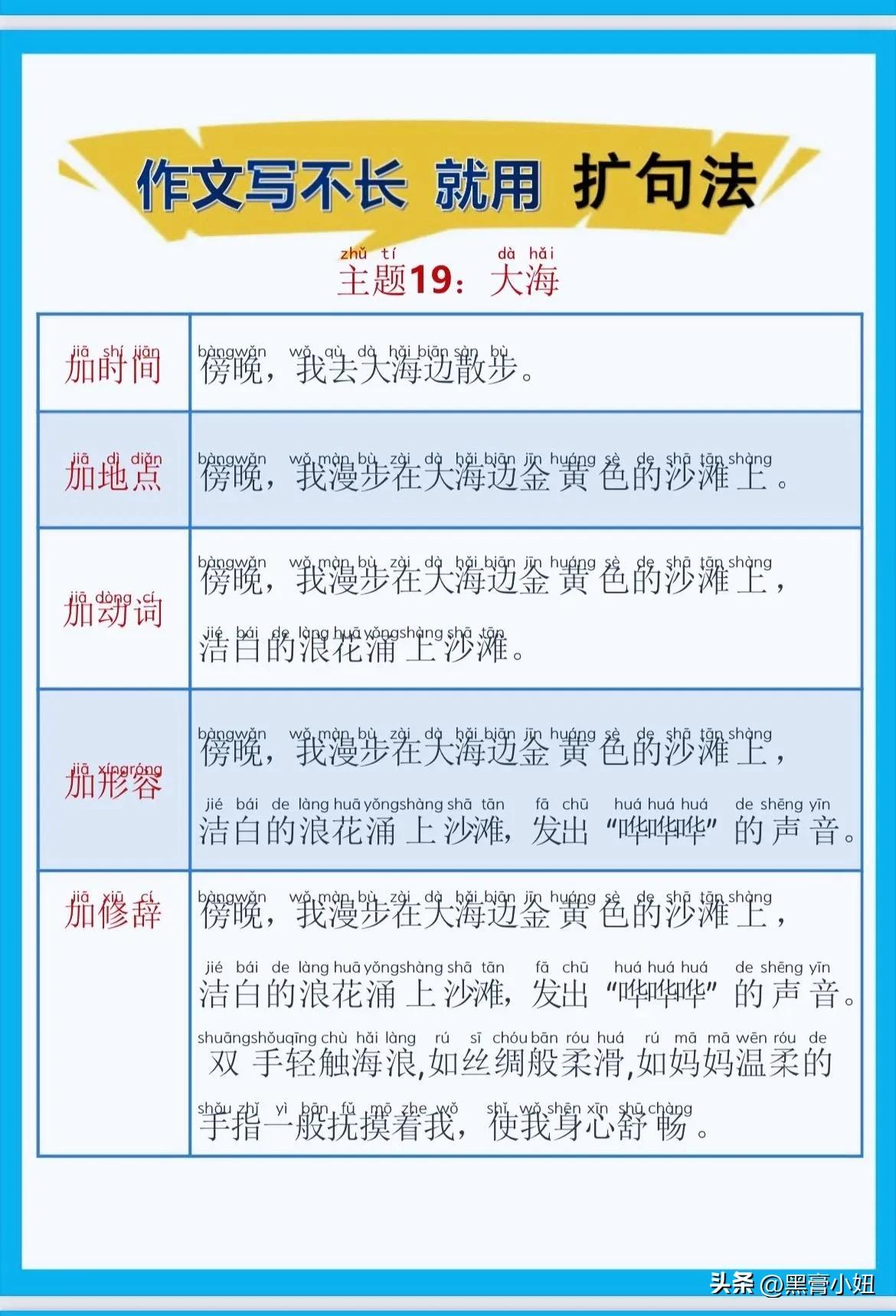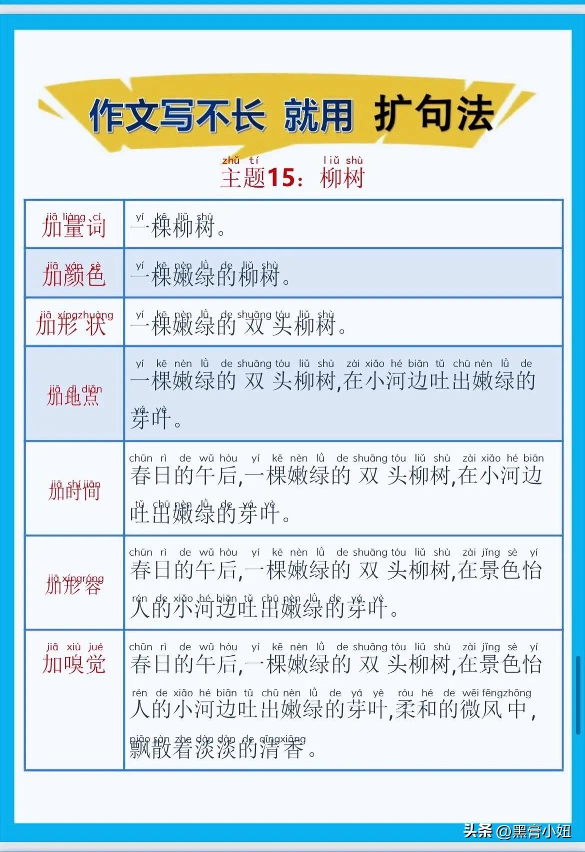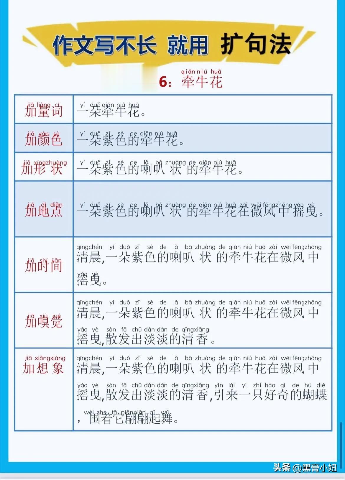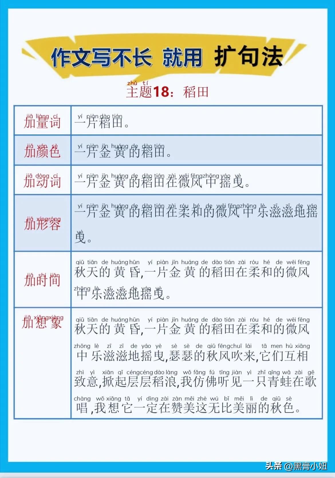 一位特级语文老师总结的作文方法,作文写不长,就用扩句法!看完之后,发现写好作文很简单!!家有孩子的赶紧收藏!没事让孩子看一看,练一练,打好基础,提升写作水平! 扩句法写作方案,会对写作困难的同学有极大的帮助,可以将简单的句子写的更加生动,提升作文档次!赶紧拿给孩子试一试! 语文扩句法技巧方法