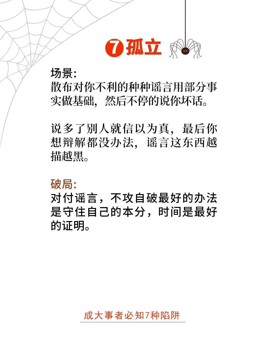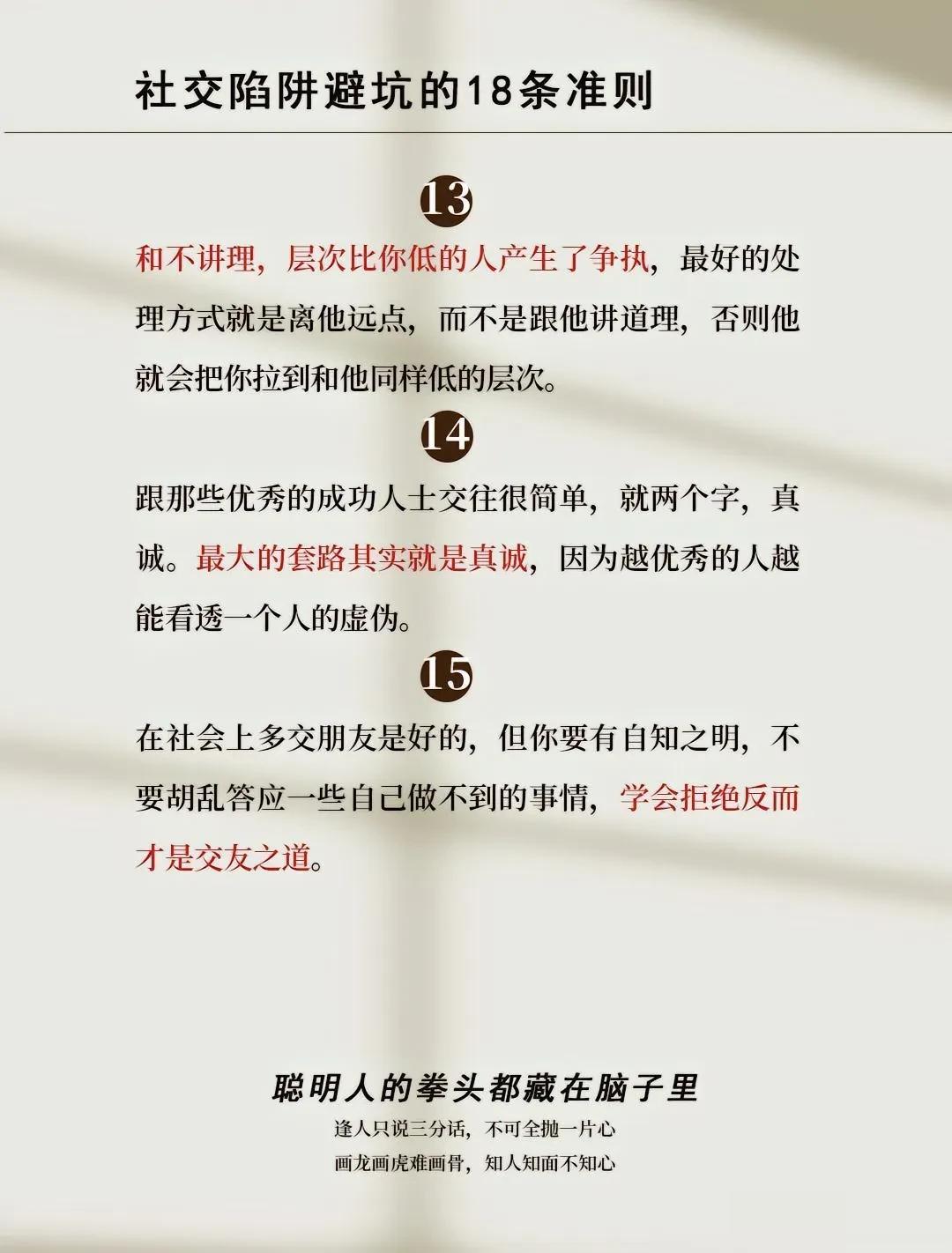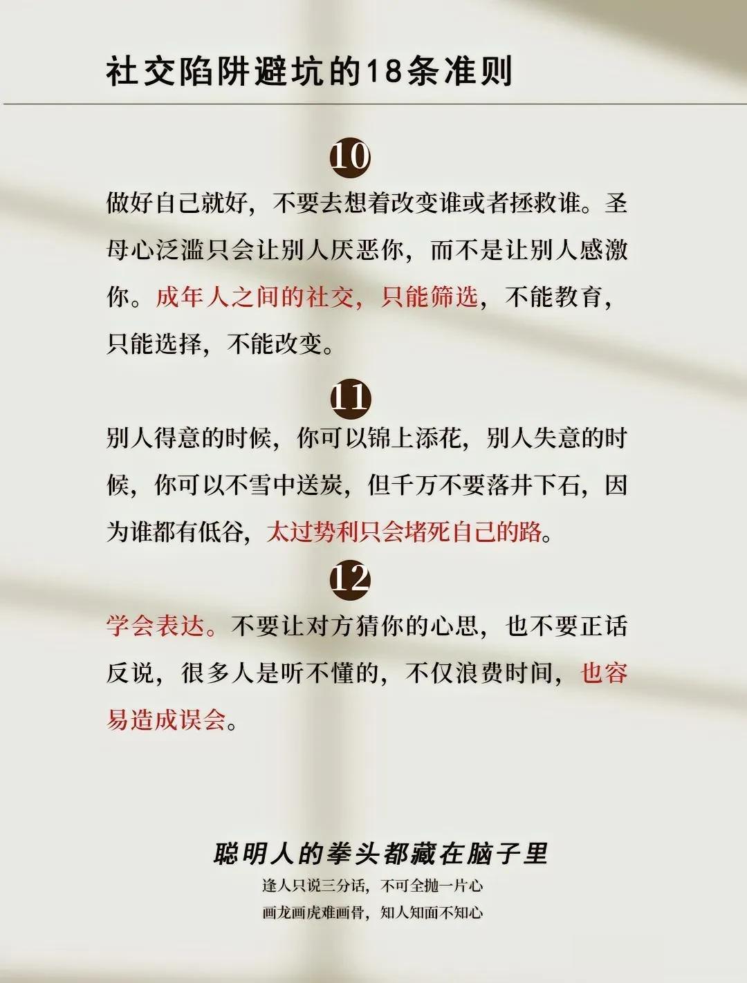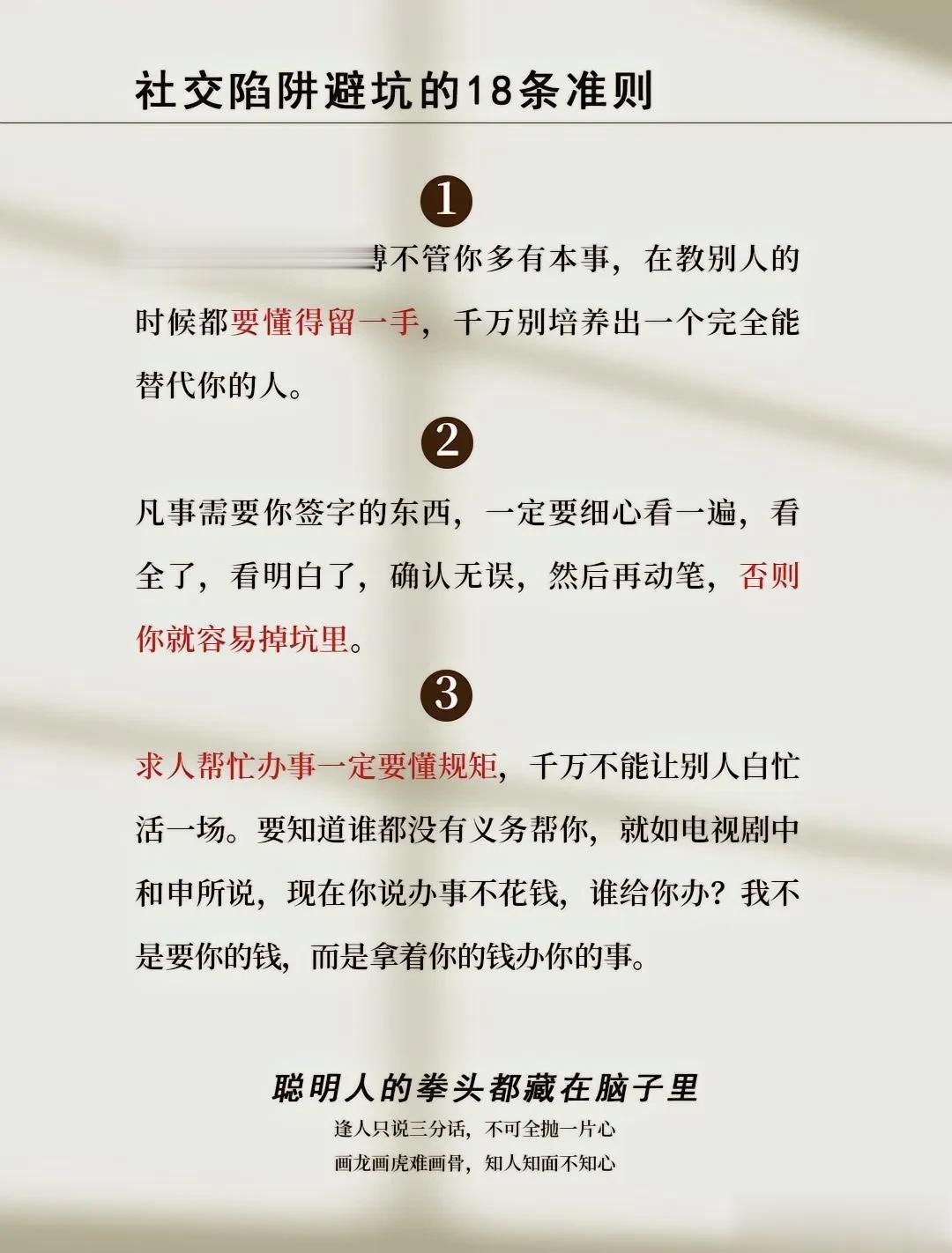 天哪!到今天才明白,原来那些能成功的人都懂观人、识人,看透人心的本事,早就对这七种社交陷阱和18条避坑准则烂熟于心了,看完以后,真的让人醍醐灌顶。不得不说很扎心但很常见,我们要提升洞察世事人心的能力,社交是人脉,也是陷阱,千万别让复杂的社会关系害了你!赶紧学起来!让小人暗箭来发,便已夭折。 看懂了,让你少走10年弯路吧,尤其是年轻人,一针见血,句句诛心。 成大事者必知的社交陷阱: 逢人只说三分话,不可全抛一片心 画龙画虎难画骨,知人知面不知心 社交陷阱社交指南