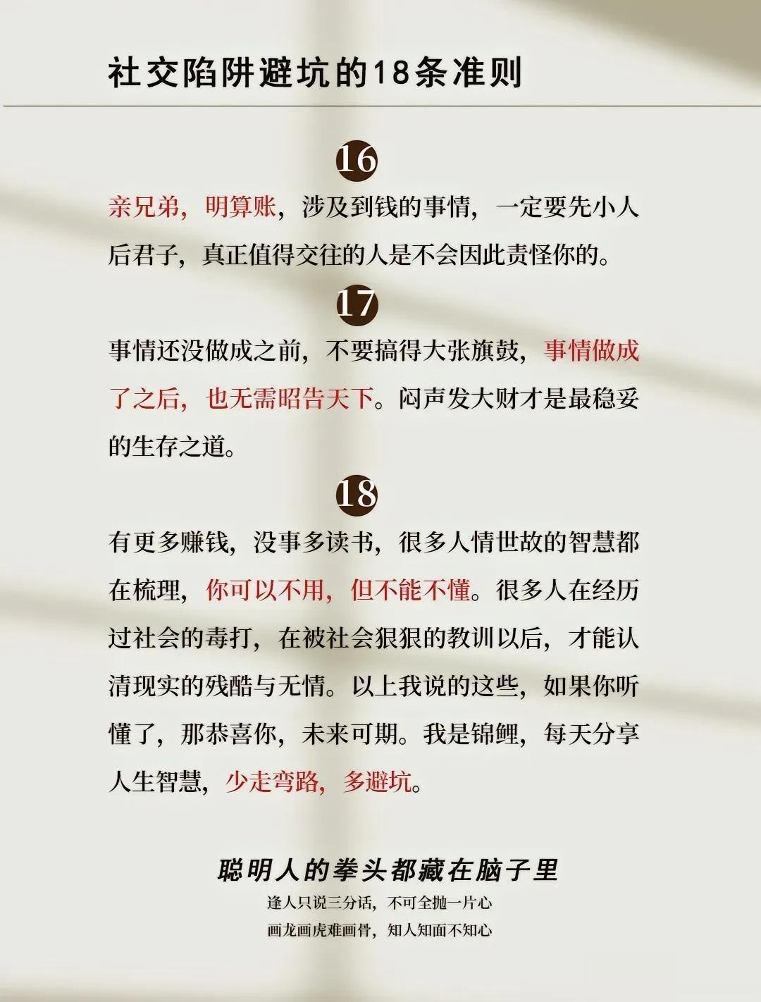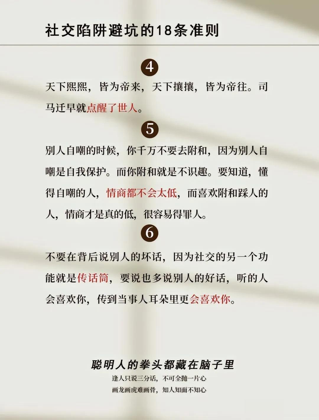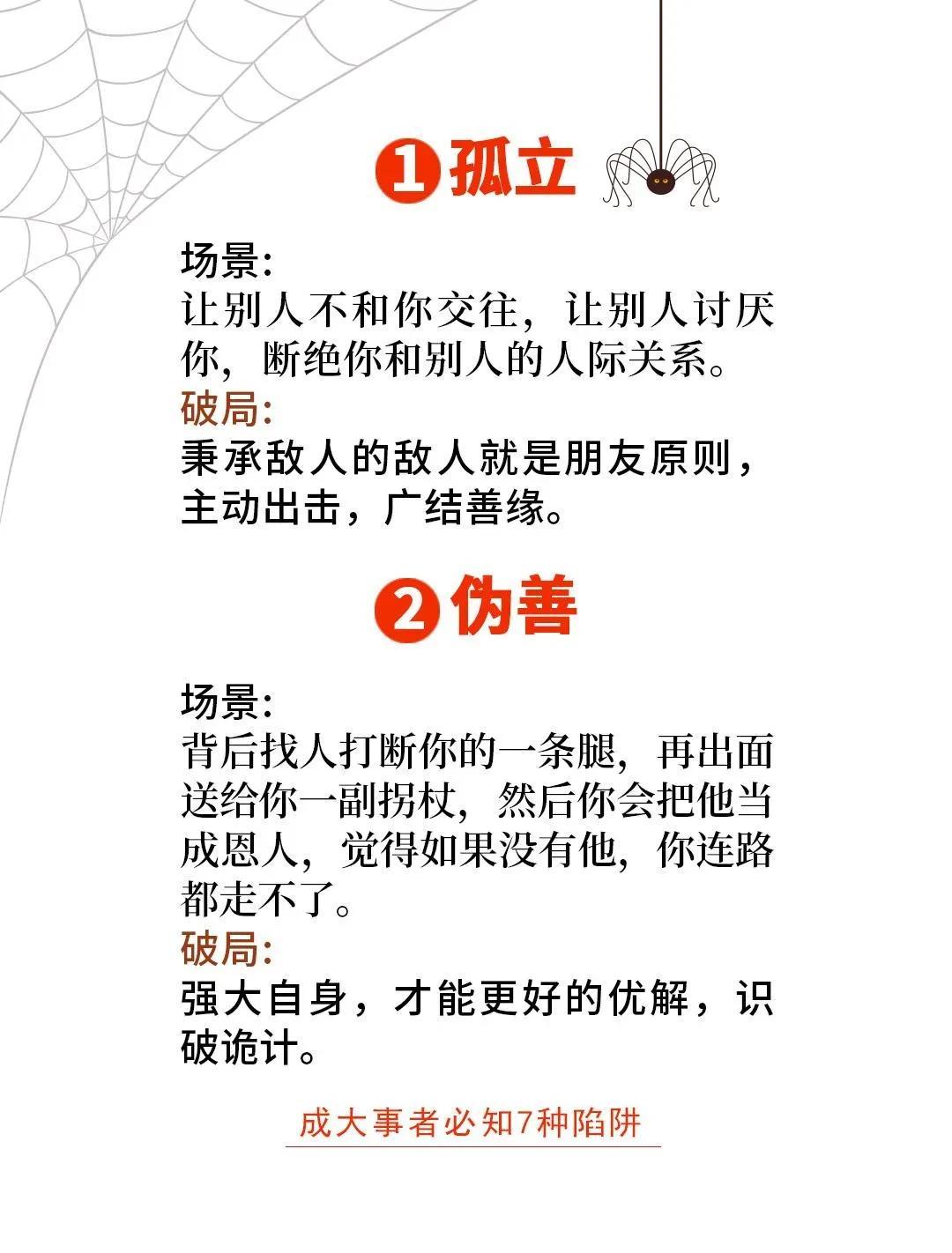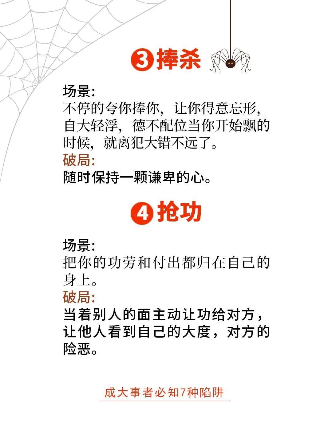 天哪!到今天才明白,原来那些能成功的人都懂观人、识人,看透人心的本事,早就对这七种社交陷阱和18条避坑准则烂熟于心了,看完以后,真的让人醍醐灌顶。不得不说很扎心但很常见,我们要提升洞察世事人心的能力,社交是人脉,也是陷阱,千万别让复杂的社会关系害了你!赶紧学起来!让小人暗箭来发,便已夭折。 看懂了,让你少走10年弯路吧,尤其是年轻人,一针见血,句句诛心。 成大事者必知的社交陷阱: 逢人只说三分话,不可全抛一片心 画龙画虎难画骨,知人知面不知心 社交陷阱社交指南