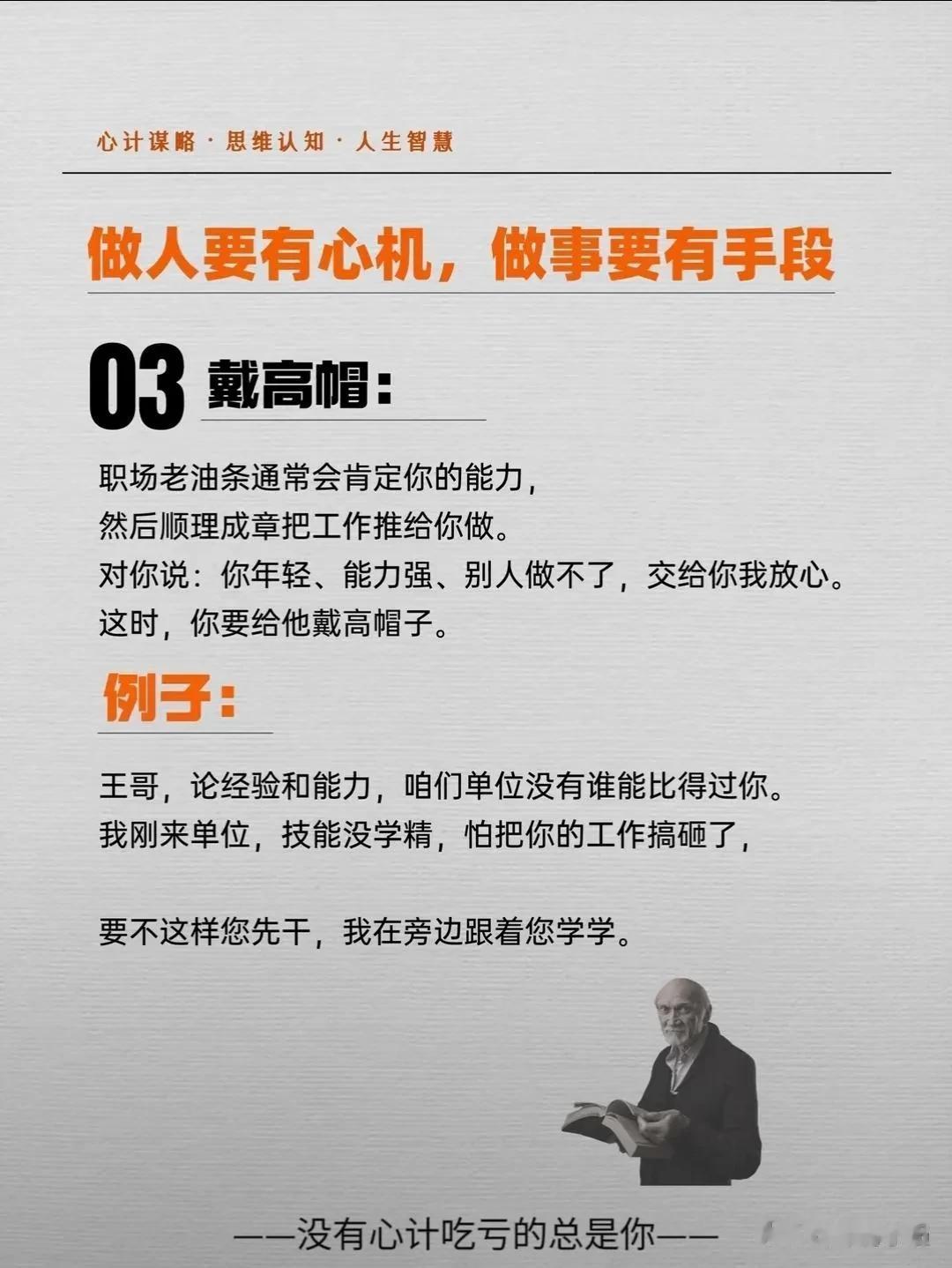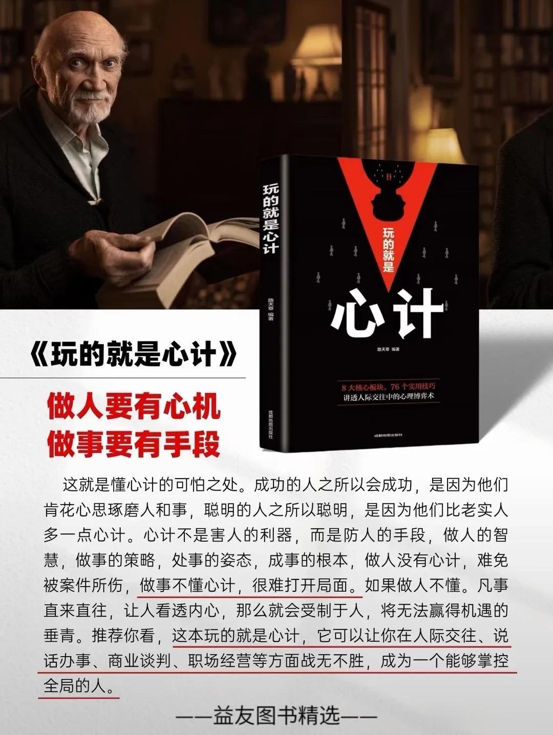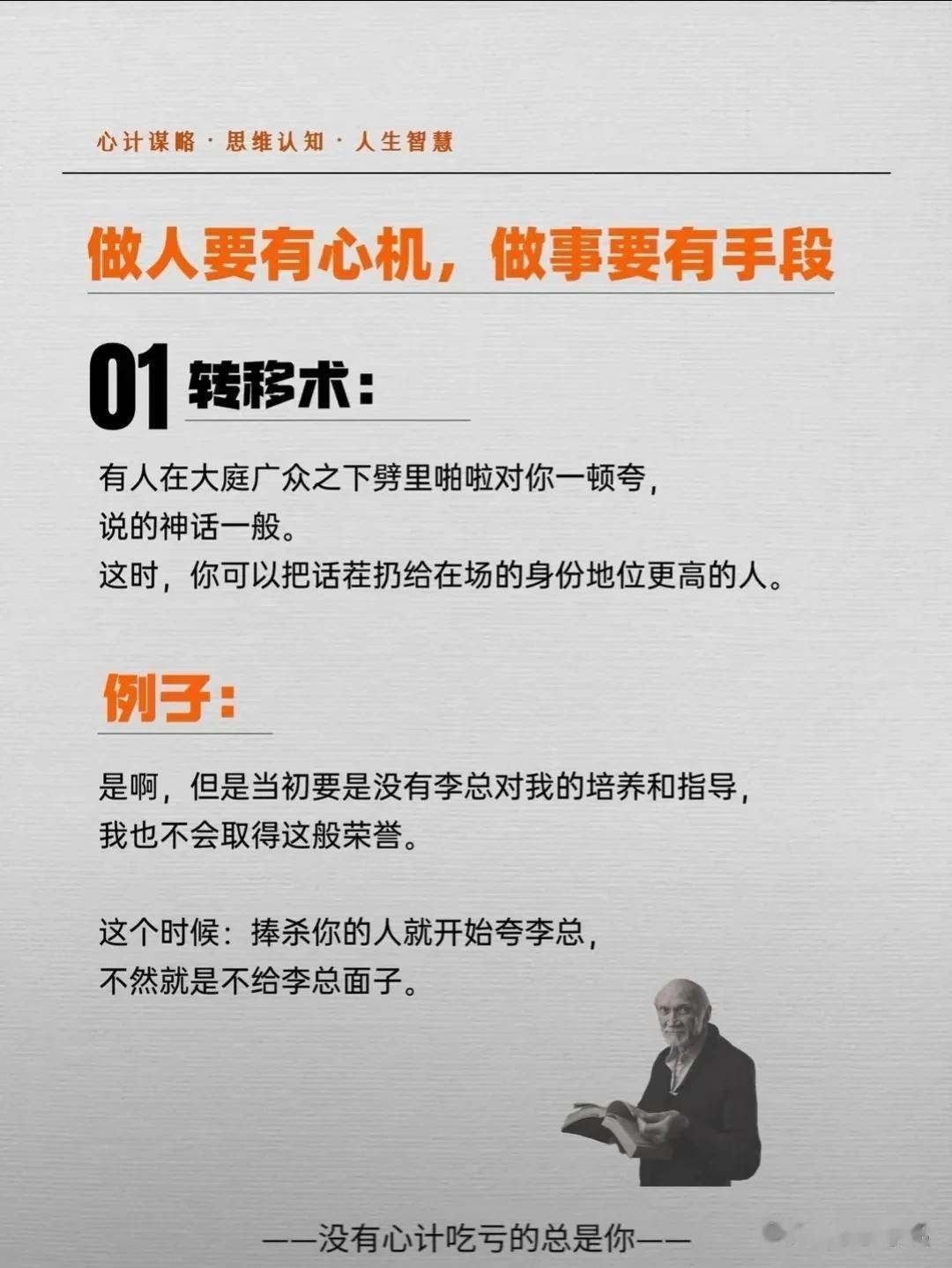 一位混迹于职场多年的老领导直言:没有心计吃亏的总是你,做人要有心机,做事要有手段,被人捧杀3招轻松回击,学会悟透了,才能在各种人生场合中左右逢源,游刃有余。这才是真正的高手手段,赶紧学起来! 一个人之所以被人拿捏,是因为你完全不懂心计,从而陷入别人为你设计好的陷阱当中而不自知。许多时候,学会变通,才能立于不败之地。 心计不是害人的利器,也可以是防人的手段。它可以让你在人际交往、说话办事、商业谈判、职场经营等方面战无不胜,成为一个能够掌控全局的人。 心计人际交往心理学