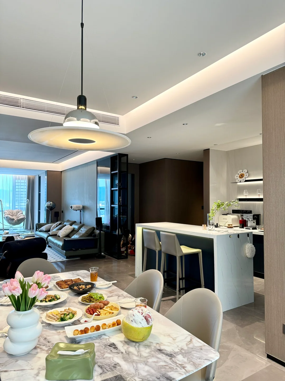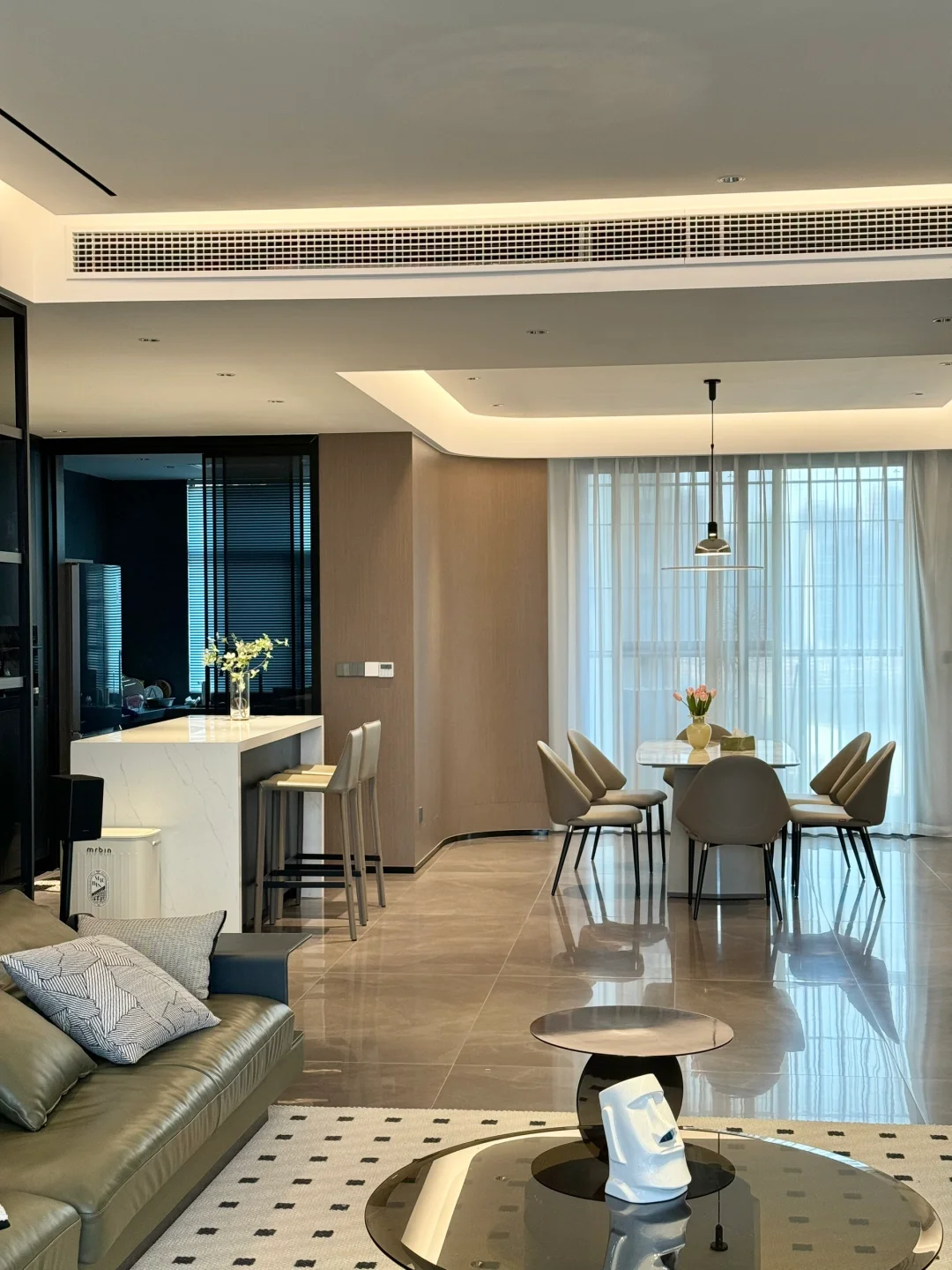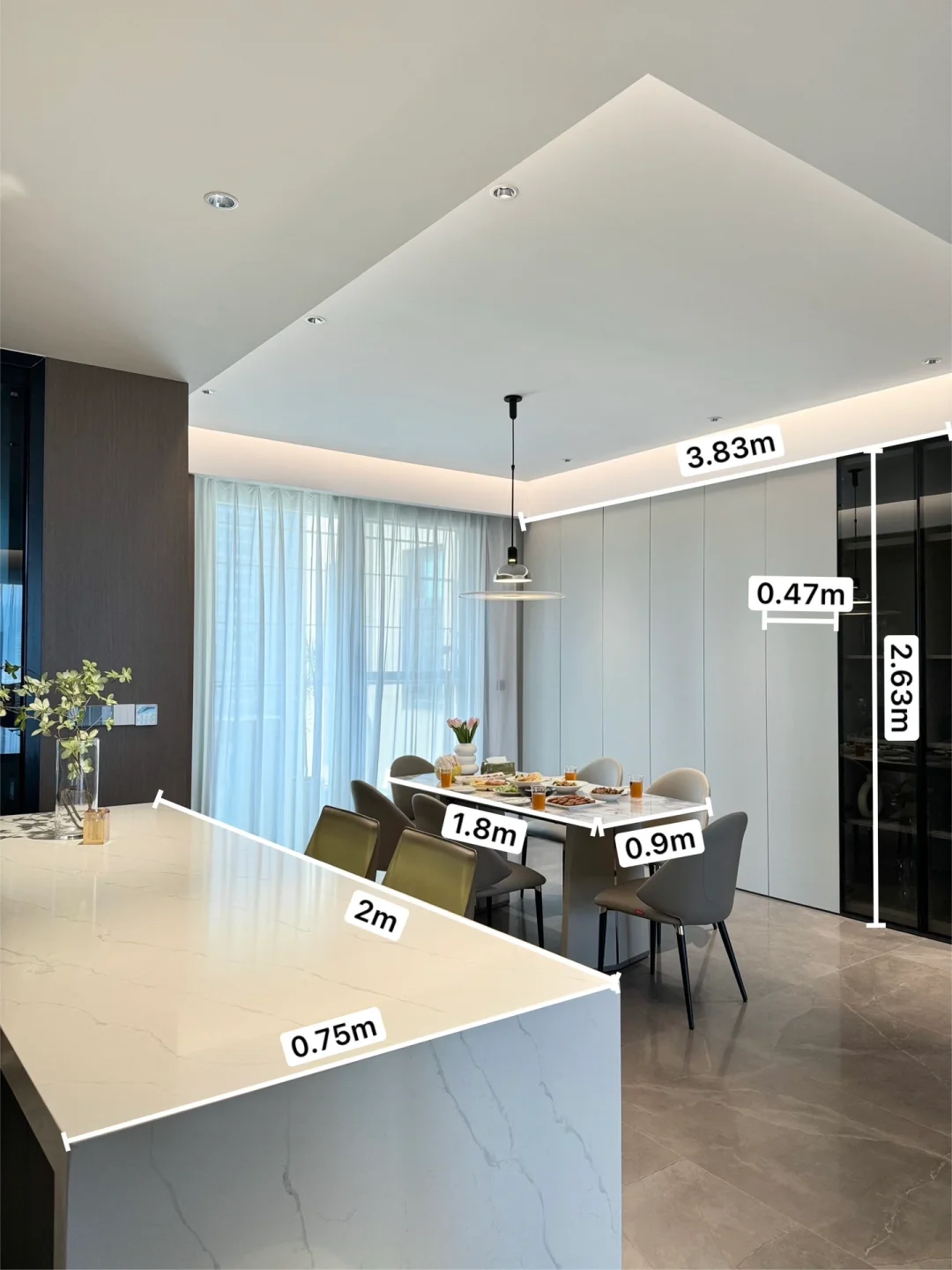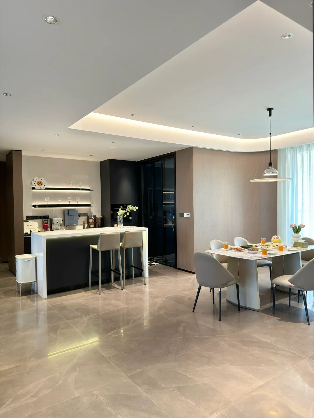 ✅餐厅与水吧台、岛台一体结合,显得餐厅的空间不拥挤。