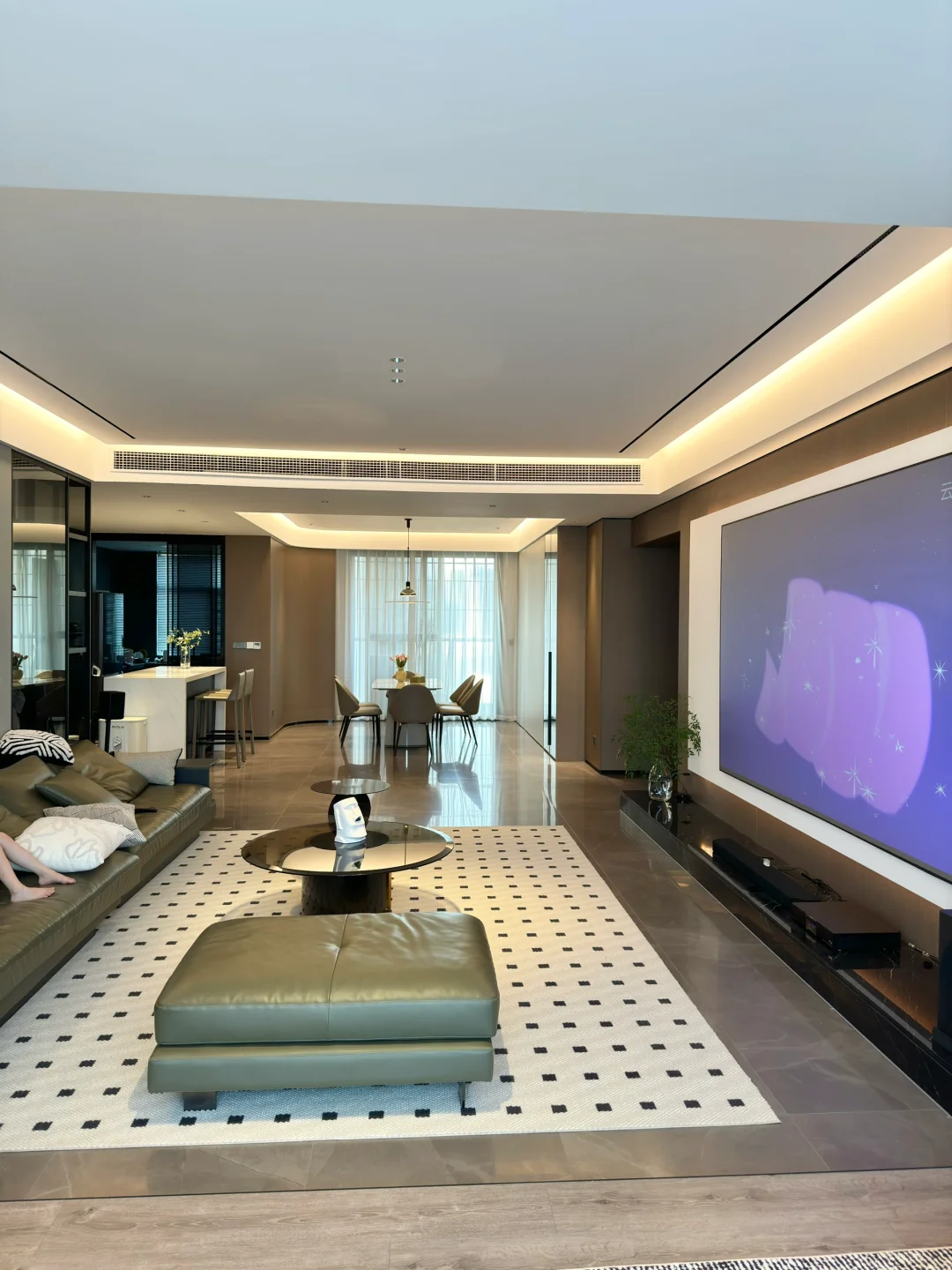 ✅客餐厅阳台一体 竖厅真的显大。打通后客厅面积变大视野更加开阔,阳台抬高10厘米做了地台,安上氛围灯带,有悬浮感觉