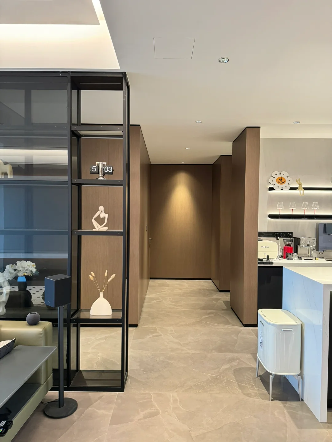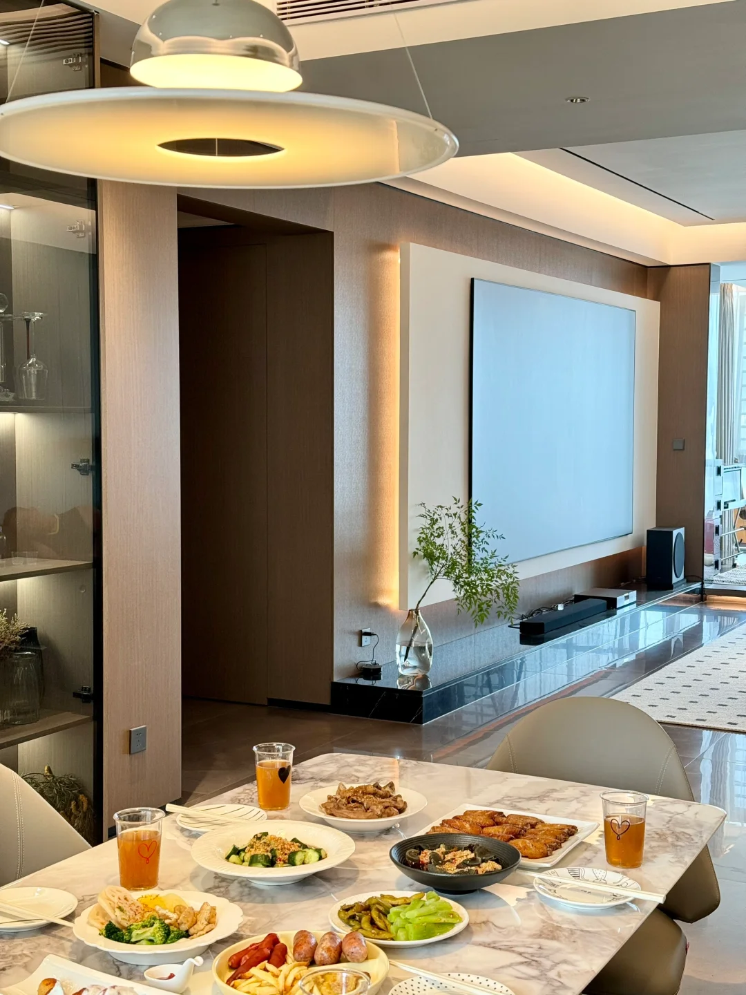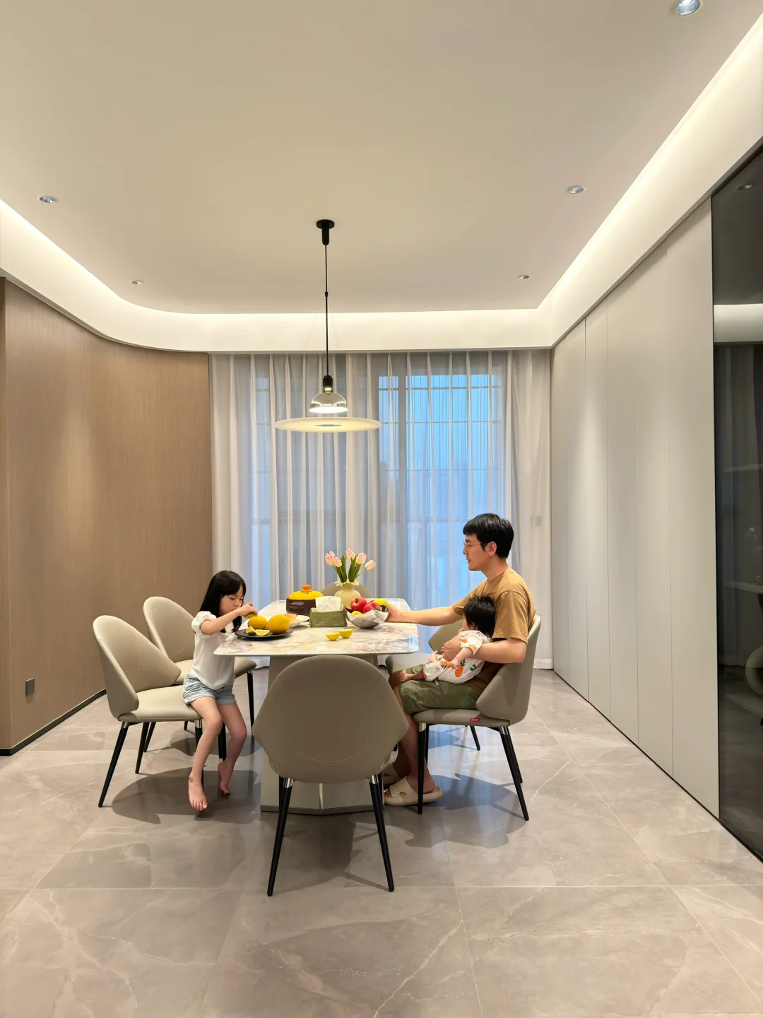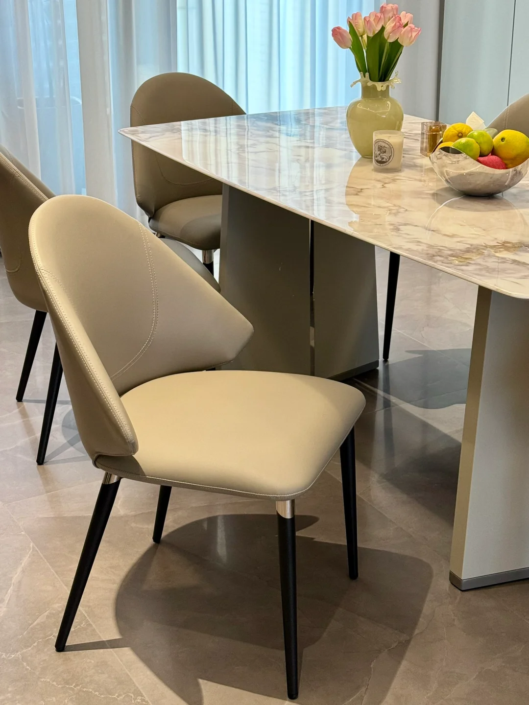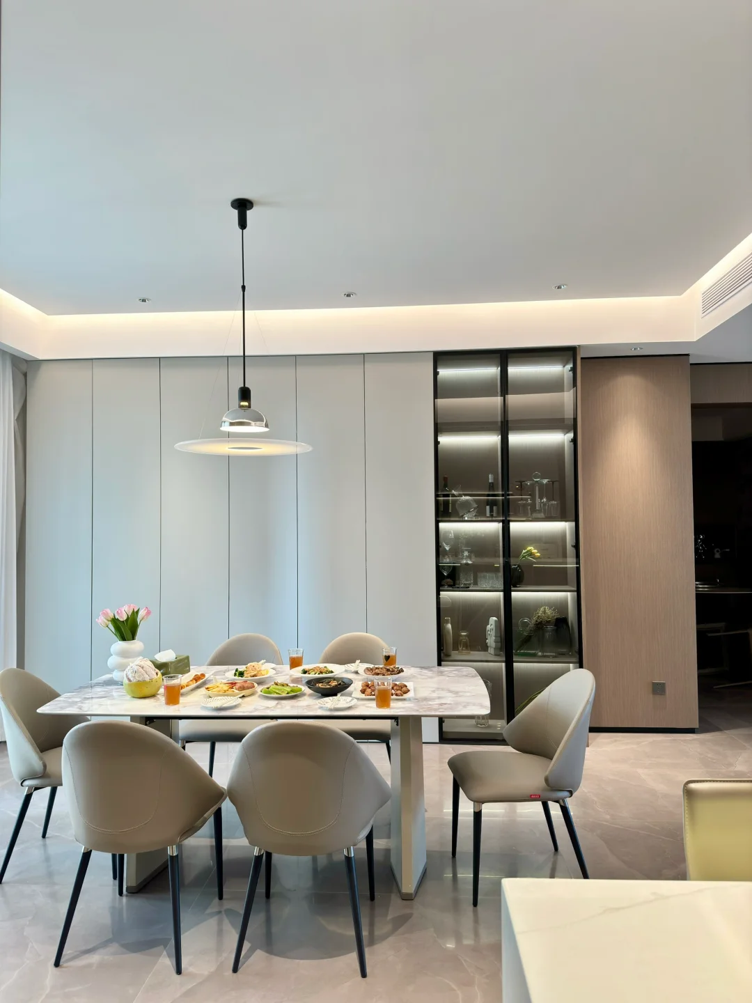 餐客厅装修的是意式极简风,棕白咖灰的颜色组成,线条感比较重。之前用的岩板圆桌,总觉得台面实在太薄了,岩板餐桌是真不耐用,也不太好打理。无意间看中这款顾家无界餐桌椅是我想要的款式,桌面是北冰洋大理石纹理很高级,跟网图看到的一模一样,非常搭配我家餐厅的风格。