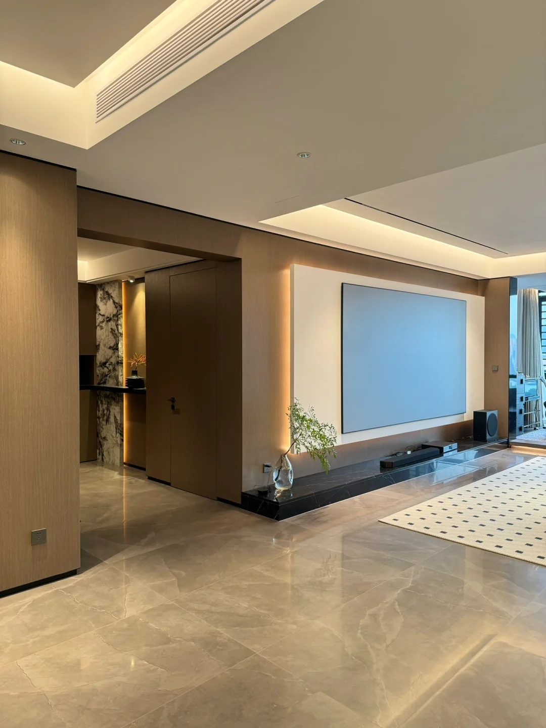 ✅简约低成本电视背景墙,石膏板刷乳胶漆,挂上133寸大幕布,四周一圈灯带,打造出氛围感很强的家庭影院