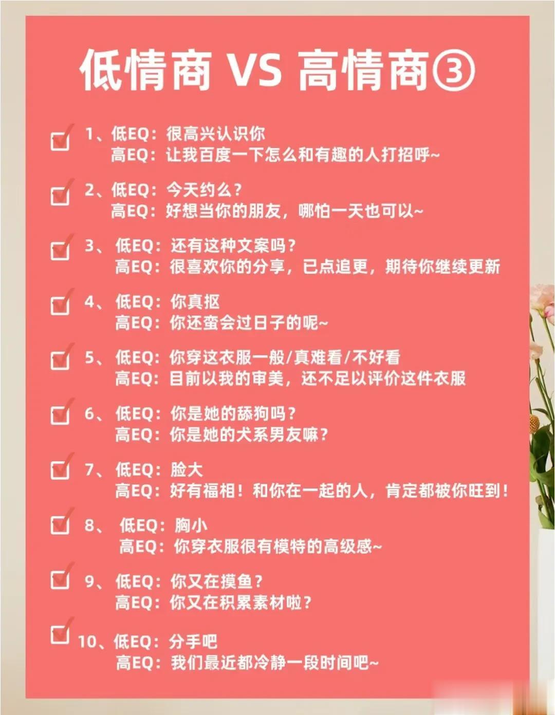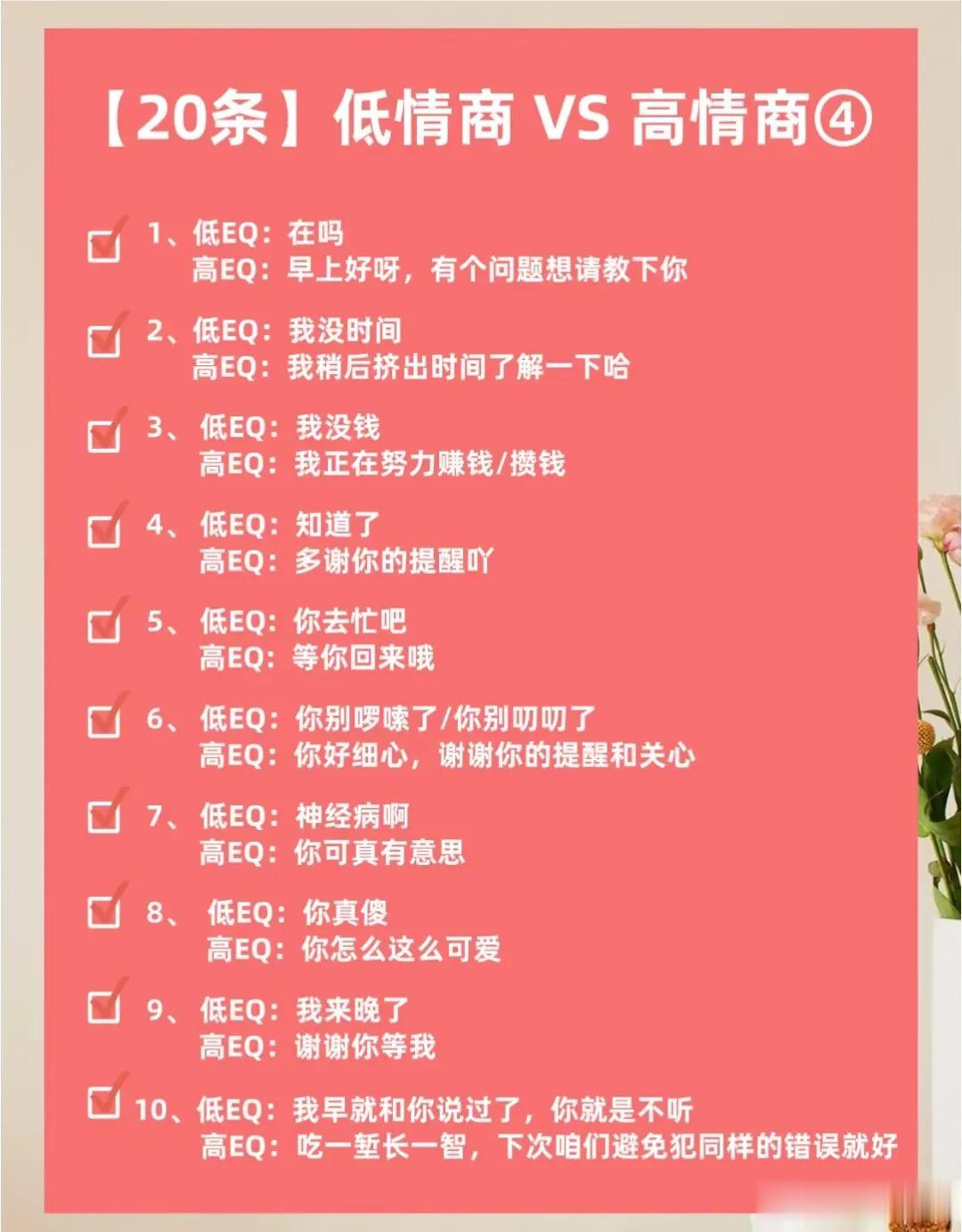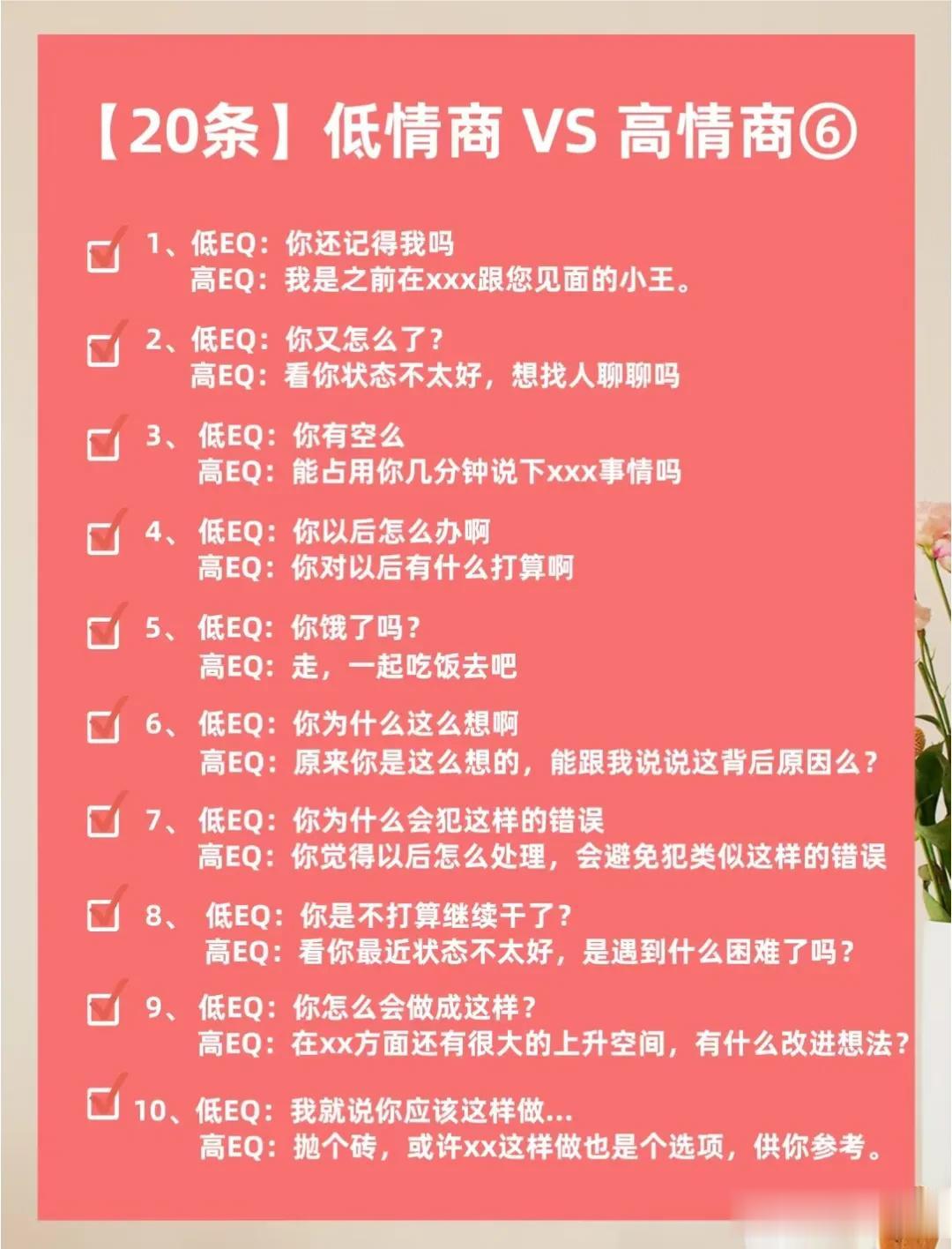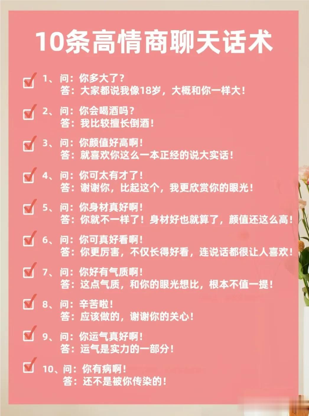 不得不佩服大佬们的说话水平,看完低情商VS 高情商的话术,你就明白,高情商会说话的人运气不会太差,更容易成功!一位高手整理的50条高情商话术以及30个职场高情商小细节,让你化腐朽为神奇,成为高情商大军中一员!掌握了这条秘诀,你的人生将迈向新的台阶! 高情商聊天术