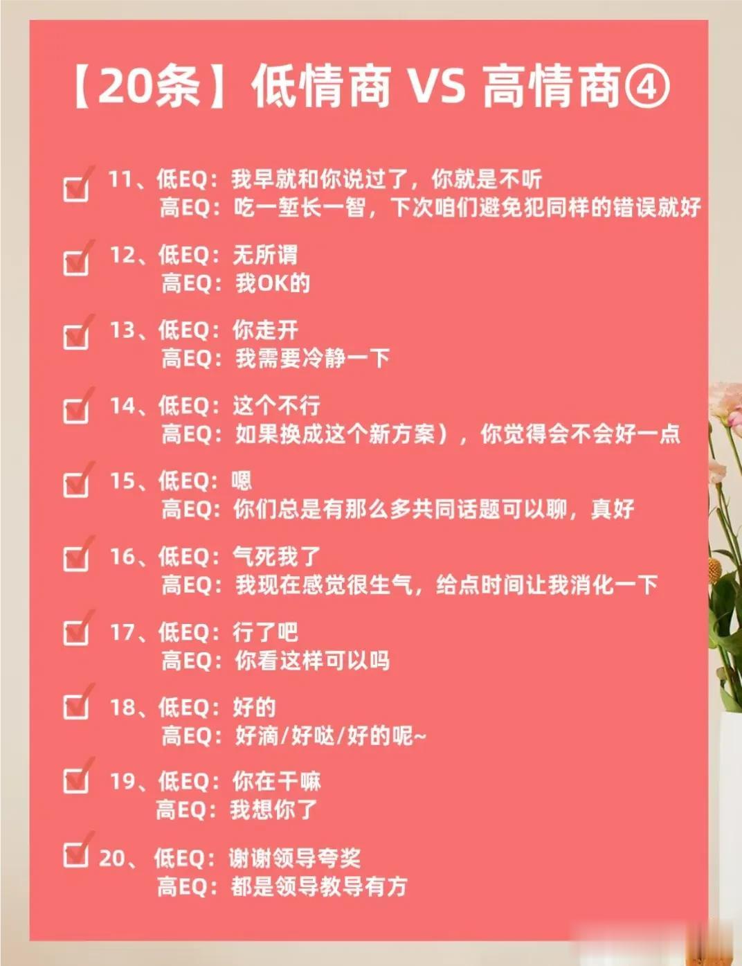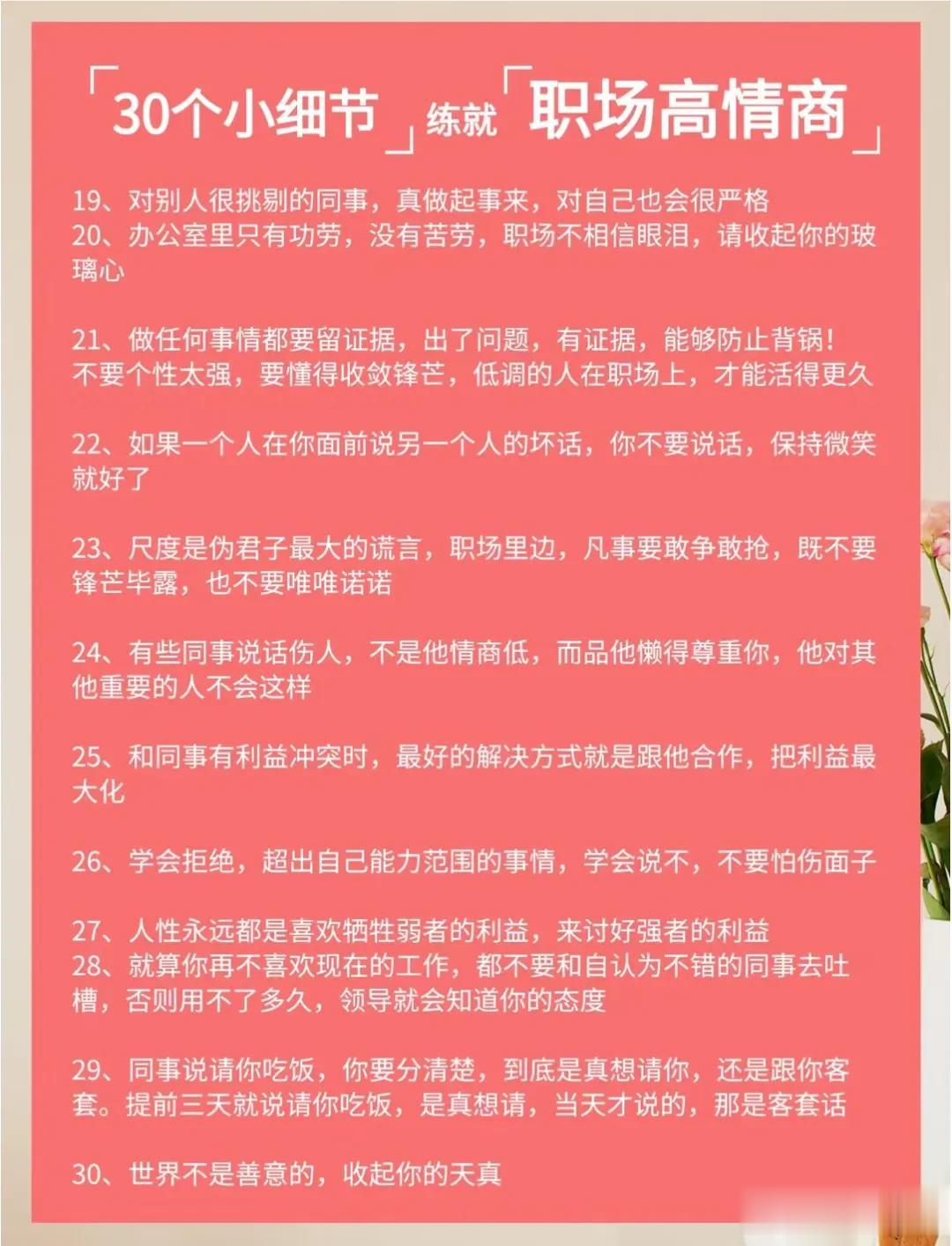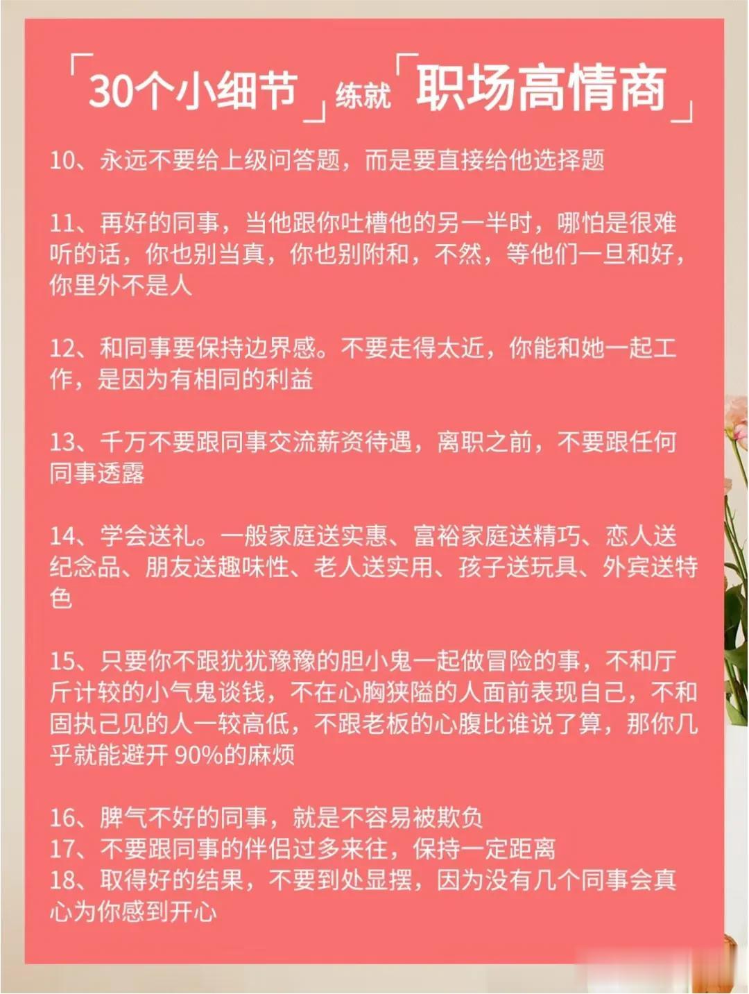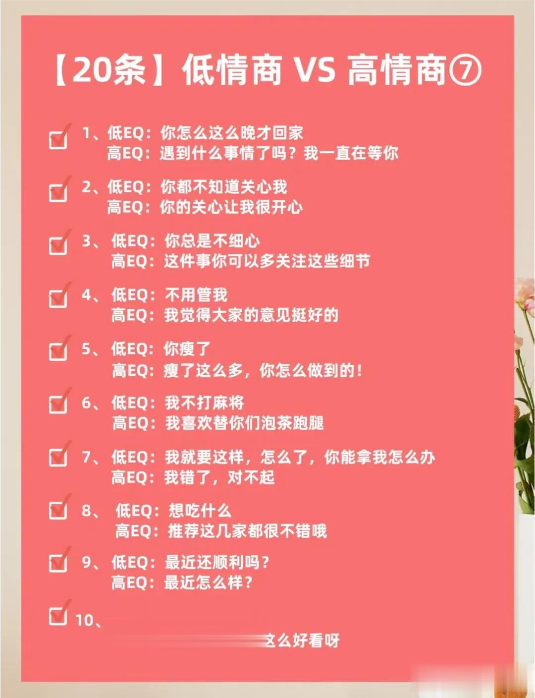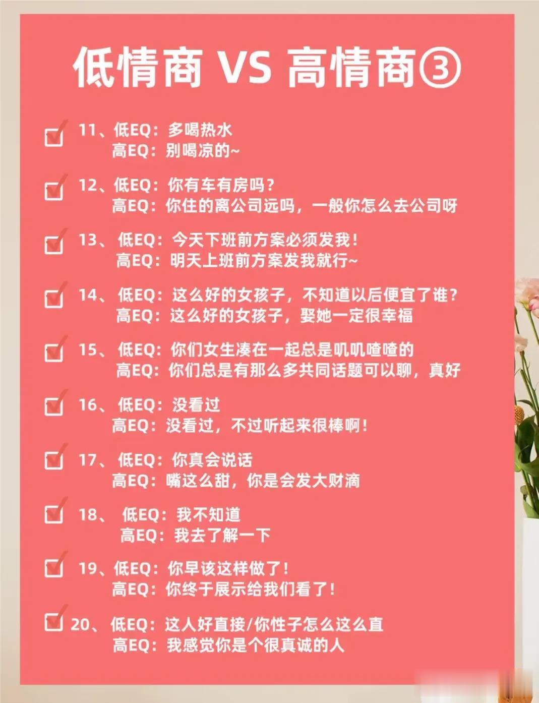 不得不佩服大佬们的说话水平,看完低情商VS 高情商的话术,你就明白,高情商会说话的人运气不会太差,更容易成功!一位高手整理的50条高情商话术以及30个职场高情商小细节,让你化腐朽为神奇,成为高情商大军中一员!掌握了这条秘诀,你的人生将迈向新的台阶! 高情商聊天术