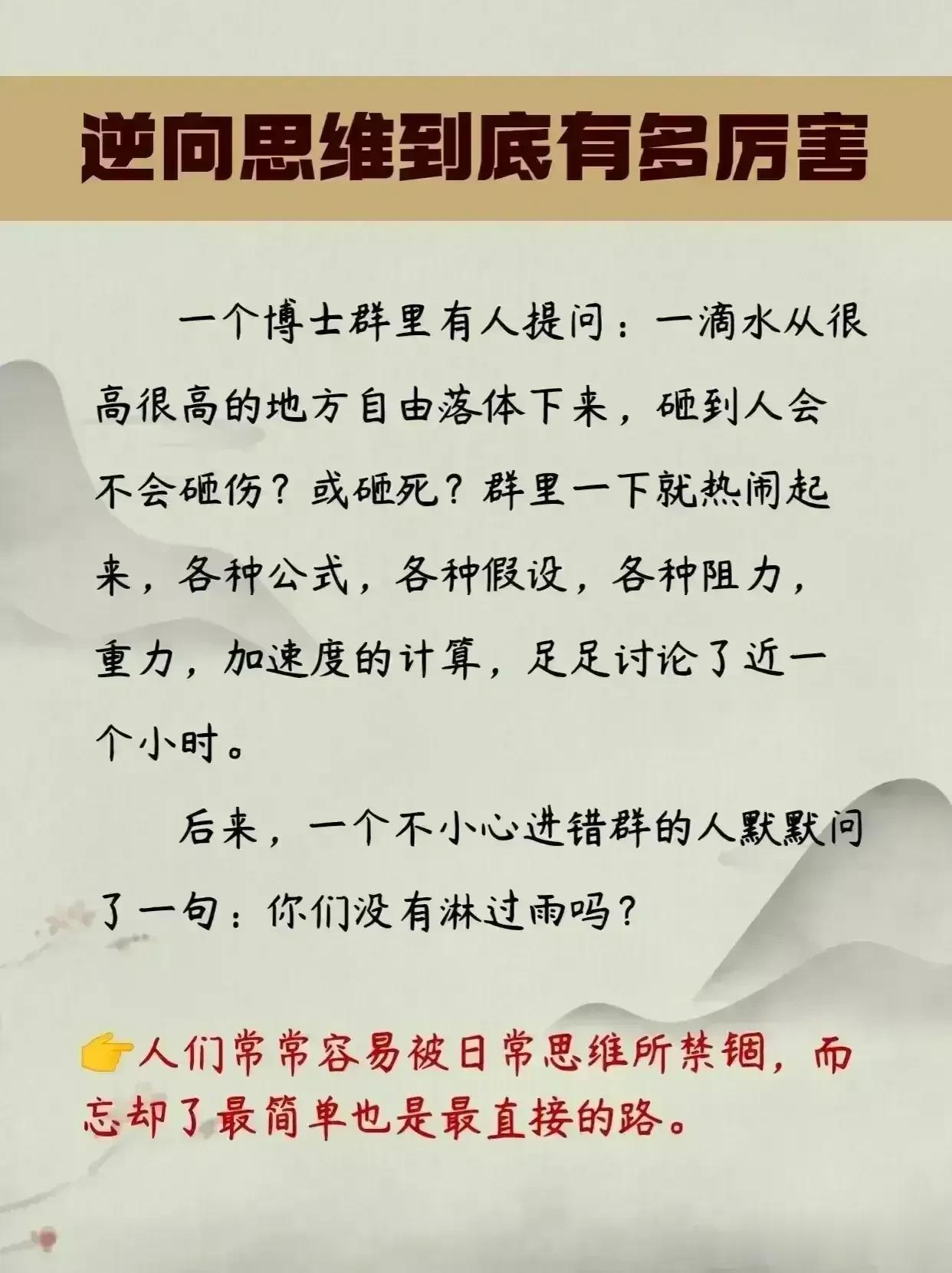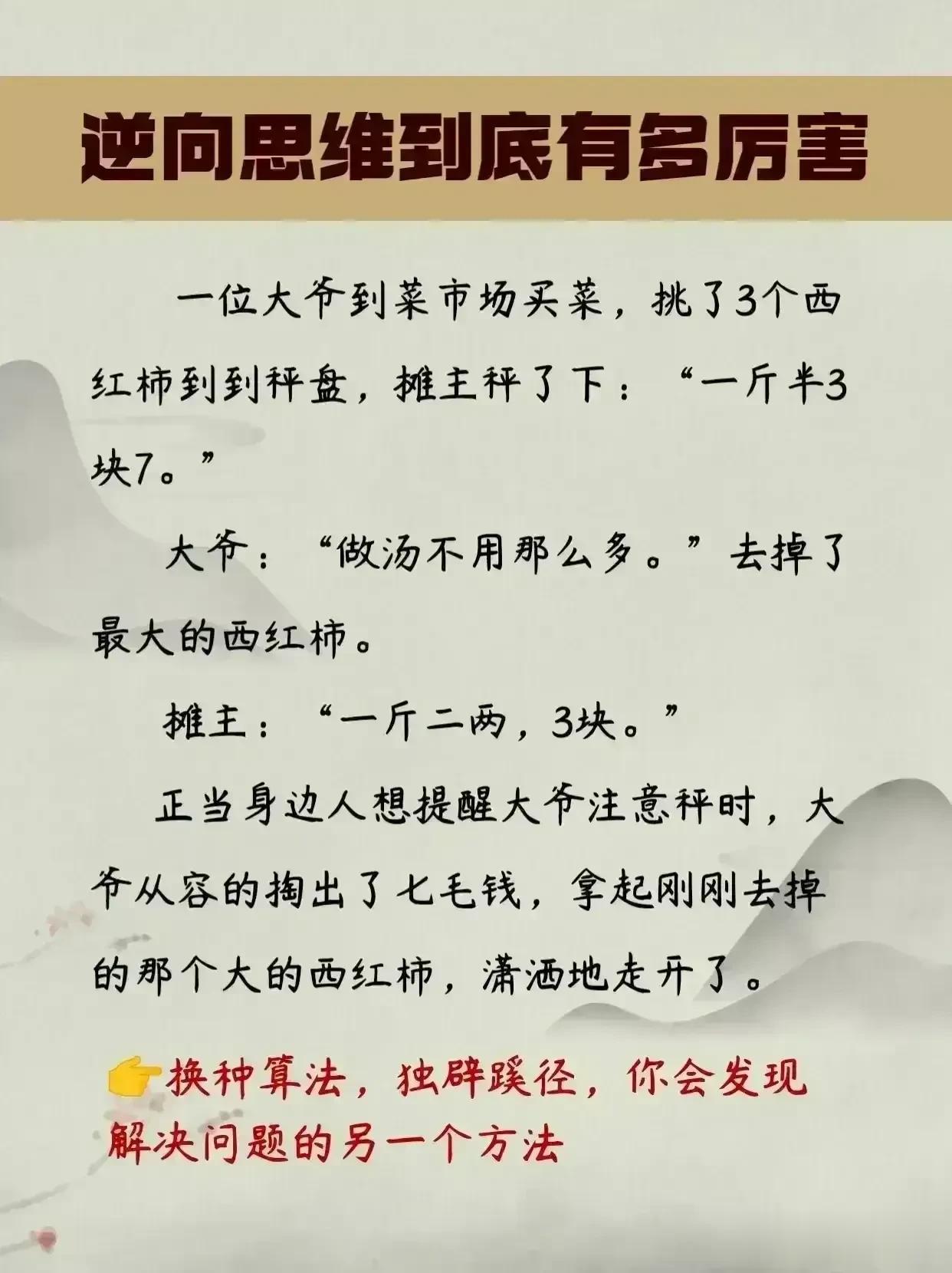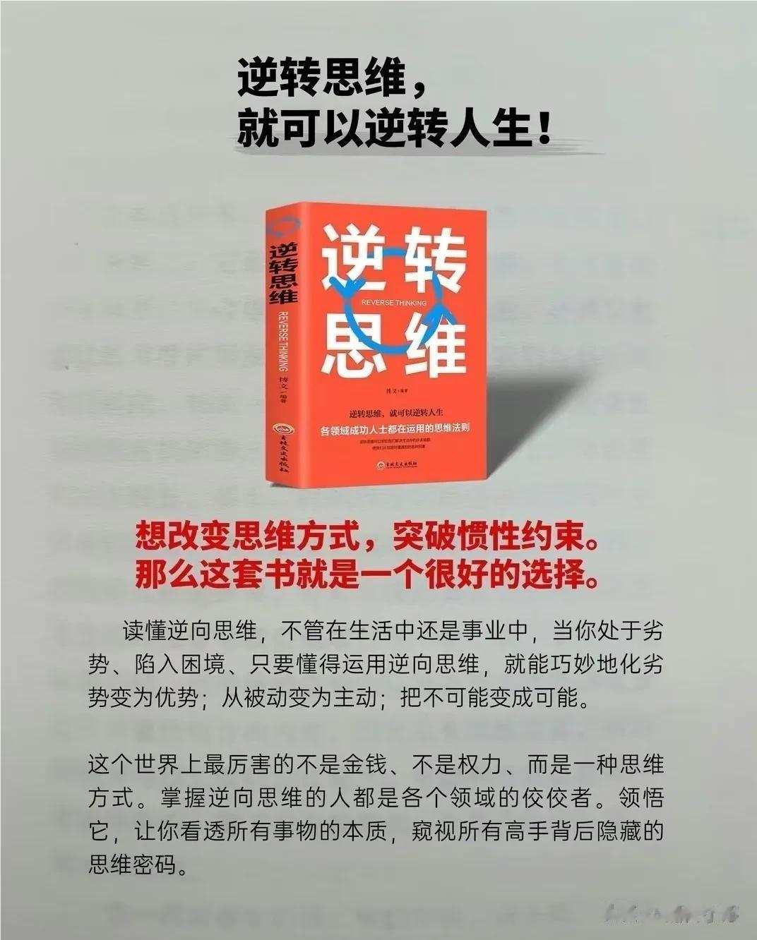 我的天哪!这是我见过最牛的逆向思维操作,看完这15个小故事,瞬间清醒,原来真正优秀的人通常都具备这种思维方式,逆境也能成机遇,困境也是出路,把所有问题看得通透,做起事来无往不胜,从而轻松解决麻烦,达成自己的目的。简直是太厉害了! 逆转思维是一种重要的思考能力,当正向思维行不通时,要善用逆转思维,才能轻松解决很多难题、困惑!想改变思维方式,突破惯性约束。那么这套书就是一个很好的选择。赶紧学起来!学会了足以让你逆袭人生。 逆转思维思维训练