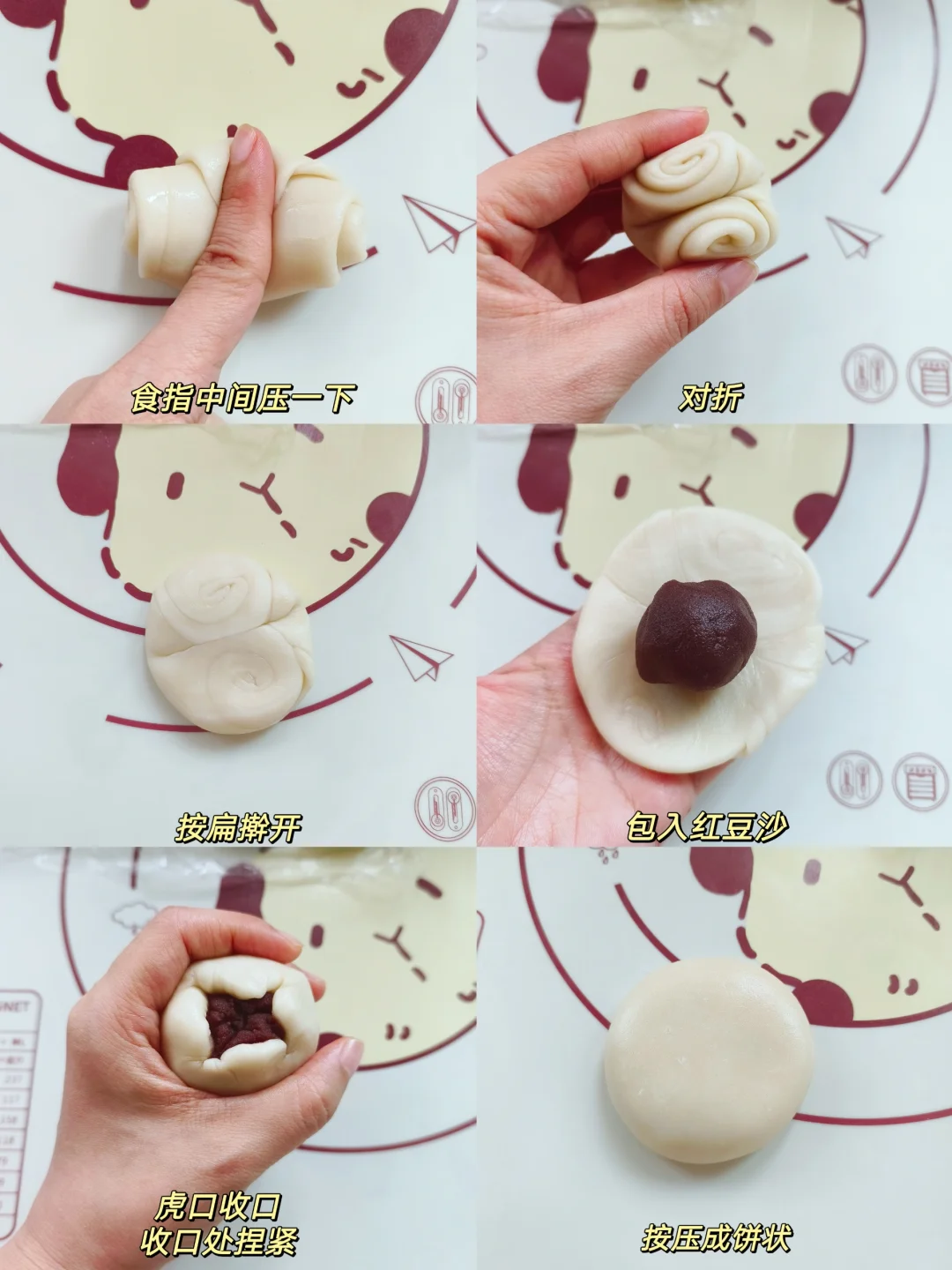 [八R]取一个松弛好的面卷,食指按压面卷中间,让面卷对折,压扁擀成圆形,包入馅料,收口处捏紧,按压饼状。
