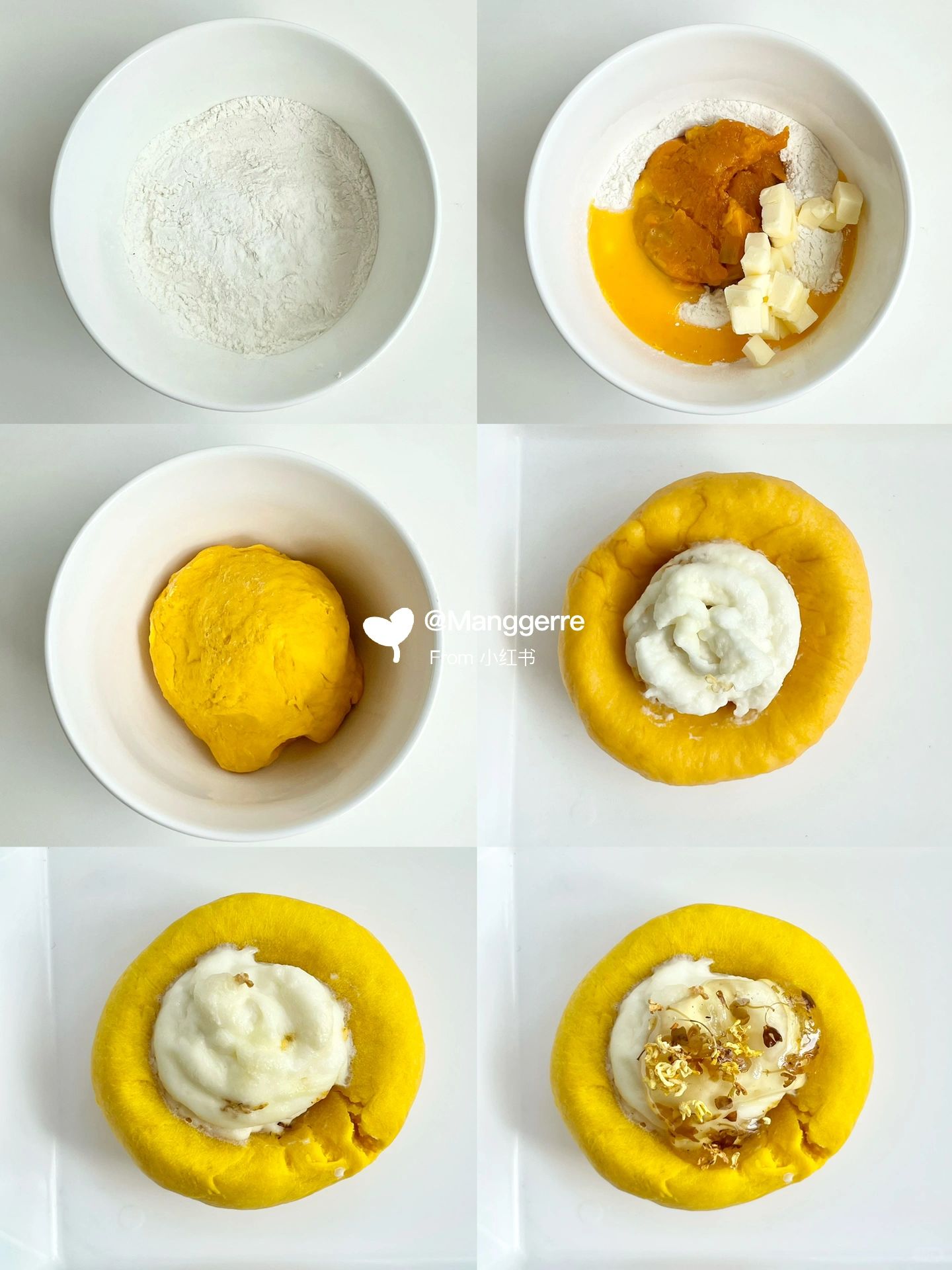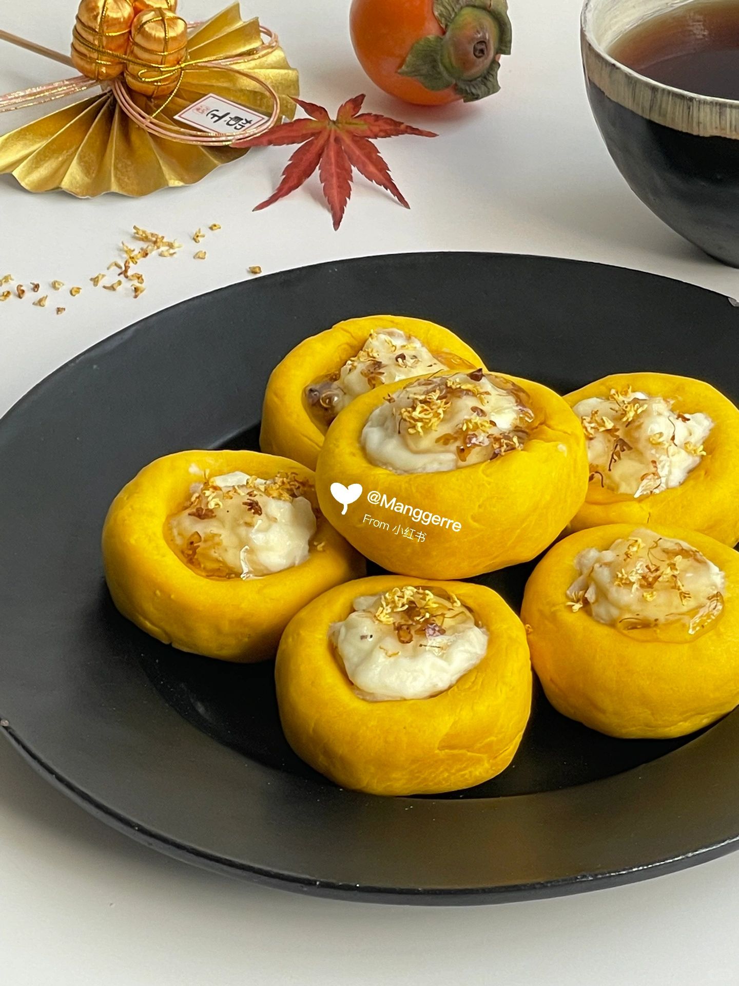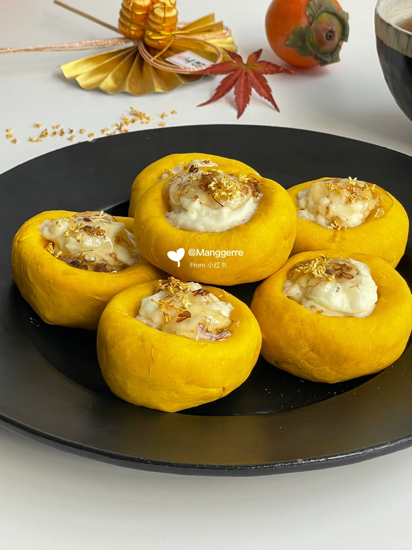 今日分享桂花香气浓郁的 奶酪酒酿司康🎃 搭配咖啡☕️就是一份美味芳香早餐~~ 🧡【食材】: 低筋面粉150g、泡打粉4g、糖25g、黄油30g、 南瓜泥100g、蛋液15g(根据面团湿度添加面粉) 奶油奶酪100g、玉米淀粉15g、牛奶50g、糖20g、干桂花 🧡【做法】: 1、奶油奶酪、玉米淀粉、干桂花、牛奶、糖一起加入搅拌均匀至膏状放入裱花袋冷藏 2、面粉、泡打粉、南瓜泥、糖、黄油、蛋液一起搅拌均匀成面团 3、把面团分成50g每个的小面团,中间加入奶酪桂花内馅 4、烤箱190度30分钟左右即可、桂花蜜装饰