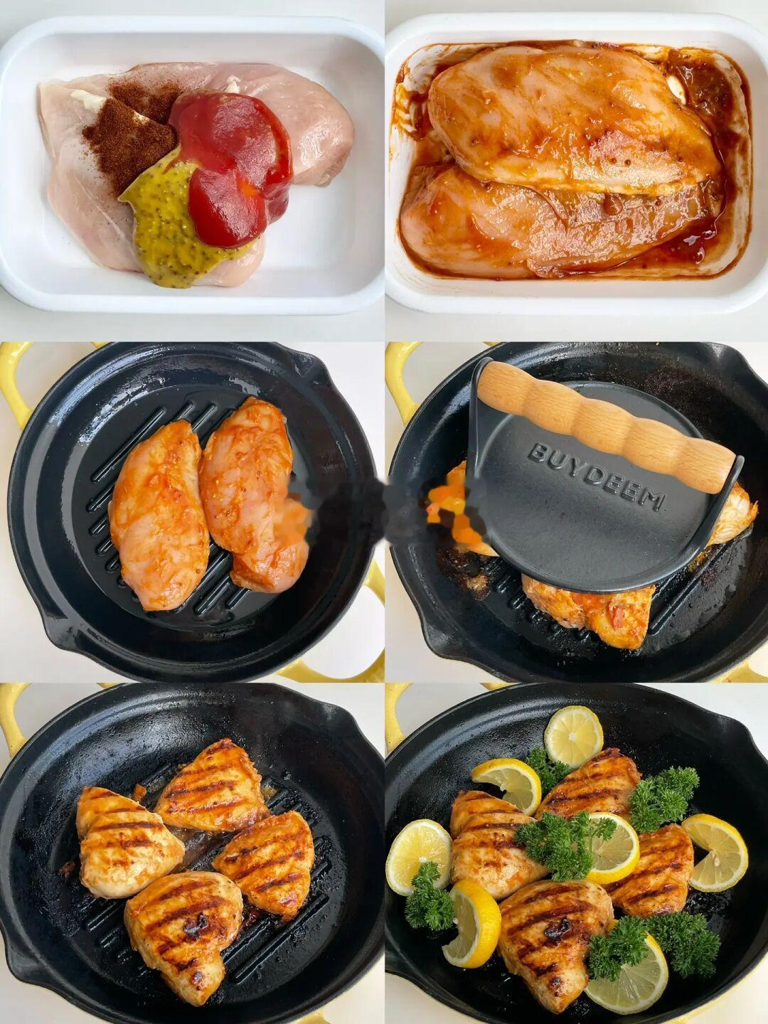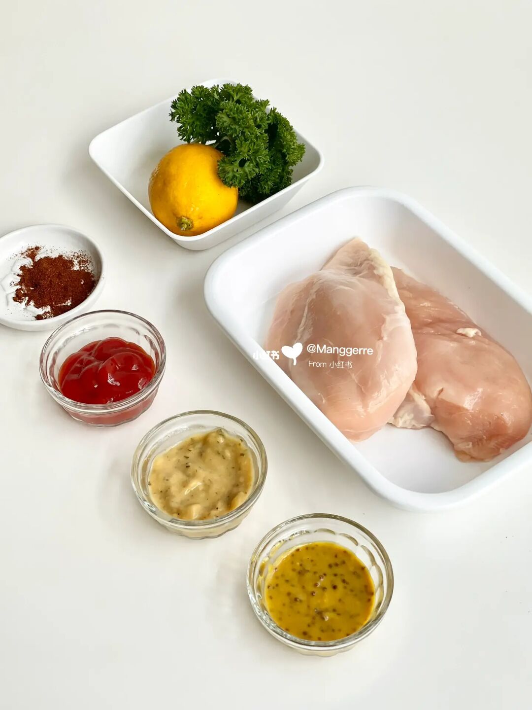 鸡胸肉2块、番茄酱2勺、芥末酱2勺