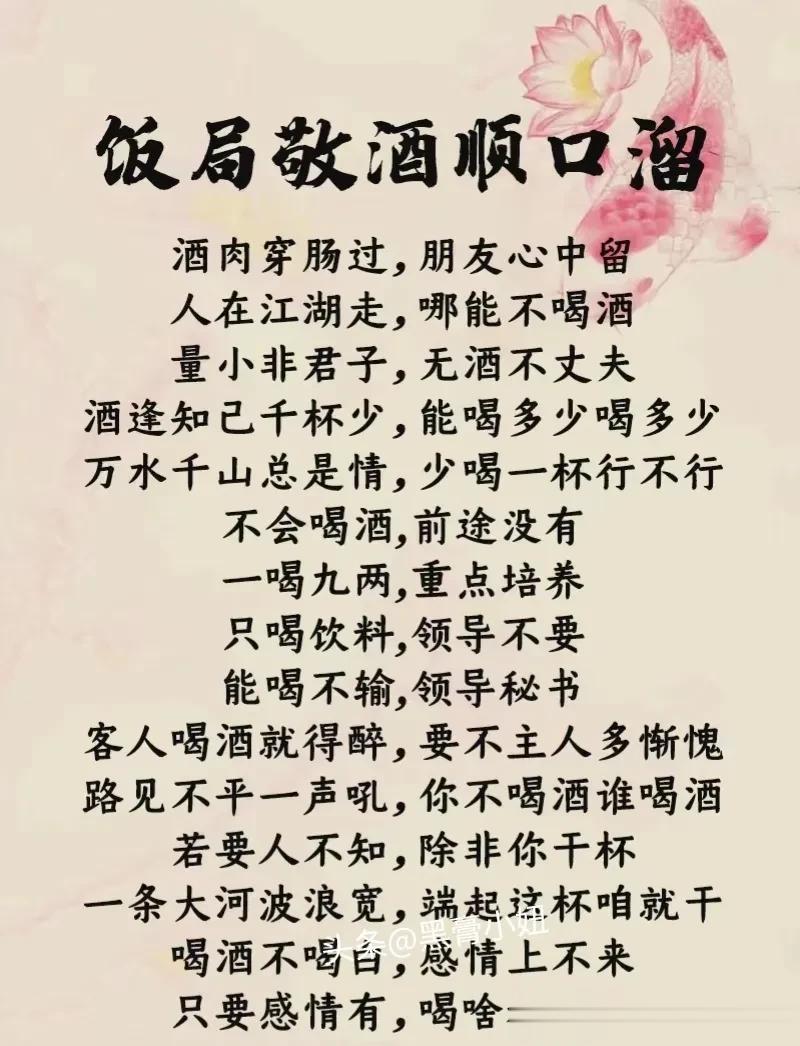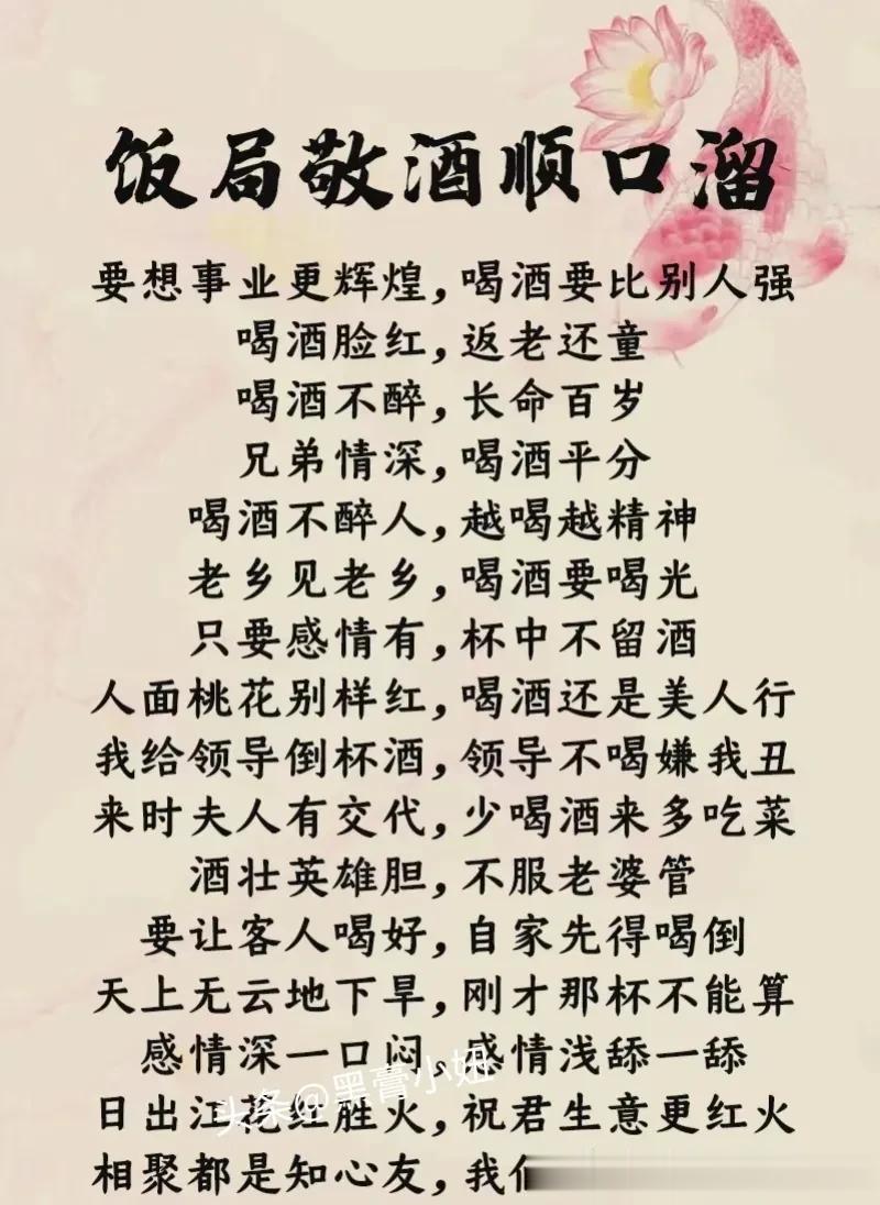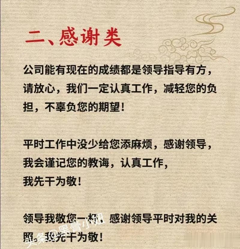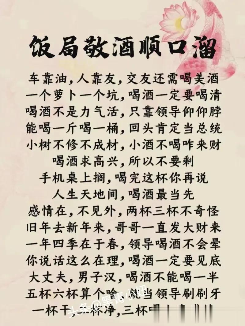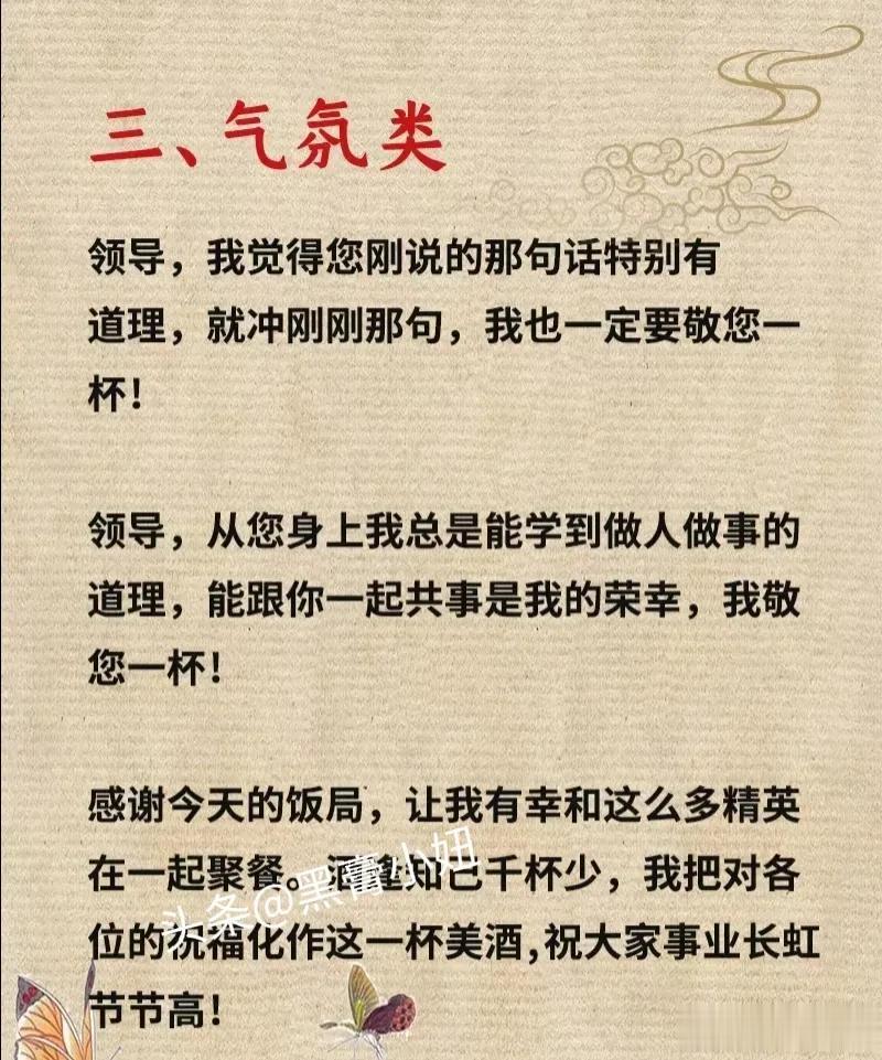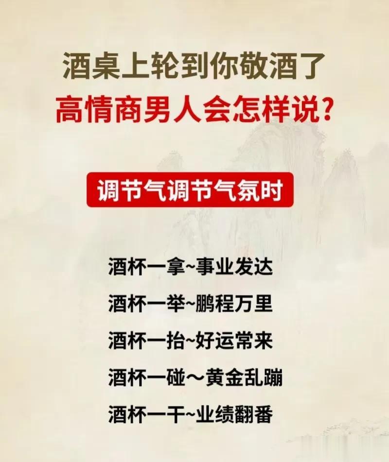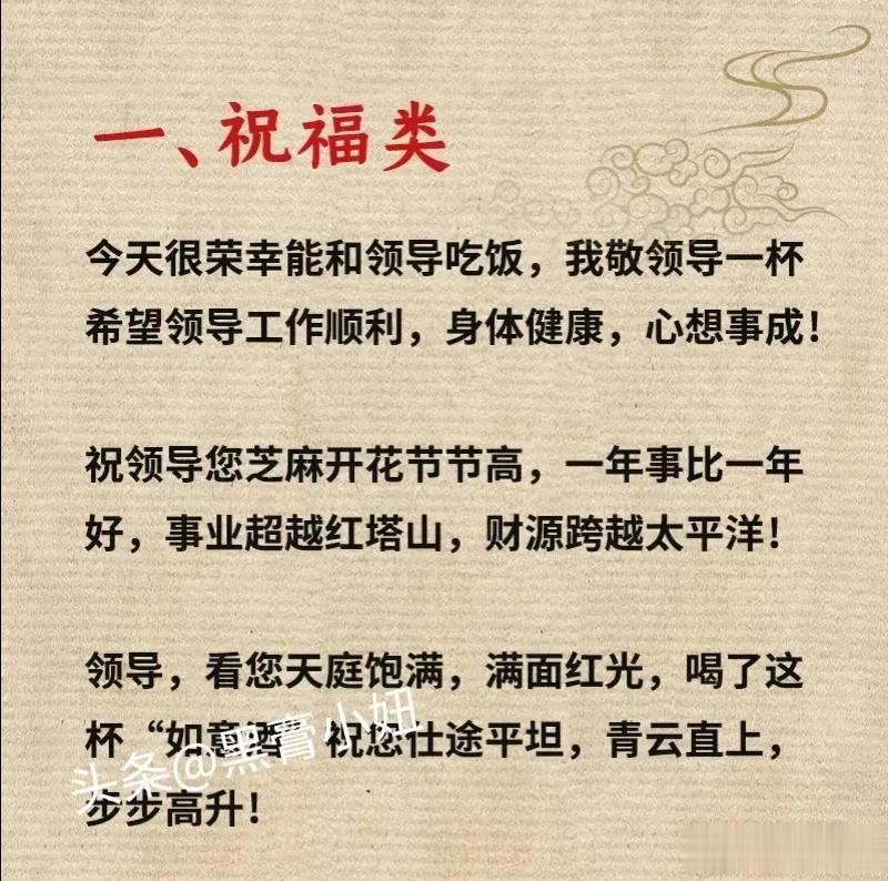 这是我见过整理最全的敬领导祝酒词模板,还有饭局敬酒顺口溜、拒酒词等等,背下来,提升你的口才,抓住成功的机会,让你成为饭桌上最靓的仔!据说,那些酒局中混得好的人,早已经对这些敬酒词倒背如流了!赶紧收藏保存下来!每天看一看,应酬不发愁! 不要小看任何一场看似普普通通的饭局,一场饭局交际的结束,正是一份人情流动的开始,提前掌握,方能处变不惊,从懂得饭局礼仪开始,什么点菜方式,酒水选择,如何劝酒,如何拒酒,赶紧下方链接系统的学起来! 饭局的艺术祝酒词