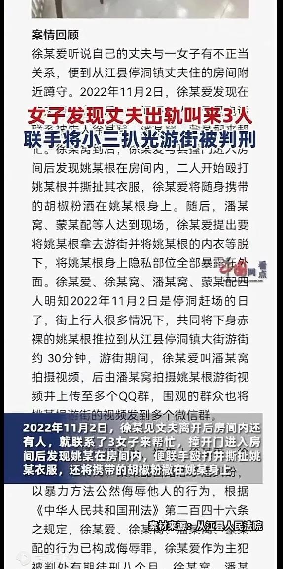 丈夫出轨小三,妻子带一群人找到小三扒光后游街示众,并拍视频发到网上炫耀!法院判决表示:妻子该行为构成侮辱罪!判处有期徒刑八个月! 之前在22年时,贵州发生一起丈夫出轨,妻子带人将小三游街示众的视频。当时妻子得知自己的丈夫出轨小三的事实,便带着三四人,蹲点守着丈夫的出租屋内,果然发现有小三在里面。 当时街道热闹非凡,妻子便同这三四人一起把小三扒光后,游街示众。但是游街示众可能并不能让妻子发泄心中的愤怒,便又叫人拍下视频后,发到网上炫耀一番,似乎想达到以儆效尤的效果。 警方得到消息后,将该涉事人员妻子等人抓获,本身丈夫出轨小三,妻子是受害者。但由于妻子的处理方式过于偏激,而成为了加害者,因侮辱罪被判处了有期徒刑八个月。