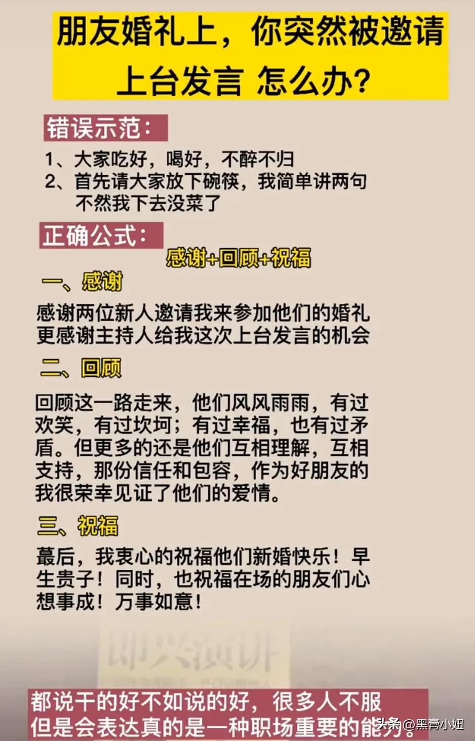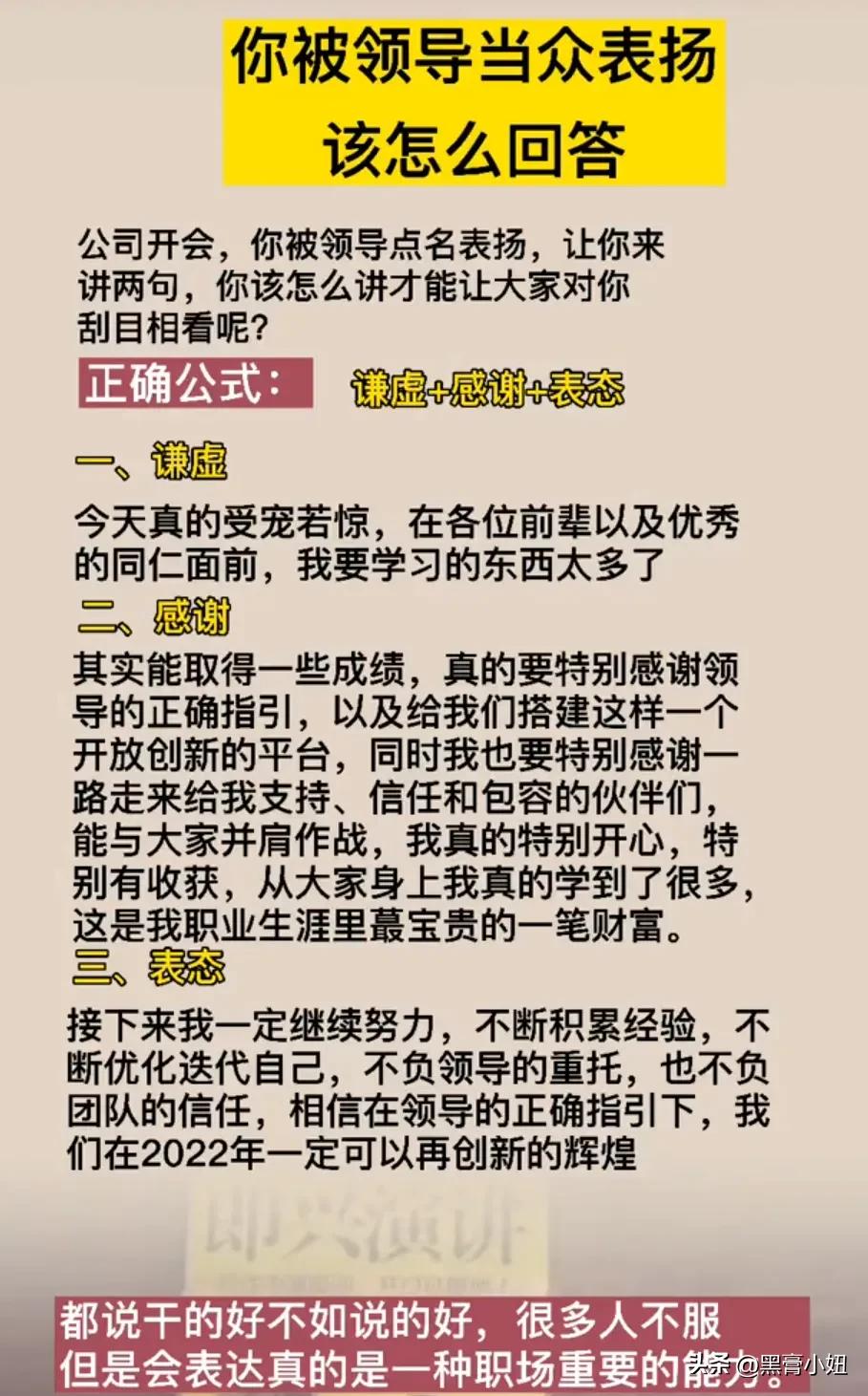 “太佩服了”!原来那些上台演讲的高手,早已经对发言公式倒背如流了,比如,在公司的晨会上,你被老板点名汇报工作;在面试中,你突然被面试官要求针对某一问题发表一下见解;在参加婚礼的过程中,你被主持人叫起来现场表达一下祝福之情……牢记这些公式,直接往里套,让领导、客户、朋友都对你刮目相看,机遇大增!赶紧收藏! 生活中的大部分交流,都属于即兴演讲的范畴。在现代社会中,即兴演讲是每个人都会面临的难题。学会即兴演讲的方法,不管在什么场合下,升职加薪机会远远高于其他同事。 更多即兴演讲的技巧在下方看一看,职场人士可以多看看。 即兴演讲回话技术训练
