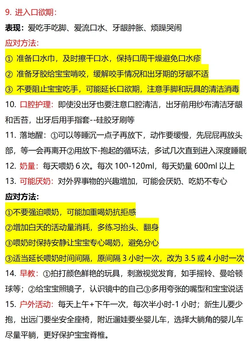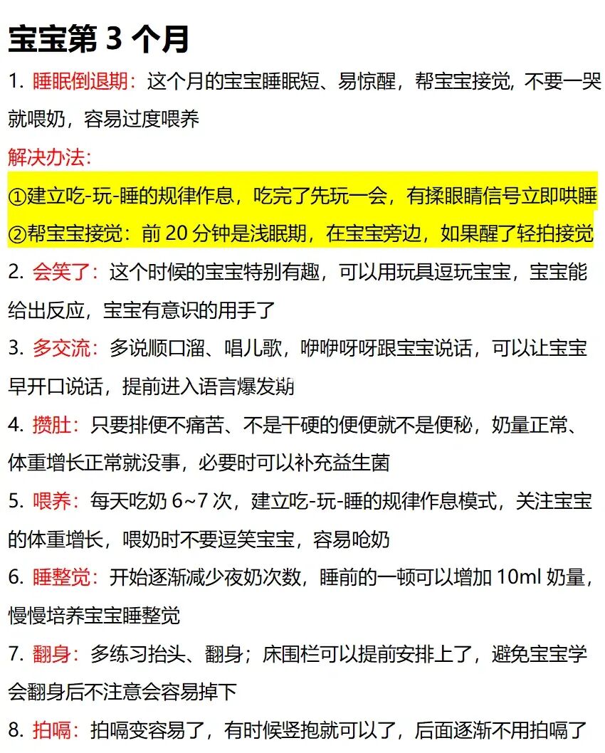 3⃣第3个月需要帮宝宝建立吃-玩-睡规律作息,让宝宝玩一会再睡。进入睡眠倒退期,会容易睡不长、惊醒,需要帮宝宝接觉。